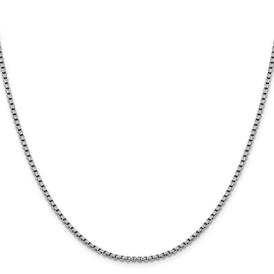 Classic 14K white gold round box chain necklace with a diamond-cut finish that adds subtle sparkle and shine. The sleek 2.4 mm width offers a clean, modern look that is perfect for everyday wear or pairing with a pendant. Crafted in solid 14K white gold with a weight of 5.36 grams. Length: 18 inches — a versatile and timeless chain suitable for layering or wearing on its own.