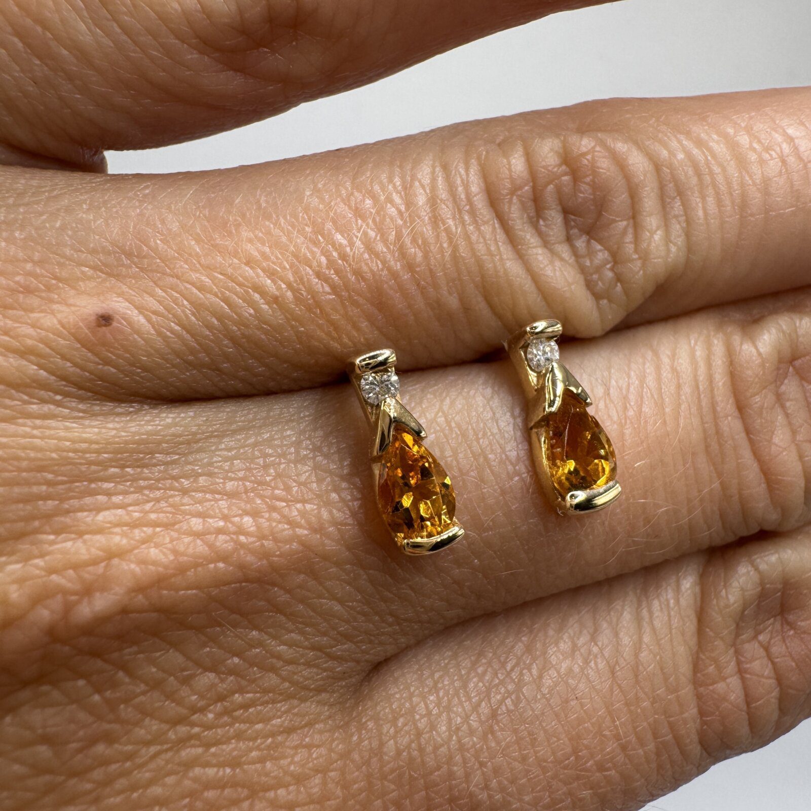 These elegant 14K yellow gold earrings feature pear-shaped citrine gemstones, accented by sparkling round diamonds. The warm golden hue of citrine paired with the brilliance of diamonds creates a timeless and sophisticated look, perfect for day-to-night wear.