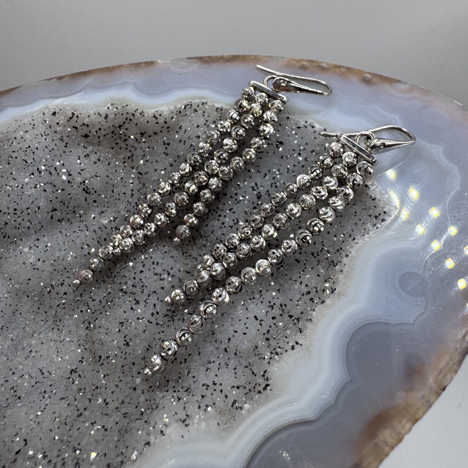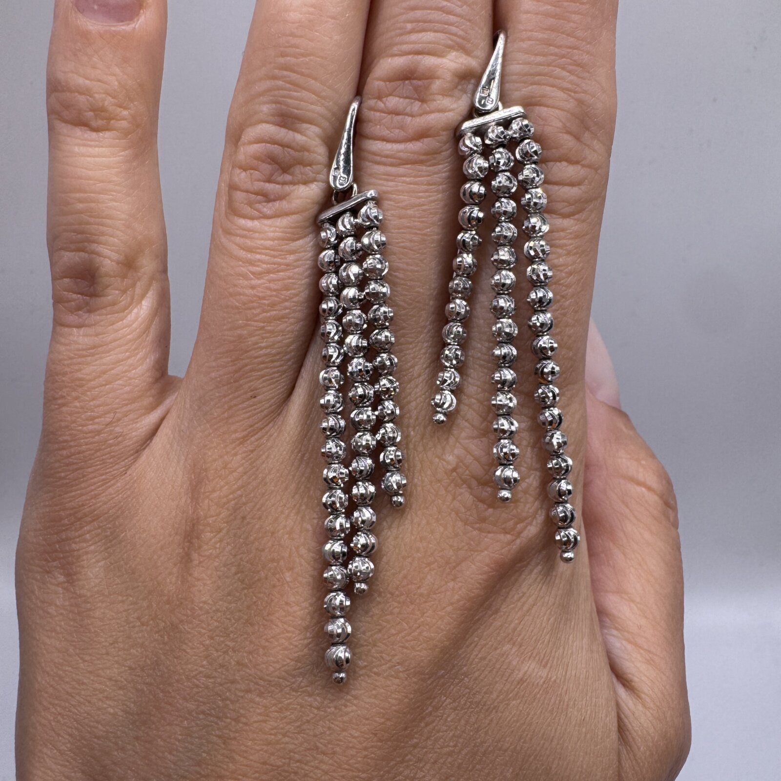 Sterling Silver 925 Dangling Earrings featuring cascading strands of diamond-cut beads for a sparkling, elegant finish.