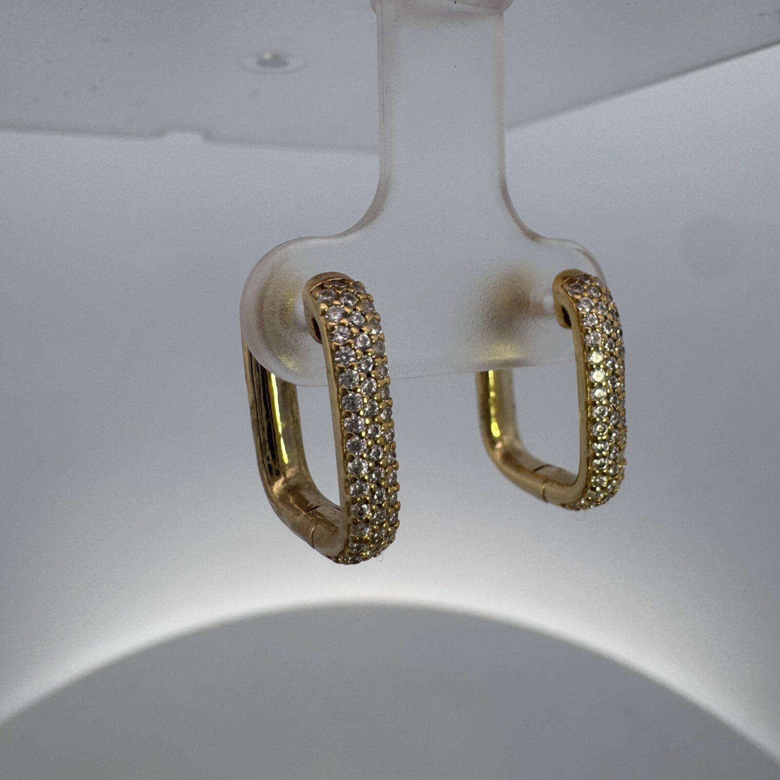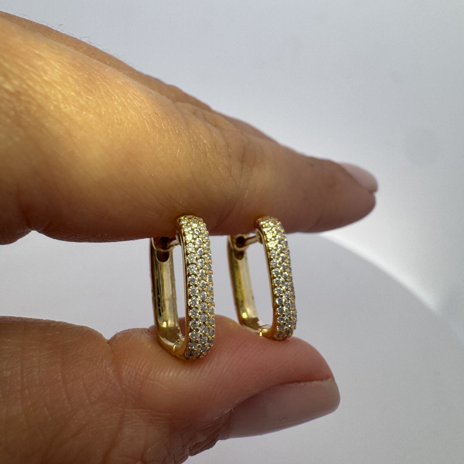 These Sterling Silver 925 Huggies Hoop CZ Earrings in gold tone feature a sleek rectangular hoop shape adorned with shimmering cubic zirconia on the front for extra sparkle. Crafted from genuine sterling silver and plated in a rich gold tone, they combine elegance with everyday wearability.