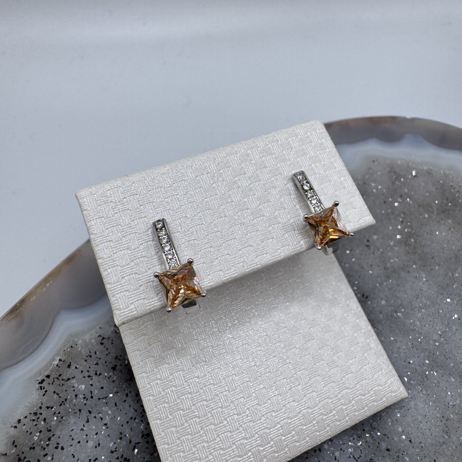Sterling Silver 925 Hoop Earrings featuring vibrant square-cut yellow cubic zirconia at the center, accented with a row of sparkling white CZ stones along the hoop for an elegant and timeless look.