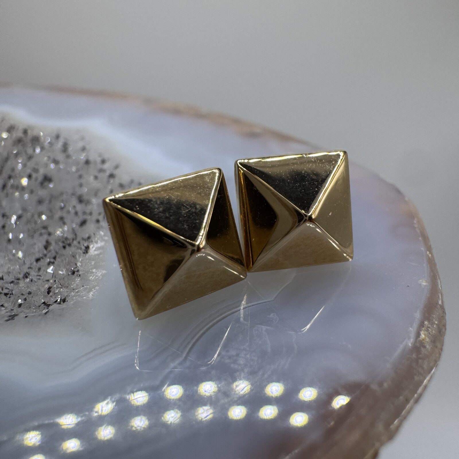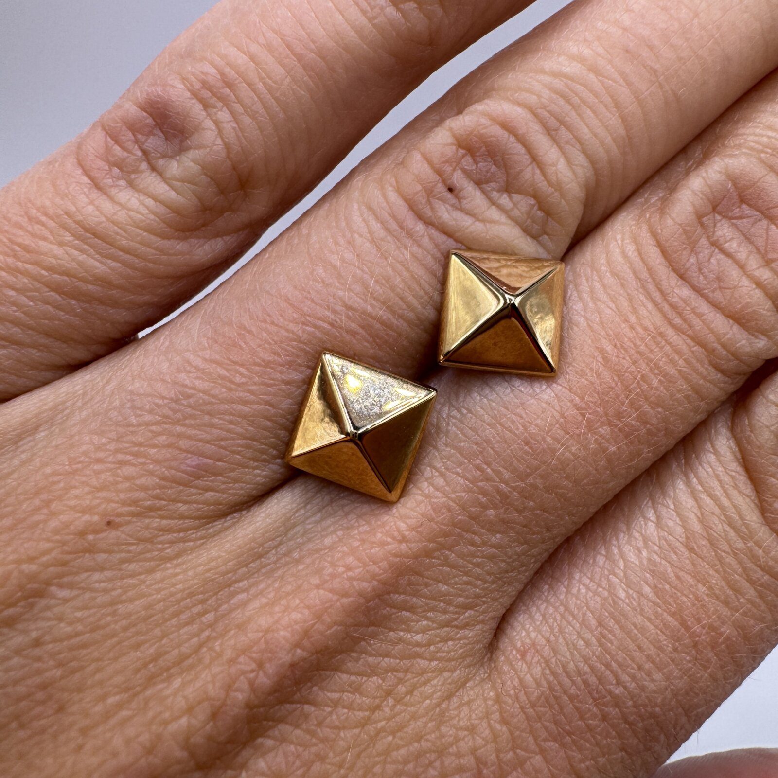 Sleek and bold, these 14K yellow gold pyramid stud earrings feature a polished geometric design that makes a modern statement. Their structured 8mm shape adds a touch of edgy elegance, perfect for both everyday wear and special occasions.