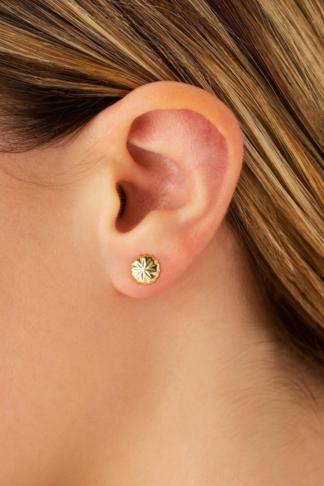 These 14K yellow gold button stud earrings feature a unique fancy-cut design with a radiant, faceted pattern that catches the light beautifully. Compact and lightweight, they offer a subtle yet elegant touch, perfect for everyday wear or layering with other earrings.