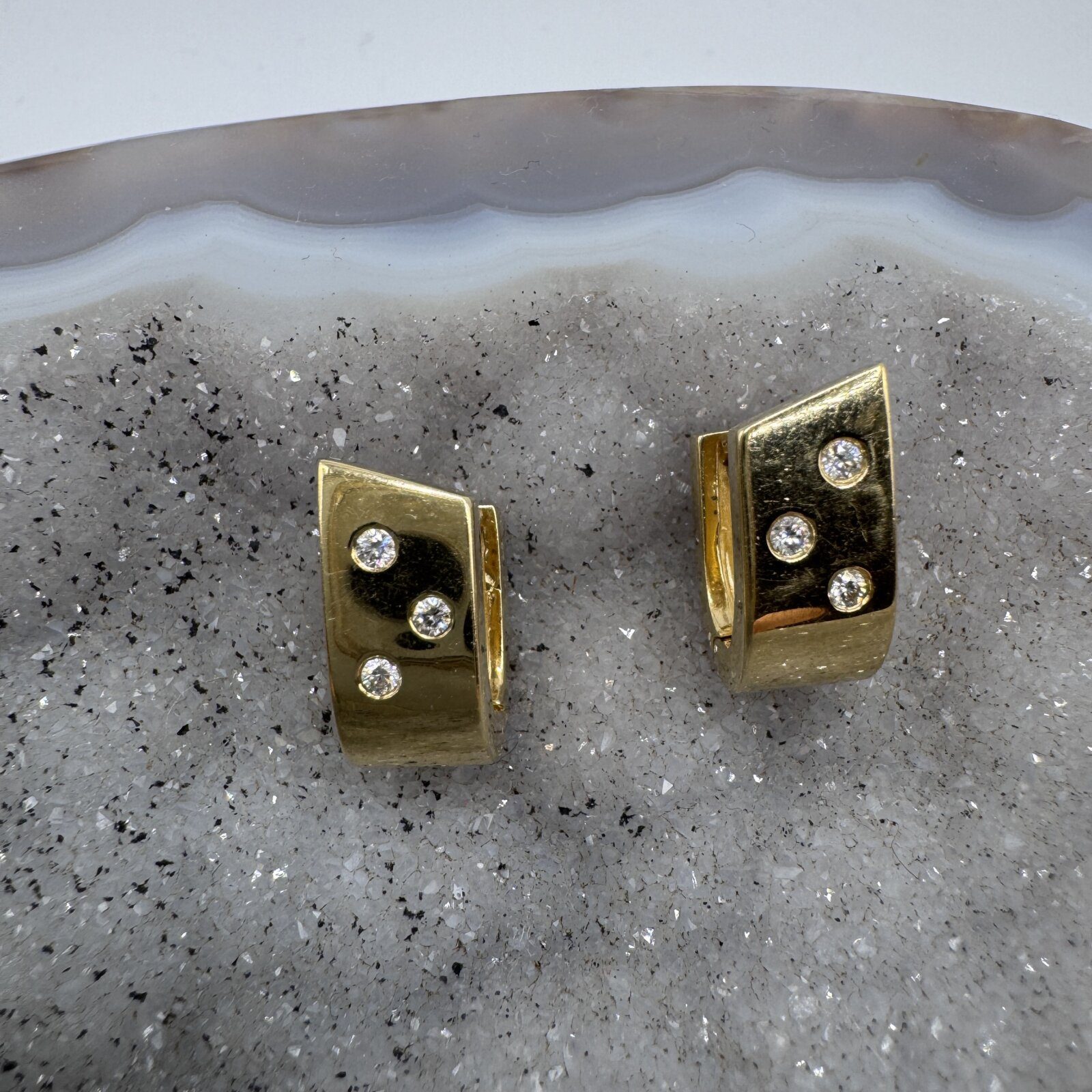 These elegant 14K yellow gold J-shape hoop earrings feature a timeless curved design, each adorned with 3 sparkling diamonds — 6 in total. The diamonds add just the right touch of brilliance and sophistication, making these hoops perfect for both everyday elegance and special occasions.
