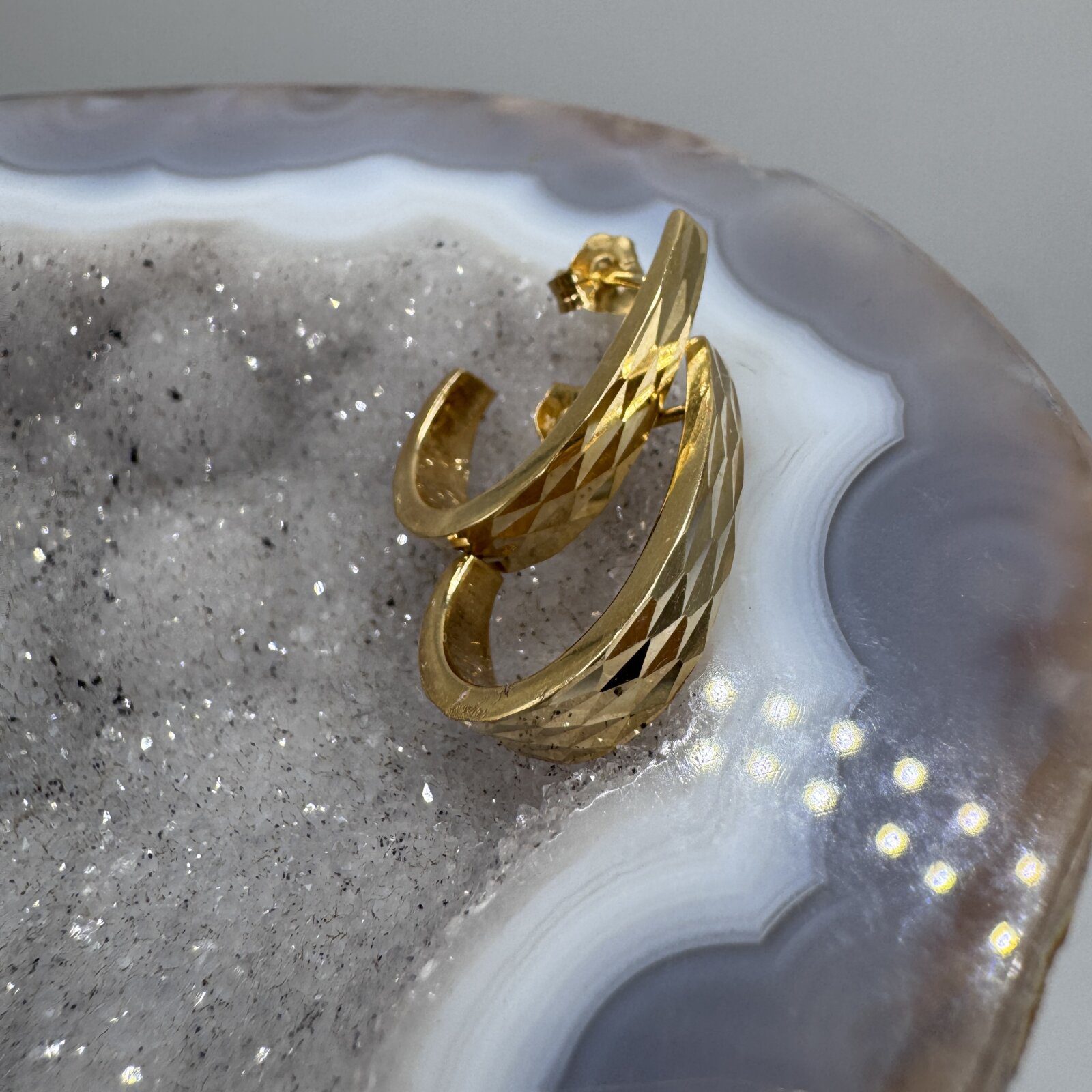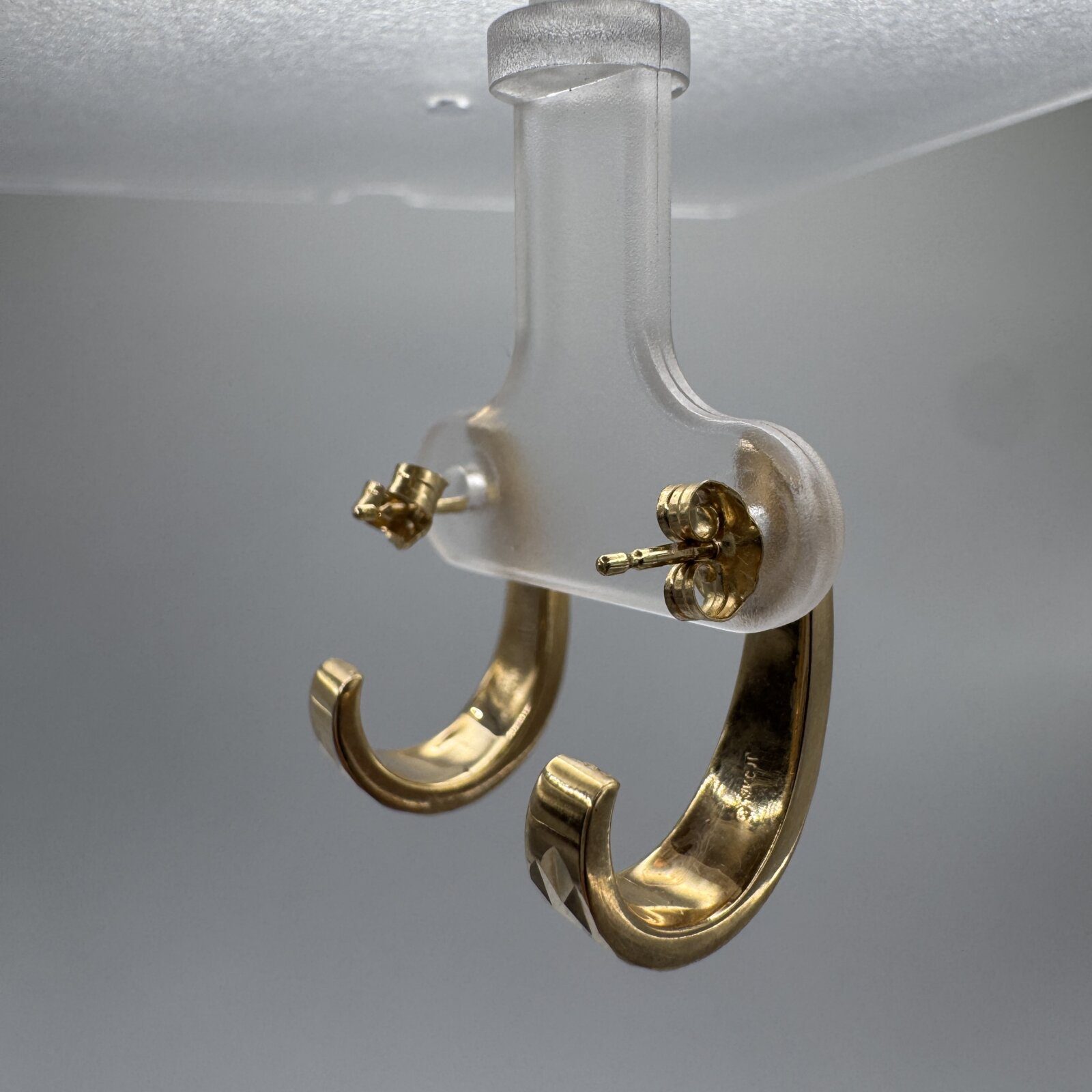 Elegant 14K yellow gold J-hoop earrings featuring a dazzling diamond-cut pattern that catches and reflects light beautifully. Weighing 1.62g, these lightweight hoops offer a refined yet versatile look, perfect for both everyday wear and special occasions. Secure post-back closure for comfort and ease.