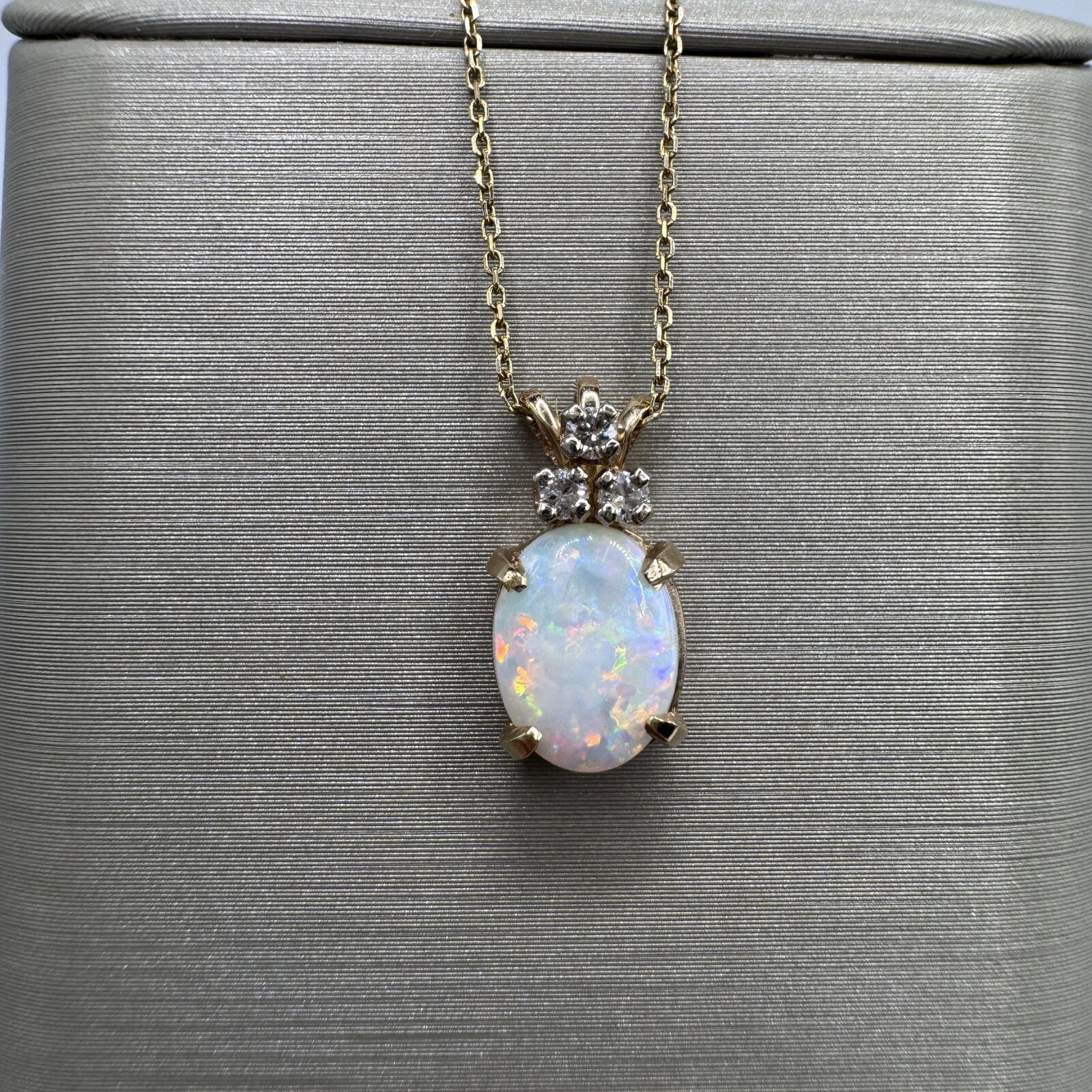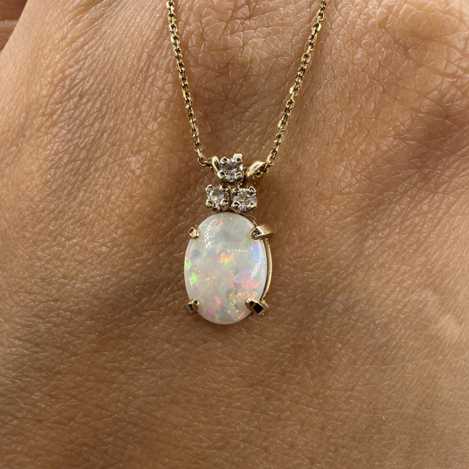 A delicate pendant crafted in 14k yellow gold, featuring a stunning oval-shaped opal accented with sparkling diamonds. The opal displays a mesmerizing play of colors, while the brilliant diamonds add elegance and brilliance to the design. Lightweight yet luxurious, this pendant makes a perfect gift or a timeless addition to your jewelry collection.