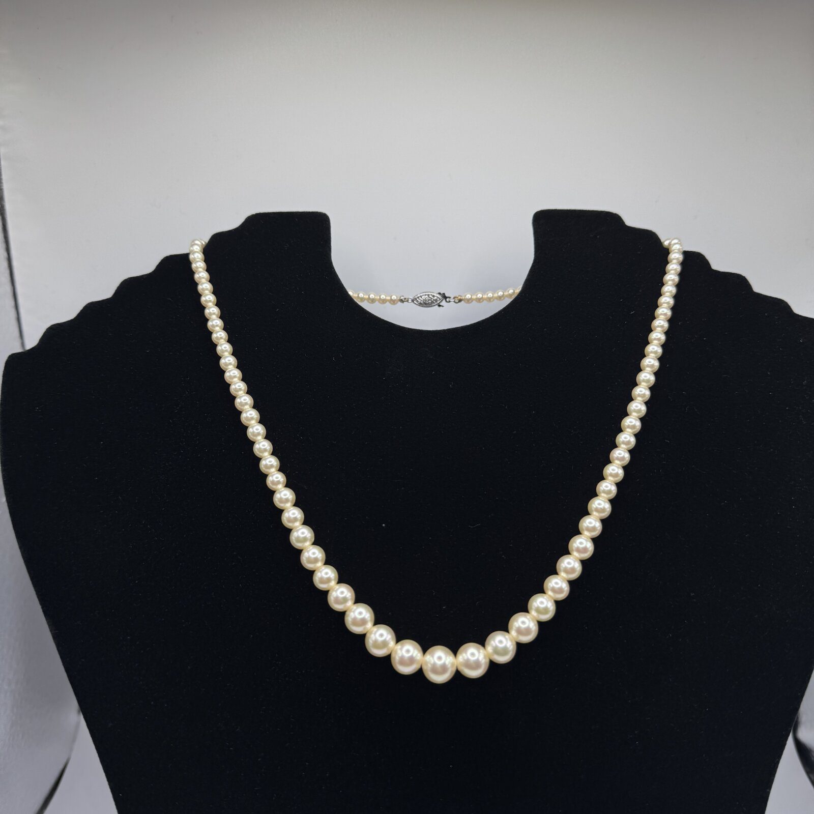 This 17-inch pearl strand features graduated pearls ranging from 3.5mm to 8mm, finished with a 14K white gold clasp — a timeless expression of elegance and grace.