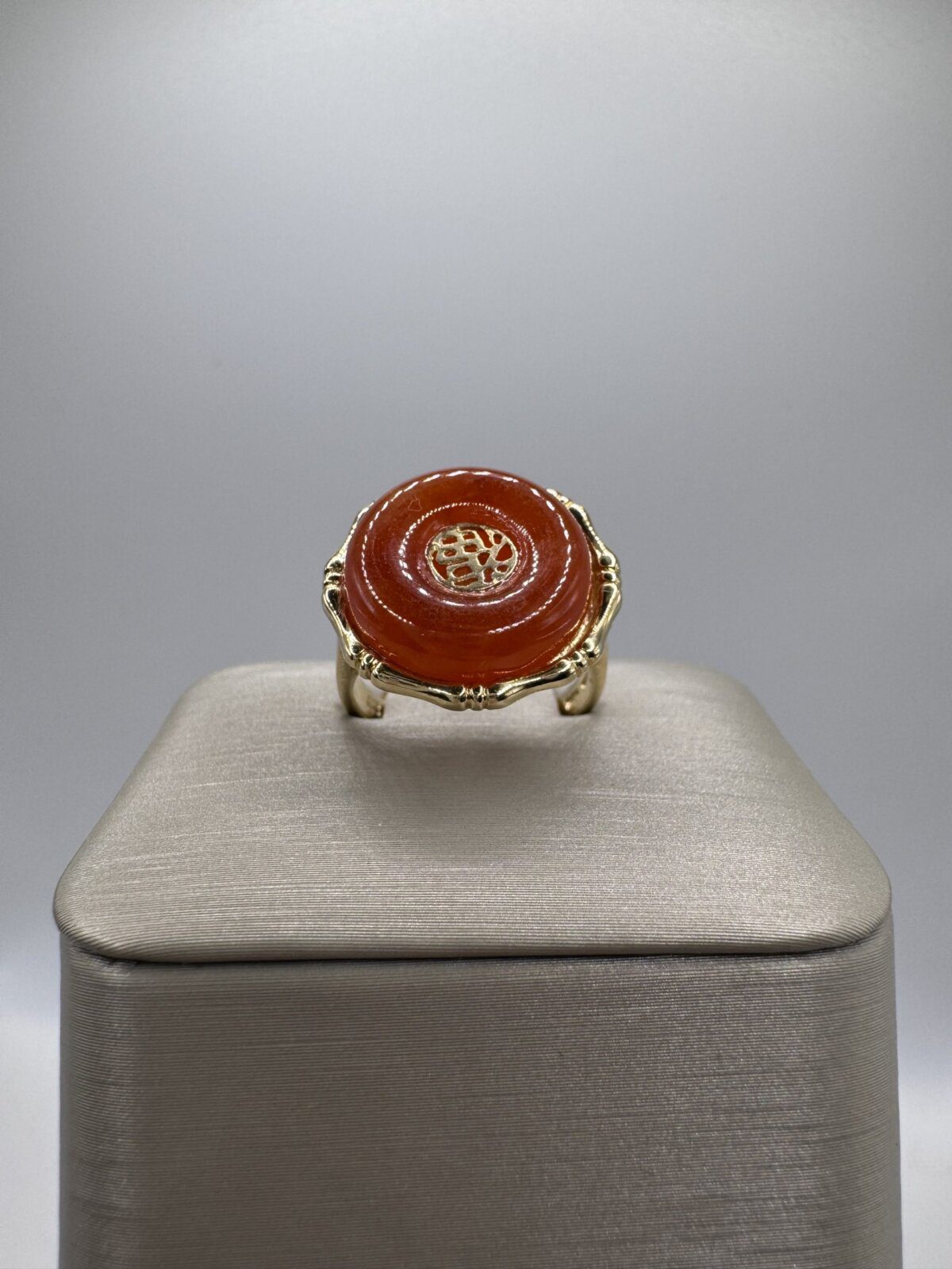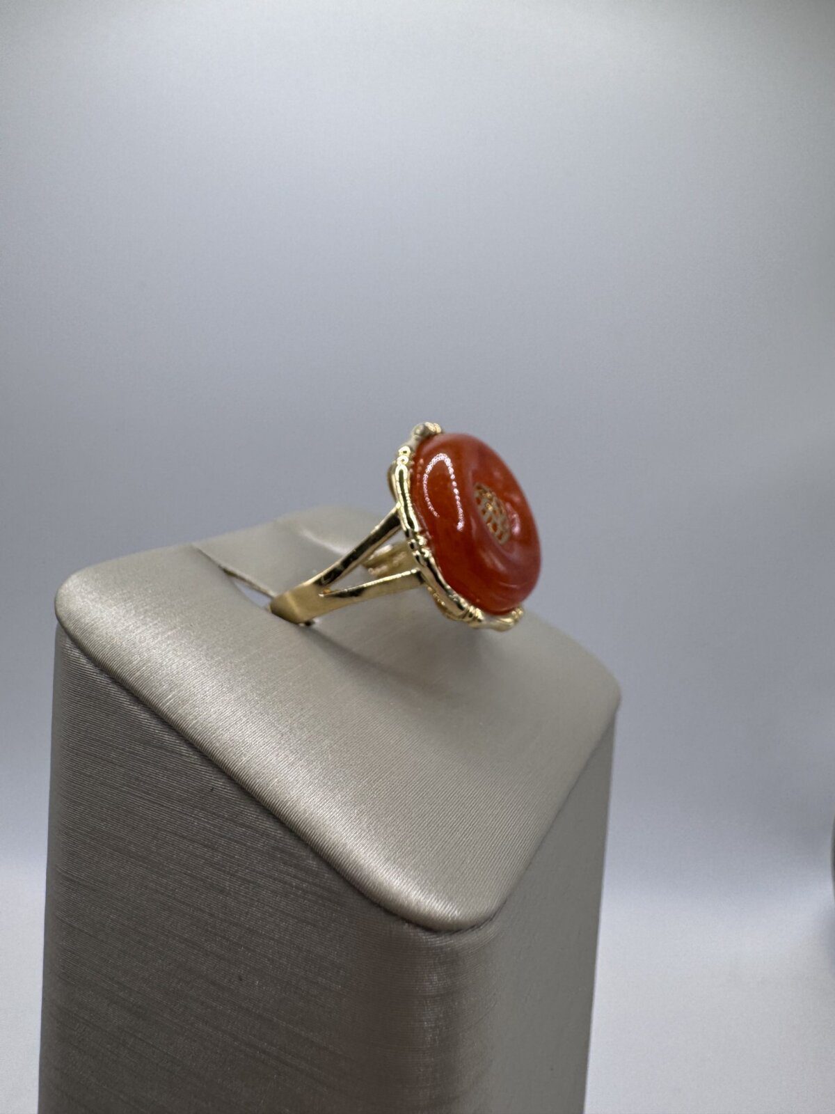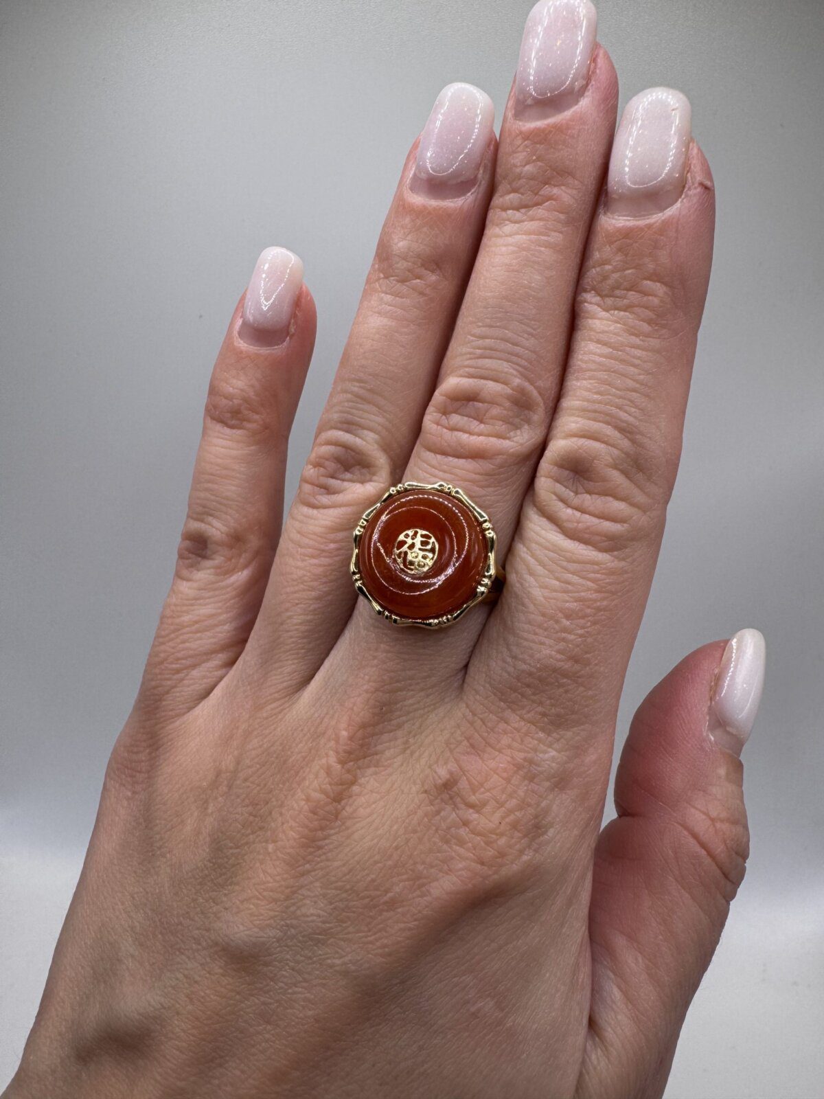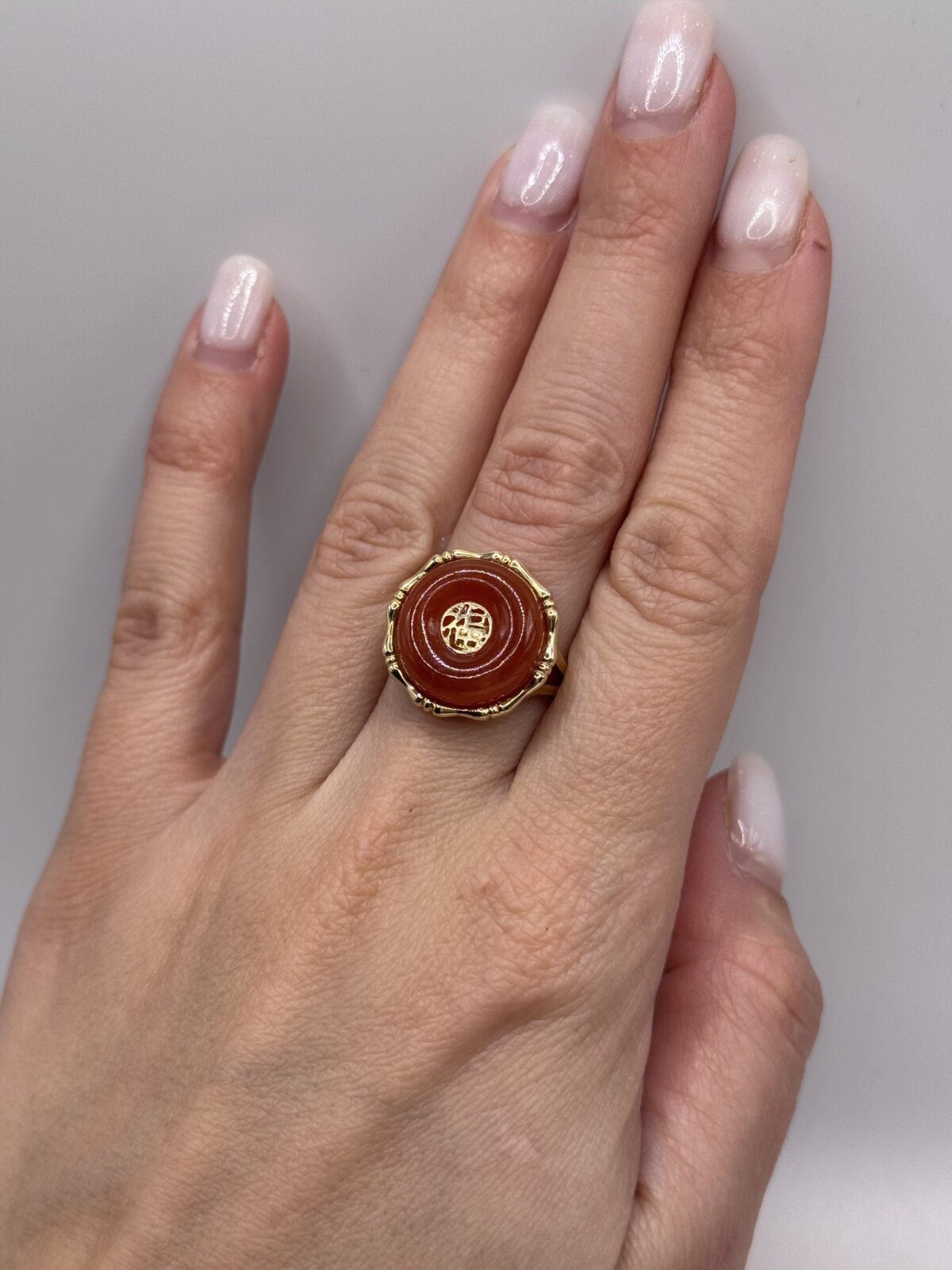 Discover timeless elegance with this Rare Natural Red Jadeite Jade Ring, beautifully crafted in 14K Yellow Gold. This vintage treasure from the 1970s features a stunning symbol of good fortune and blessing, making it not only a stylish accessory but also a meaningful talisman. Perfect for those who appreciate unique vintage jewelry with cultural significance.