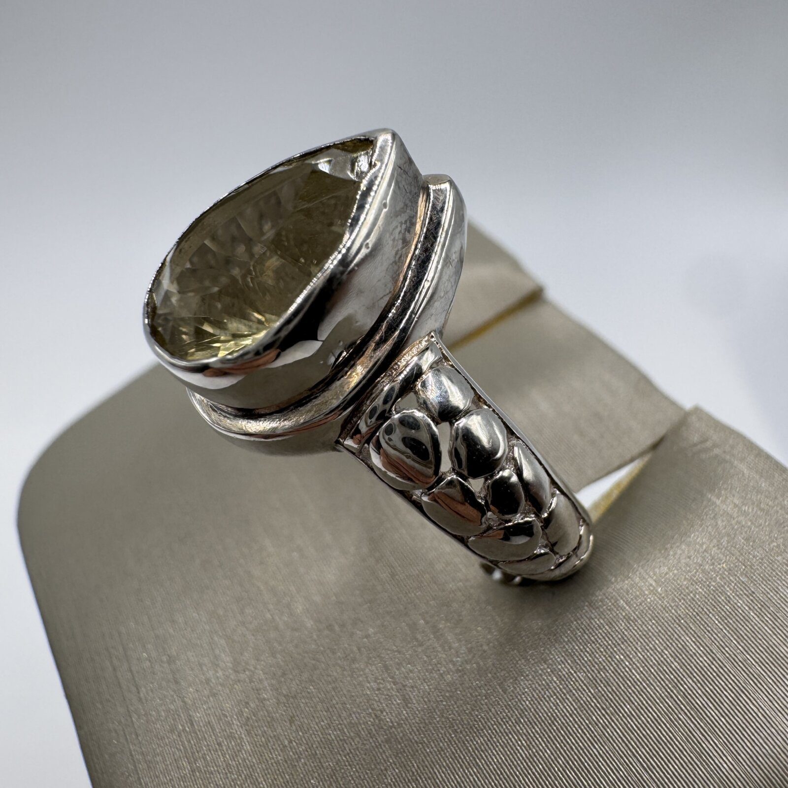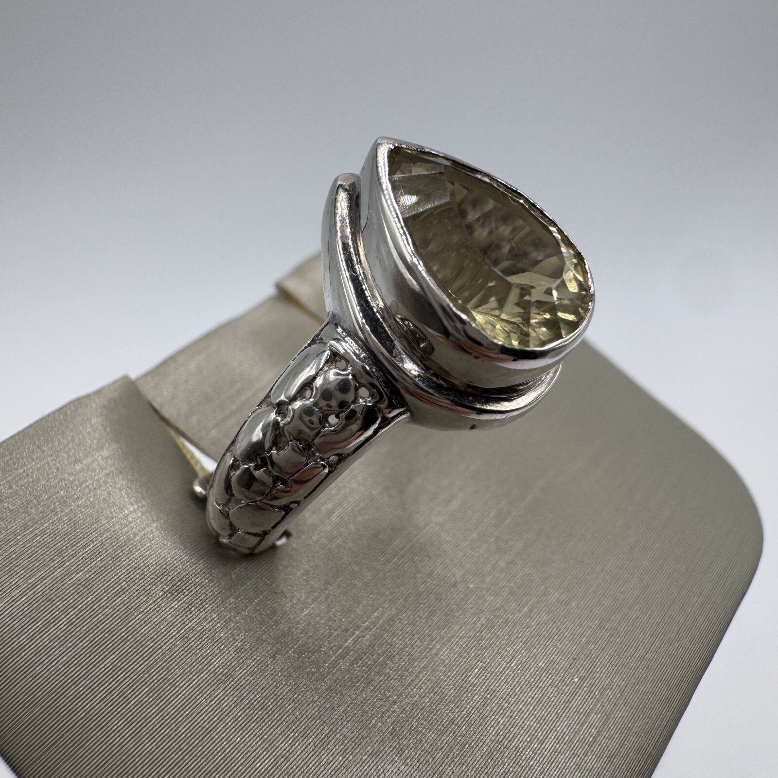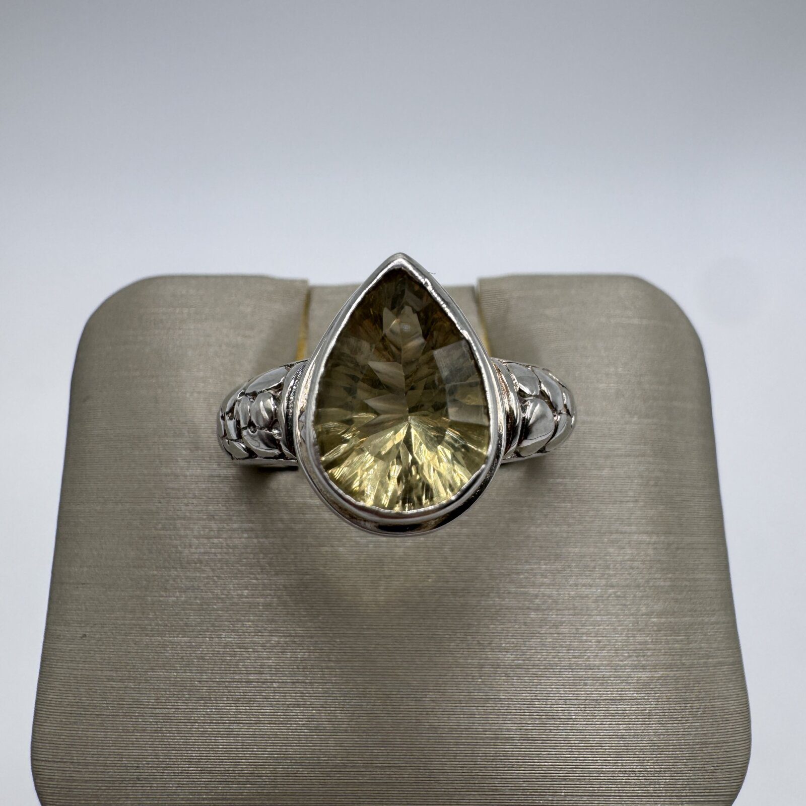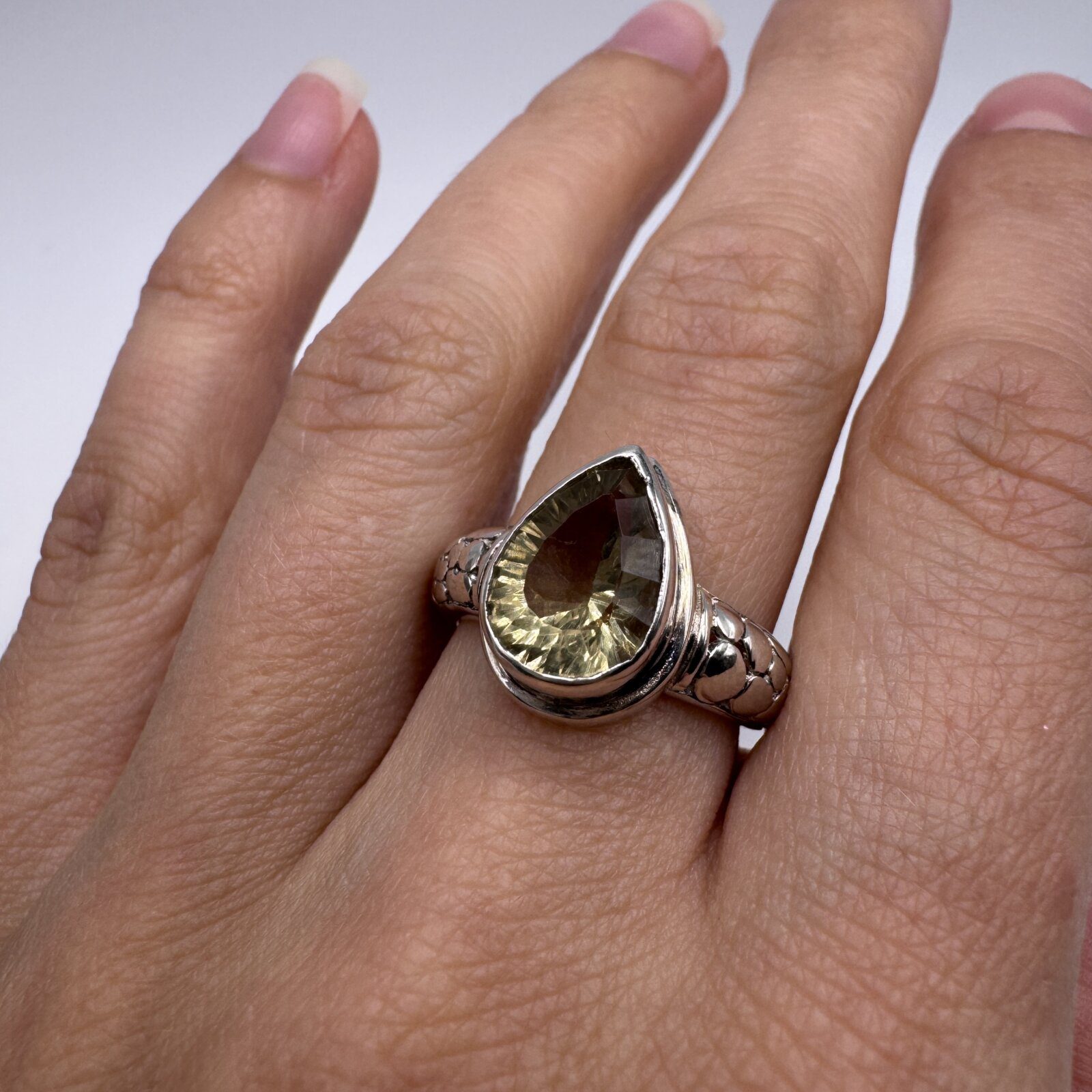 This stunning sterling silver ring features a beautiful pear-shaped green spinel weighing 4.56 grams. The band showcases an intricate snake-inspired design, symbolizing transformation and strength. The ring is adjustable for a comfortable fit, approximately size 7. A unique and elegant piece perfect for any jewelry collection.