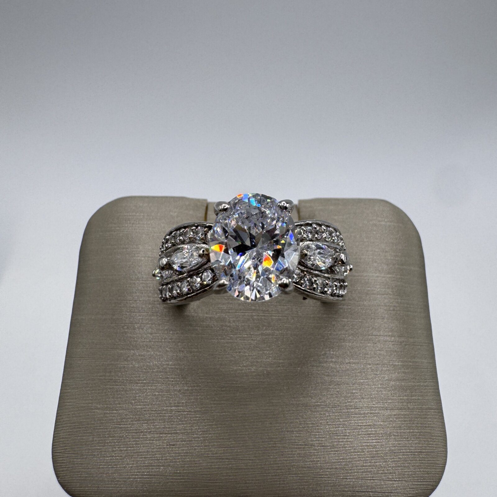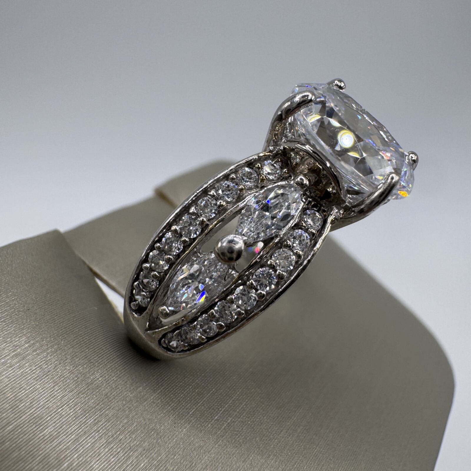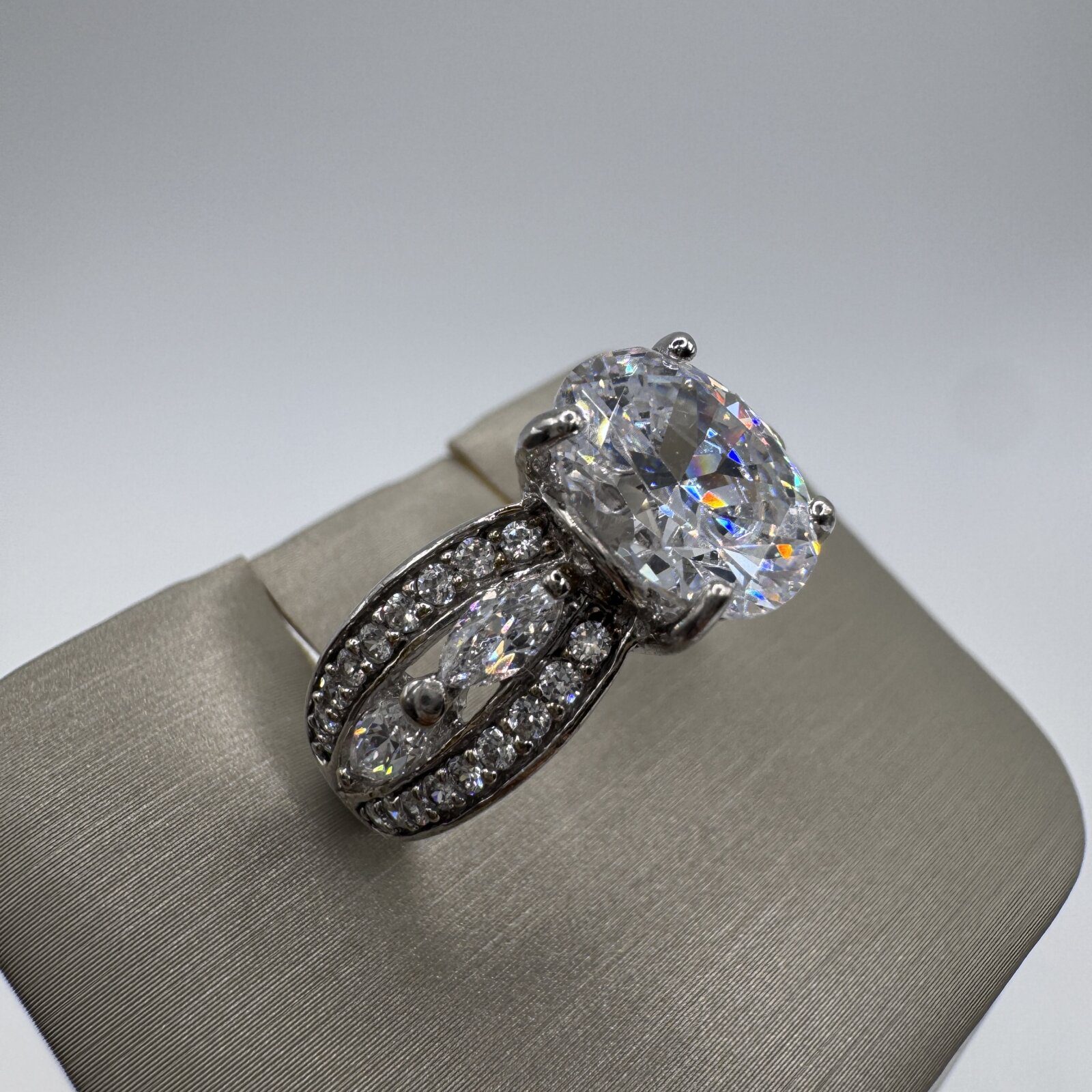 Stunning sterling silver ring featuring a large, highly sparkling zirconia center stone with exceptional fire and brilliance. The band is accented with additional zirconia stones, creating a luxurious, eye-catching design. Size 7 — a glamorous statement ring that shines beautifully in any light.