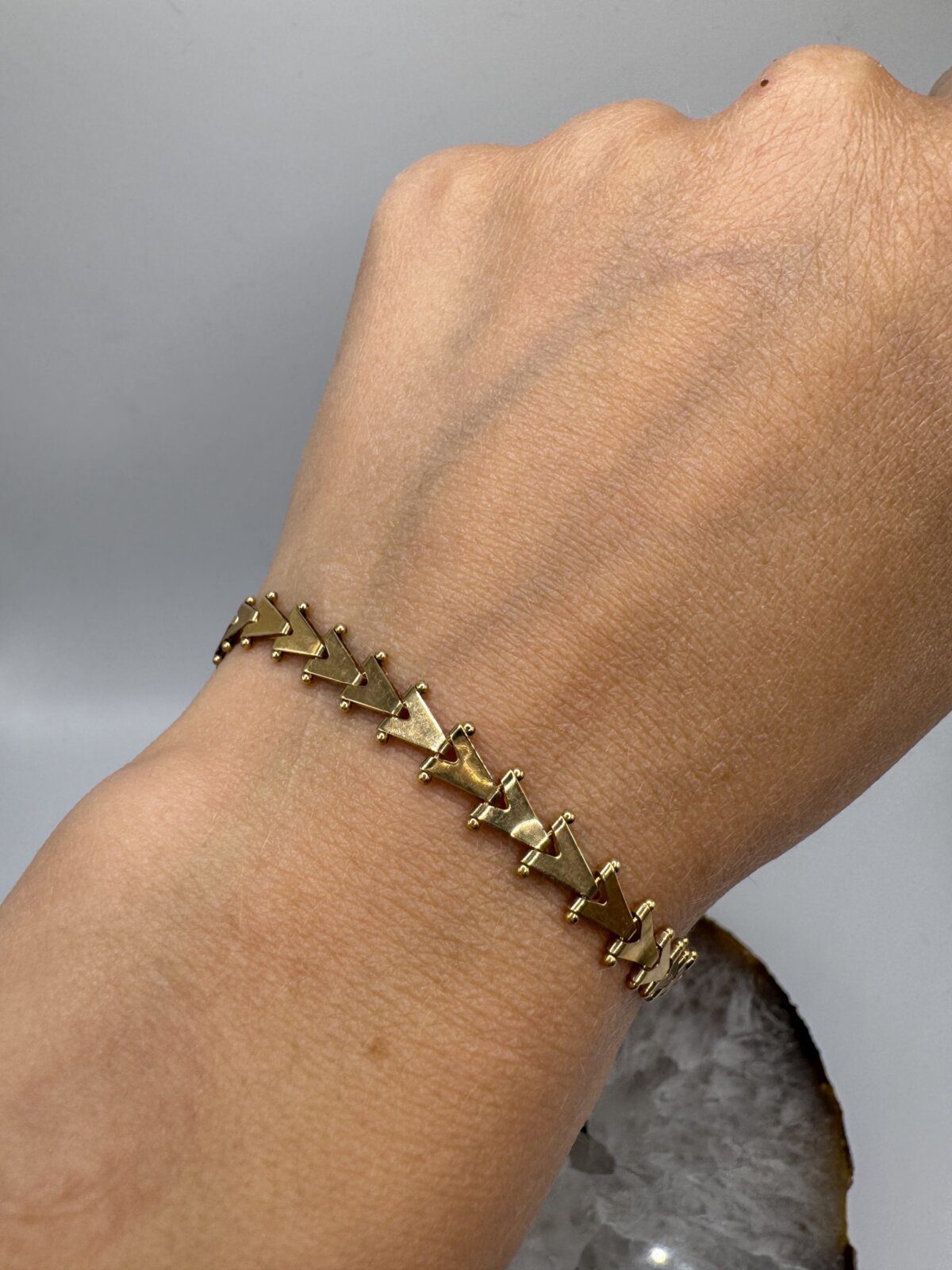Stunning 14K yellow gold bracelet featuring sleek V-shaped links with a polished finish. Measuring 7.5 inches long and 6mm wide, this piece is hallmarked for authenticity and crafted for timeless elegance.