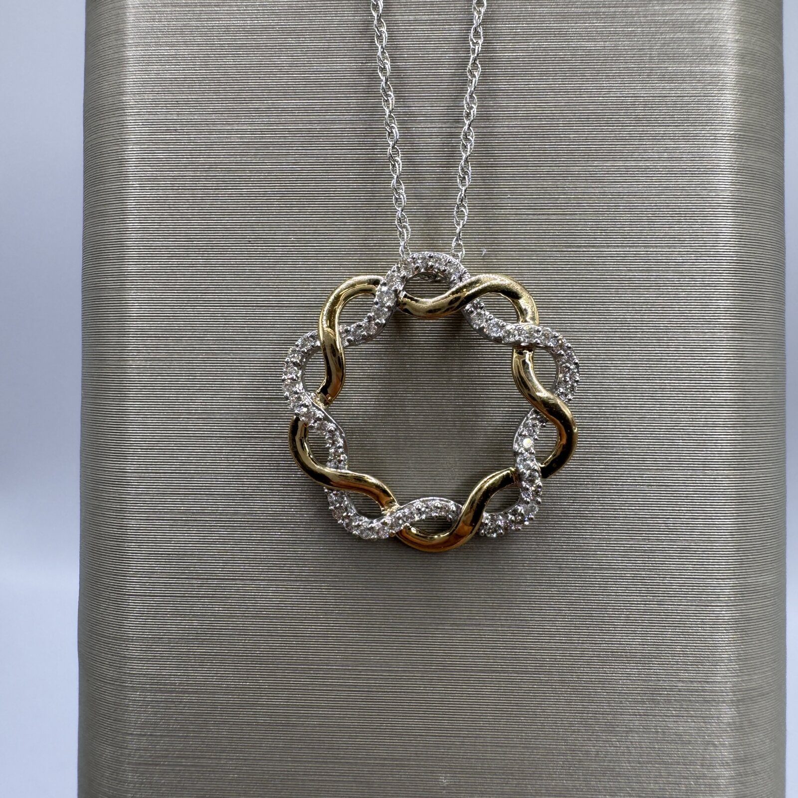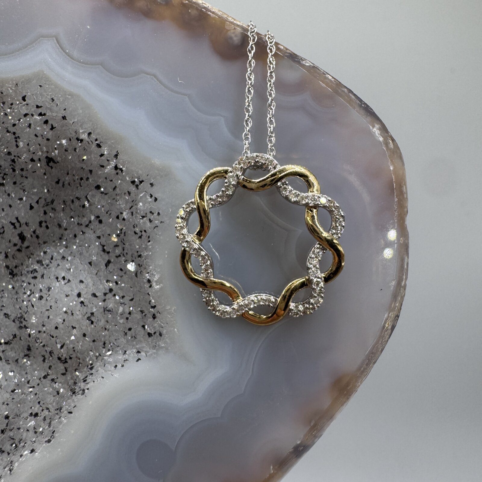 This 18″ two-tone 14K gold pendant features a crisscross circle design accented with diamonds — a graceful symbol of gratitude and connection.