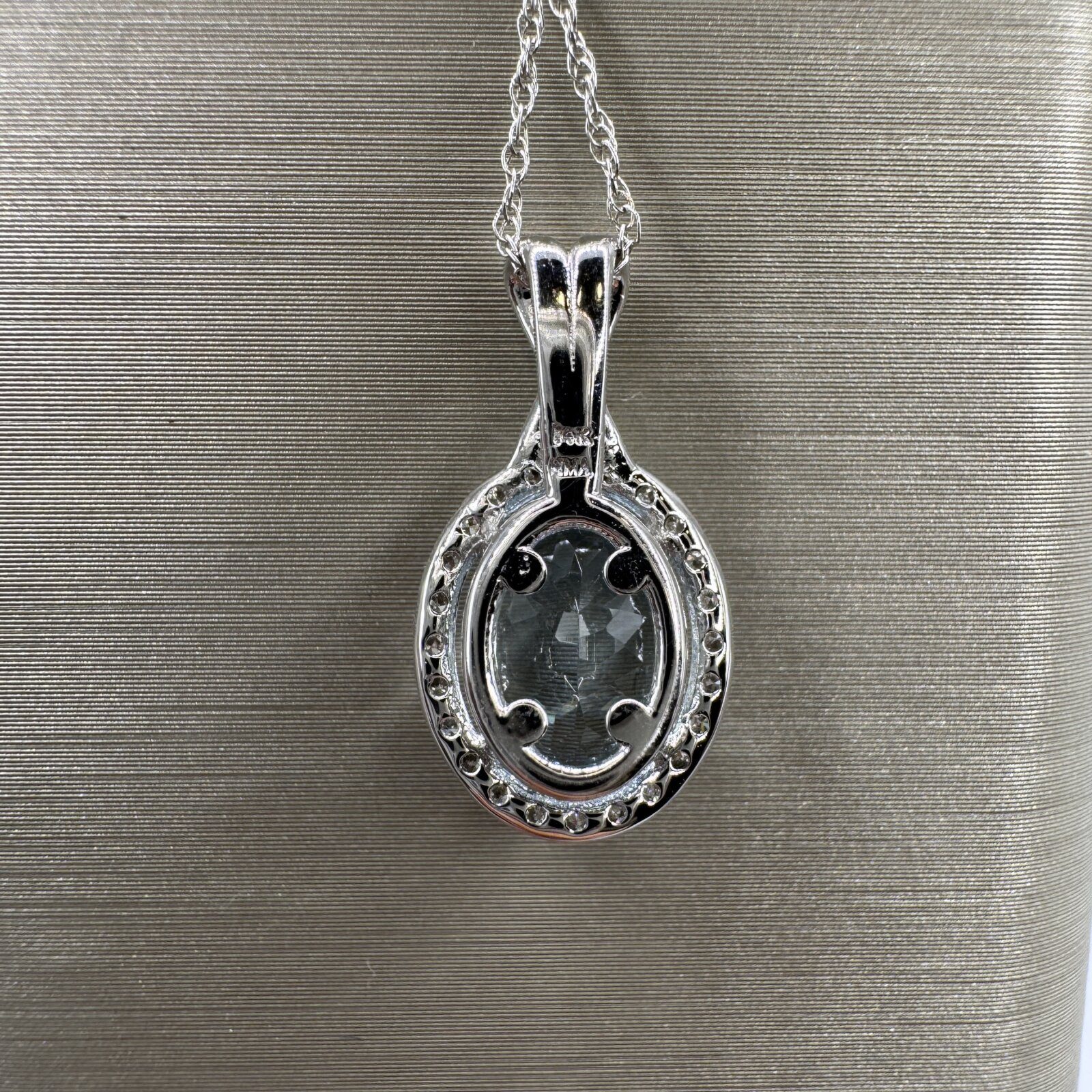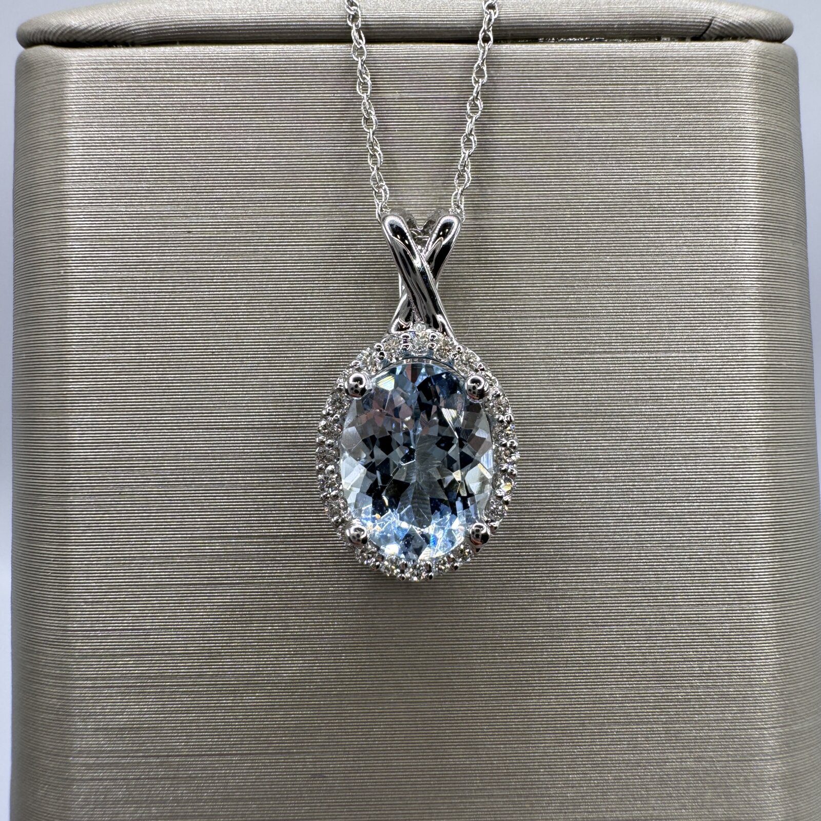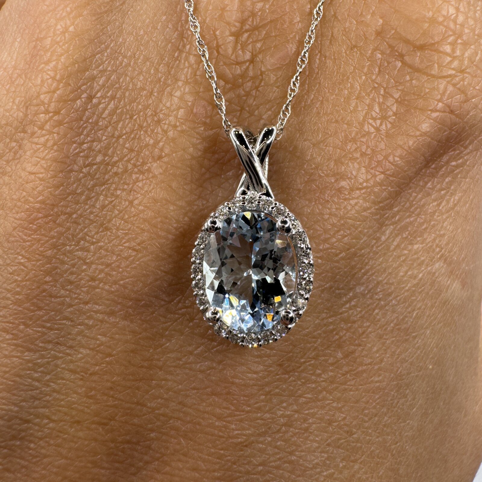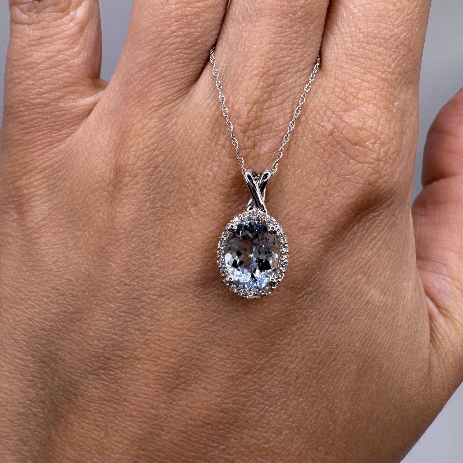 This 18″ necklace features a stunning 1.60 ct aquamarine pendant accented with 0.12 ct of diamonds, all set in 14K white gold — a serene and sophisticated statement piece.