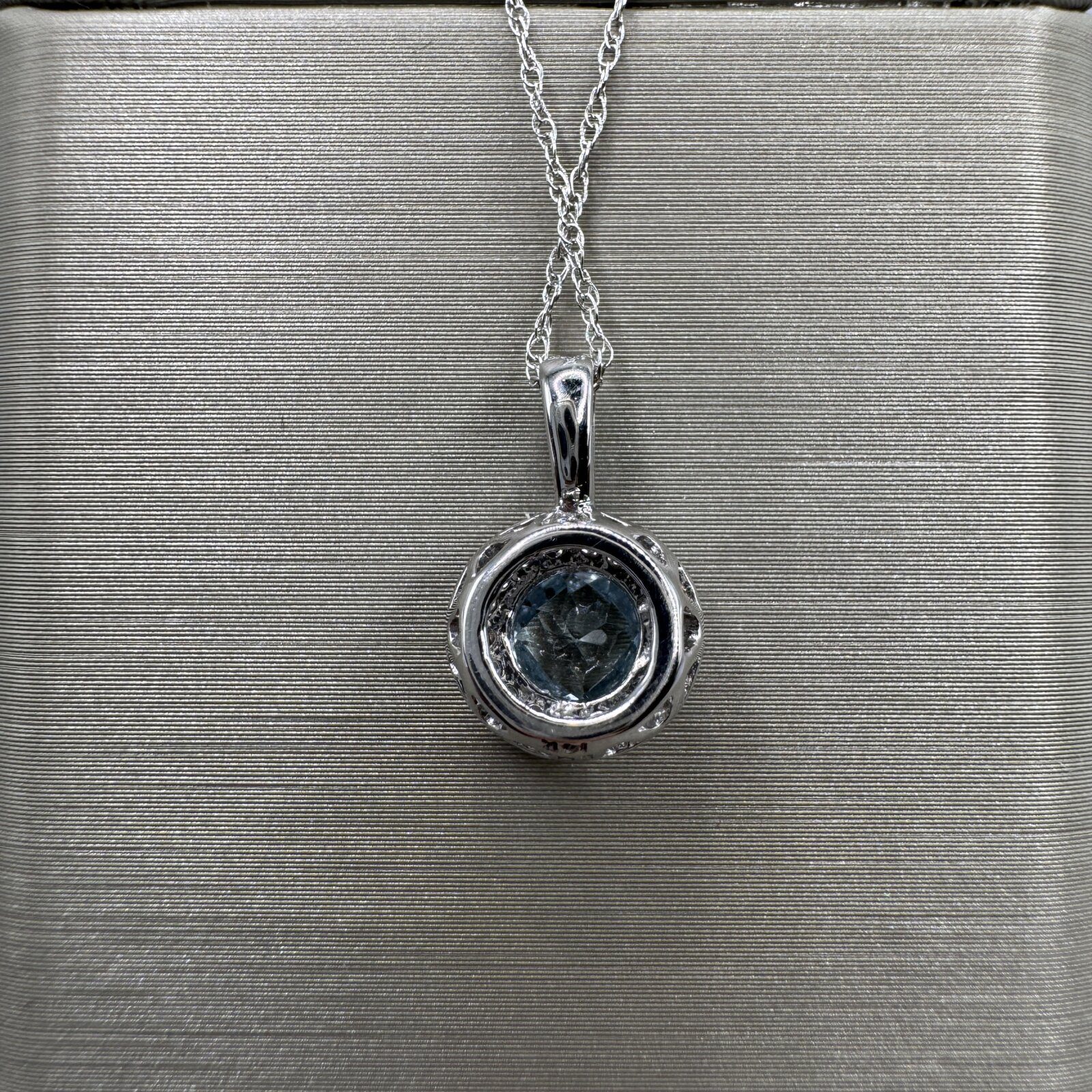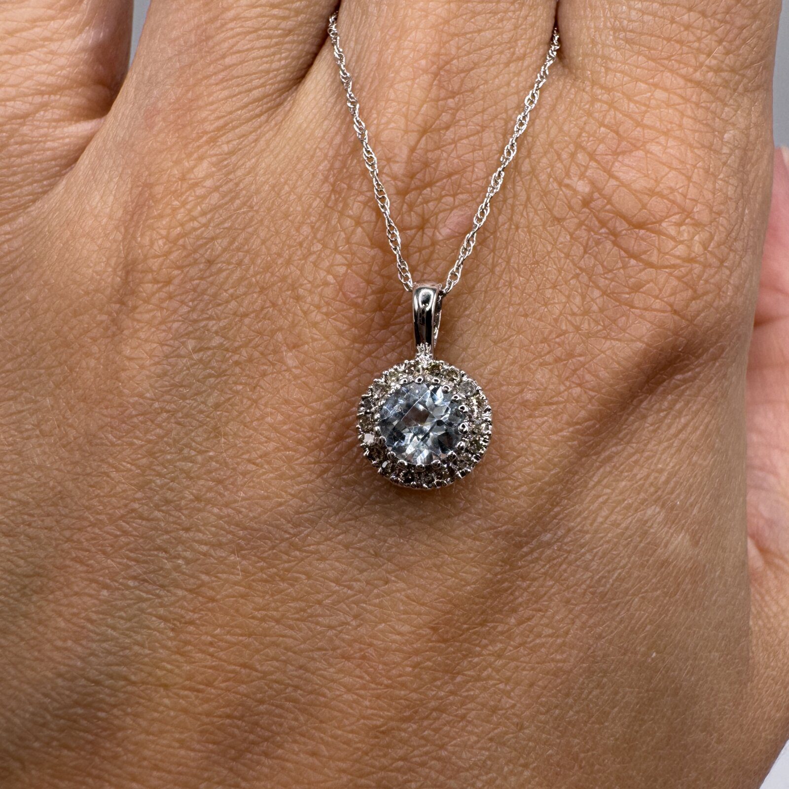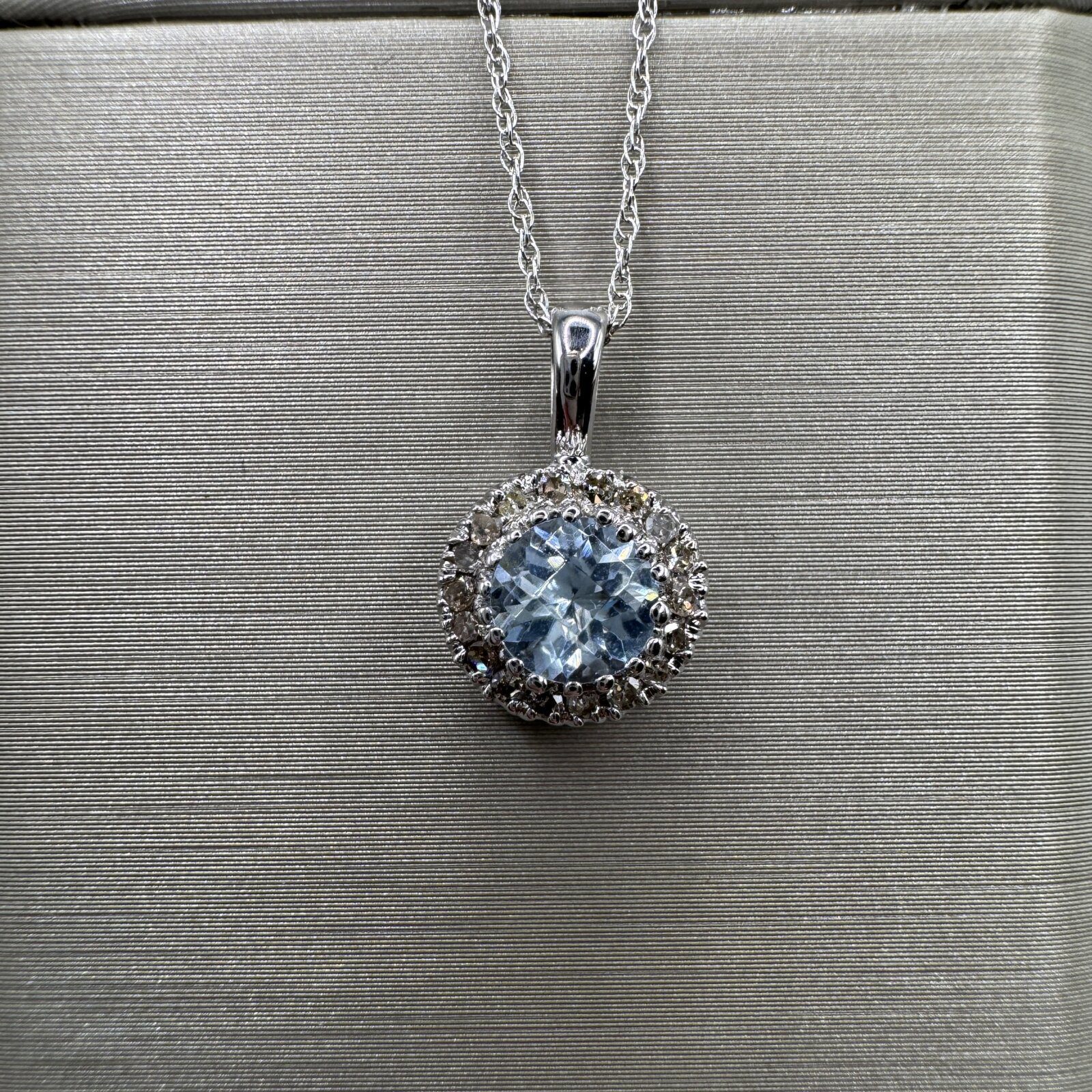 This 14K white gold pendant features a 0.48 ct blue topaz accented by 0.08 ct of sparkling diamonds — a graceful piece that adds a touch of color and brilliance.