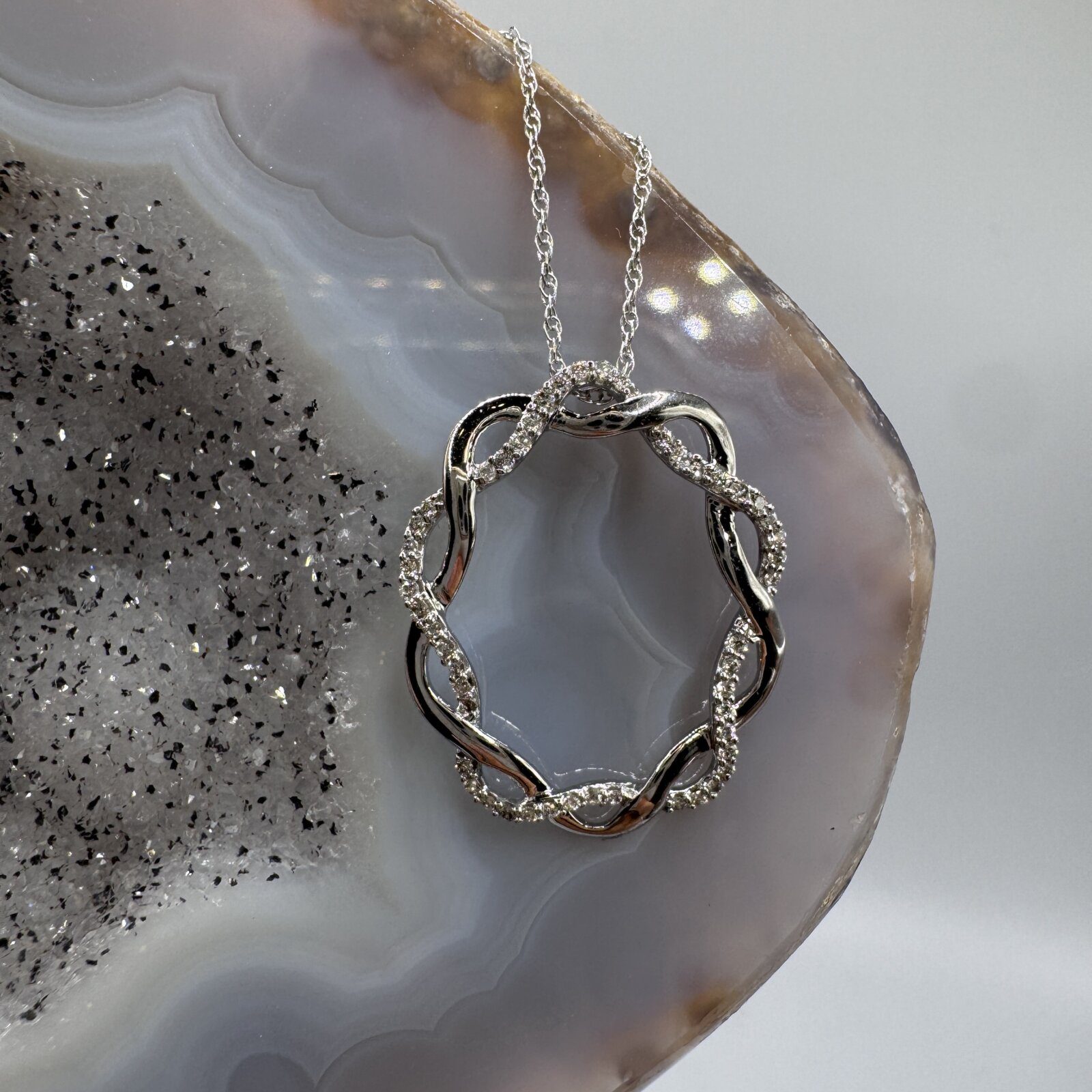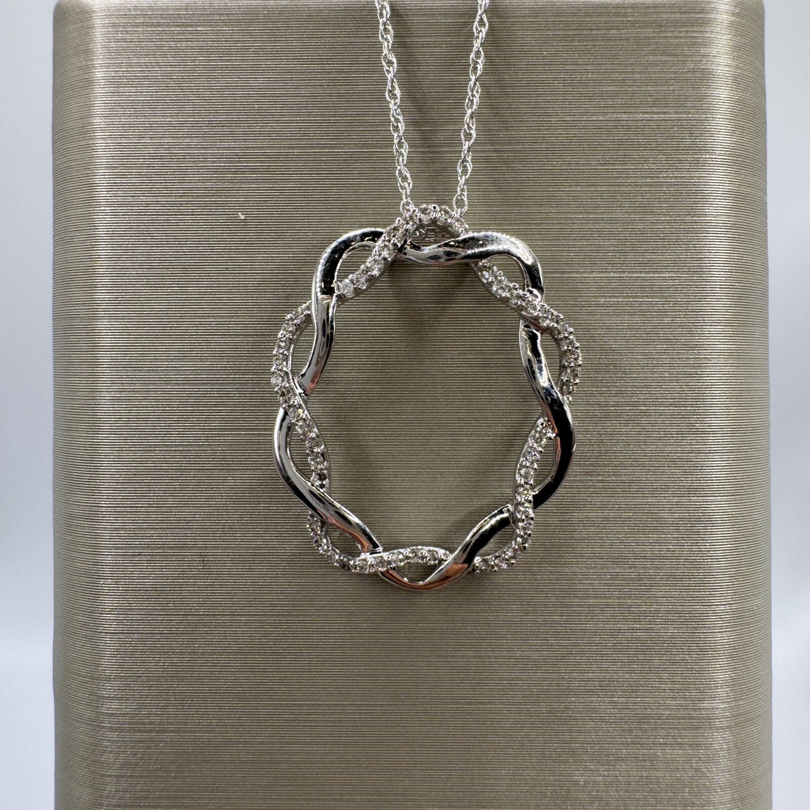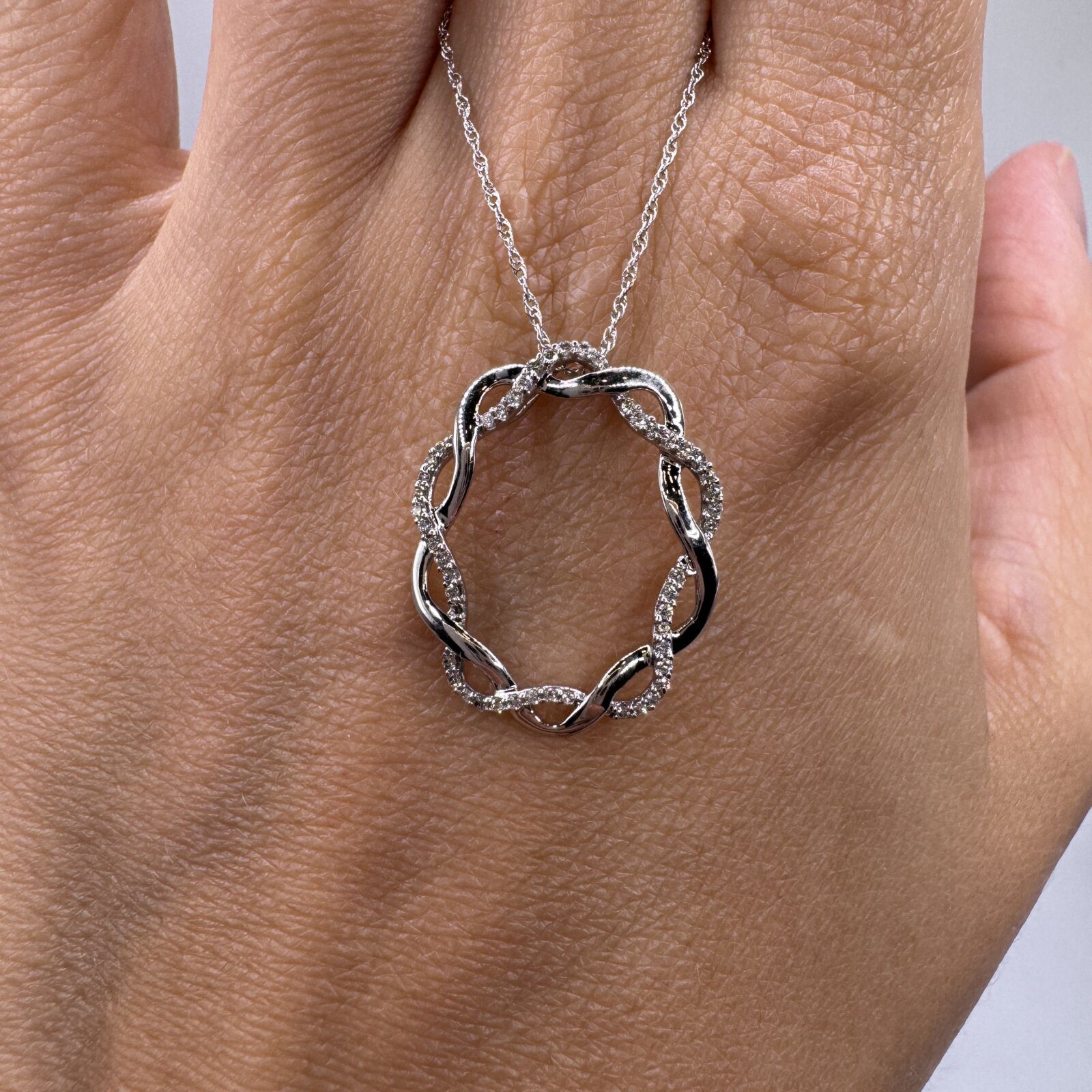 This 18″ two-tone 14K gold pendant features a crisscross circle design accented with diamonds — a graceful symbol of gratitude and connection.
