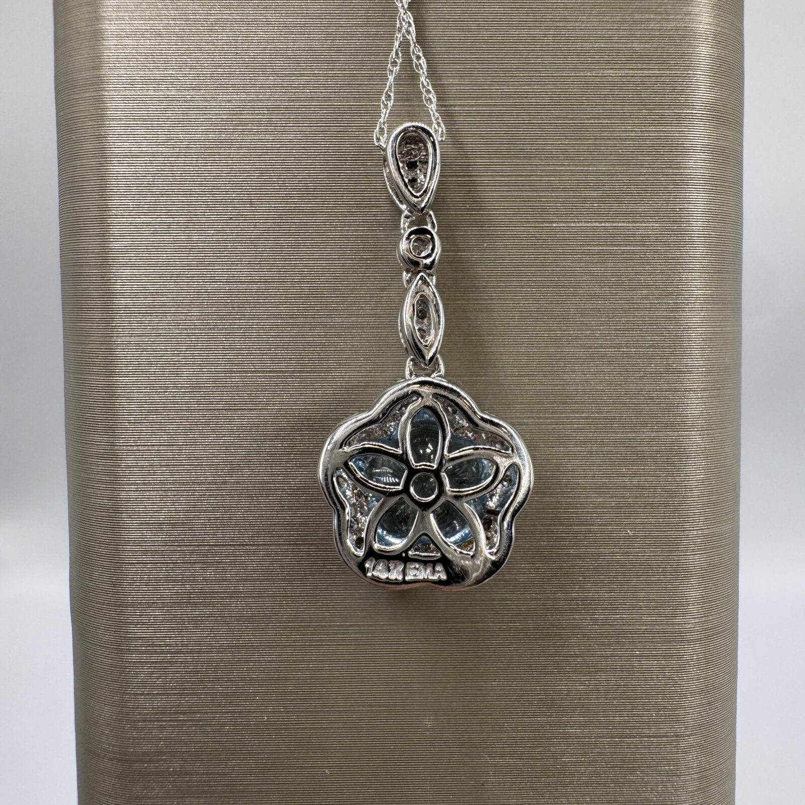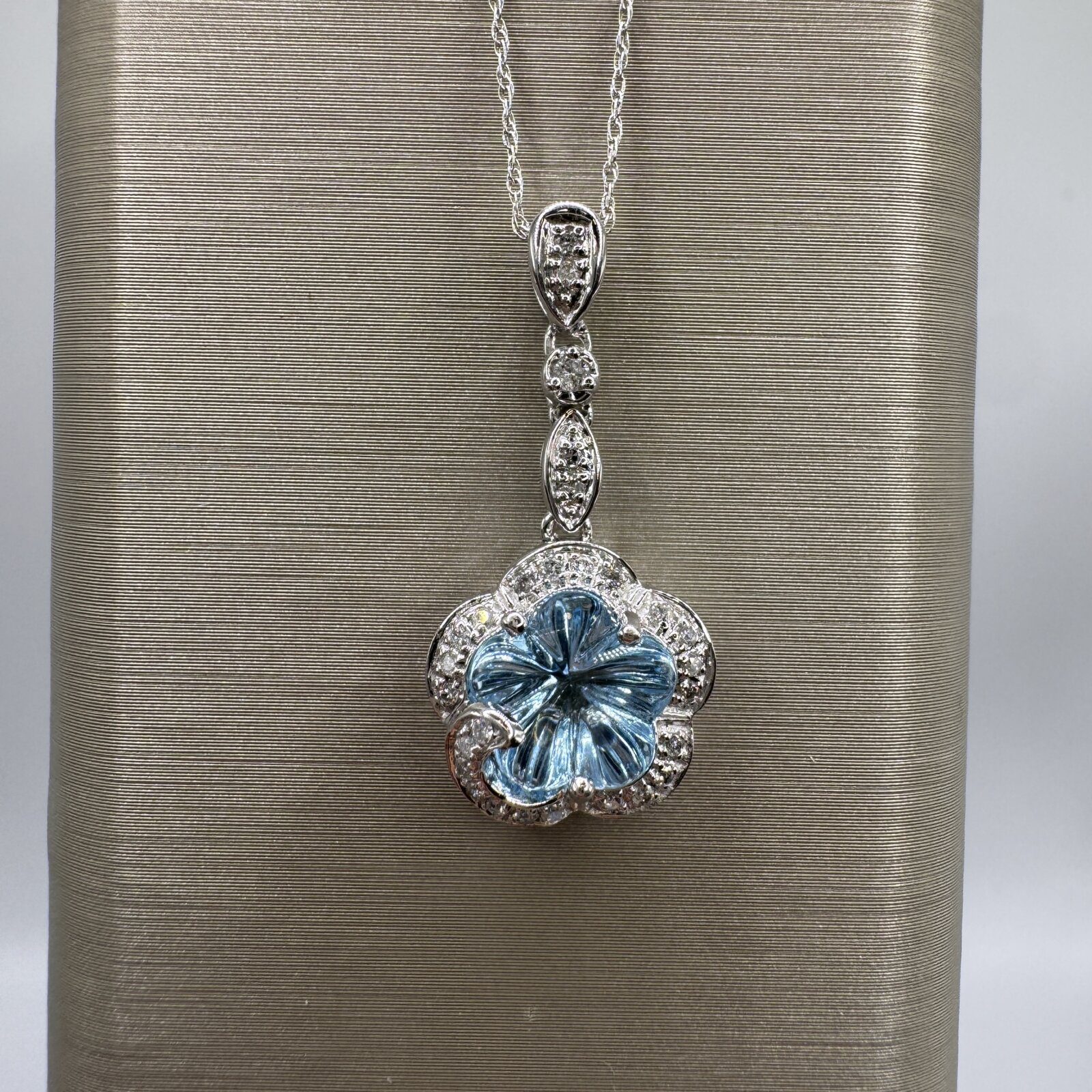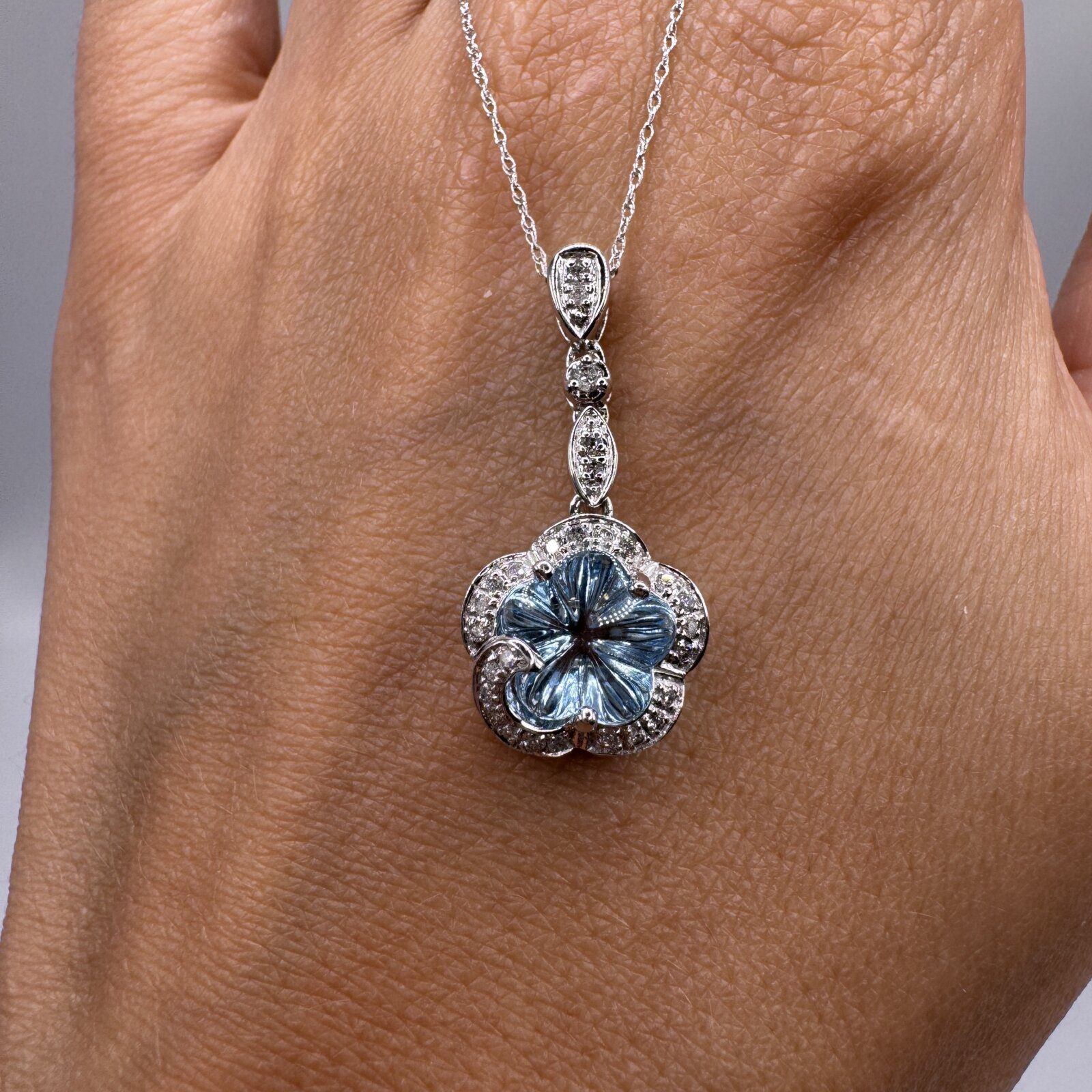 This 18″ necklace features a 1.77 ct blue topaz in a delicate flower motif, accented by 0.14 ct of diamonds and set in 14K white gold — a fresh and feminine touch of sparkle.