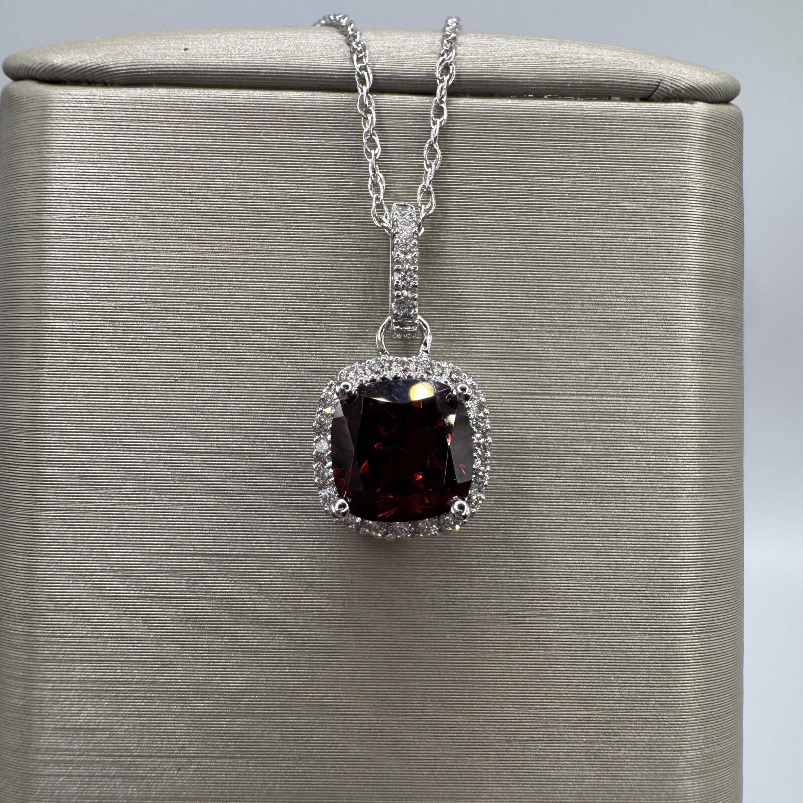 This 18″ necklace showcases a deep 1.84 ct garnet accented by 0.20 ct of diamonds, set in 14K white gold — a bold and timeless expression of elegance.