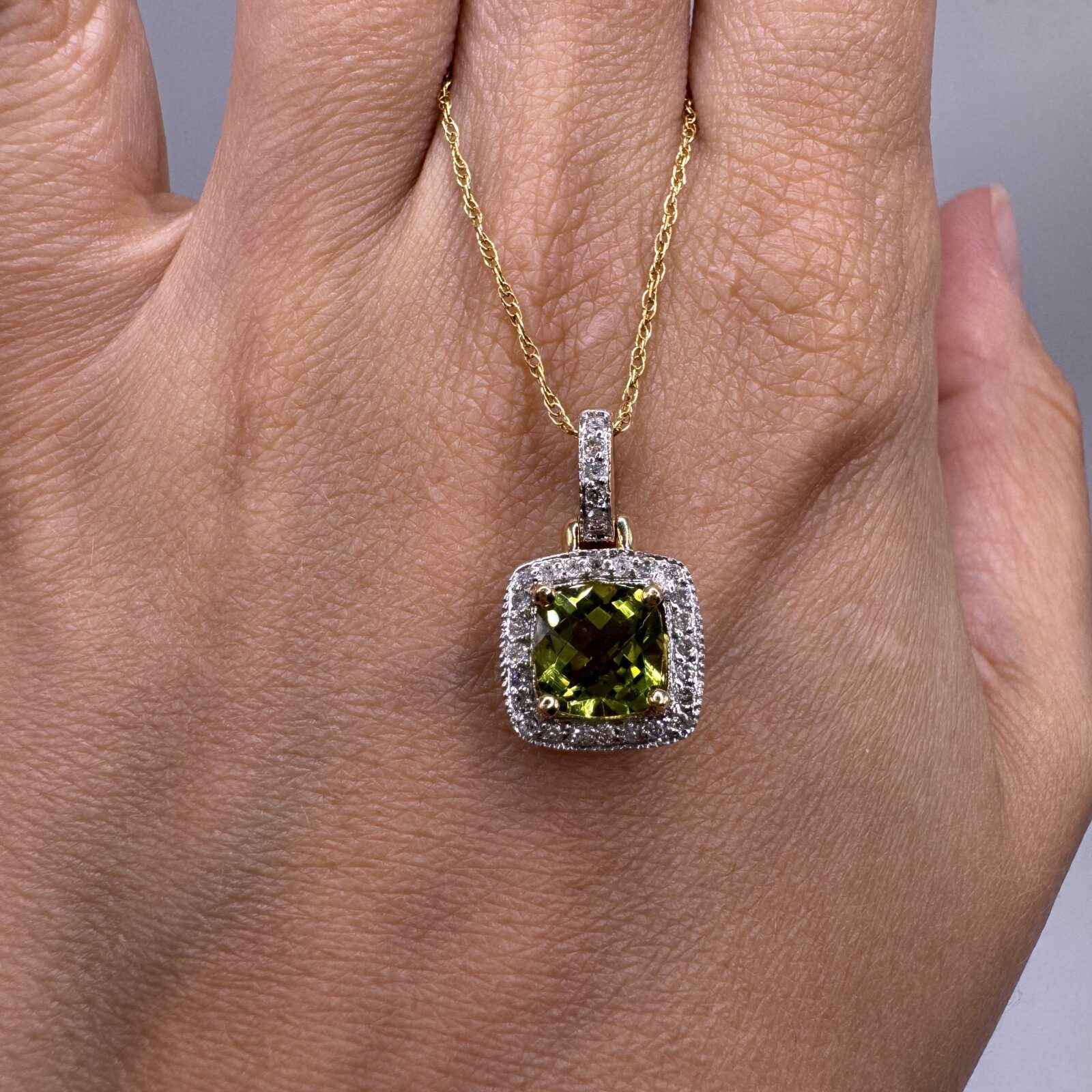 This 18″ necklace features a 1.32 ct peridot accented by 0.13 ct of diamonds, set in 14K yellow gold — a radiant blend of golden warmth and vibrant color.