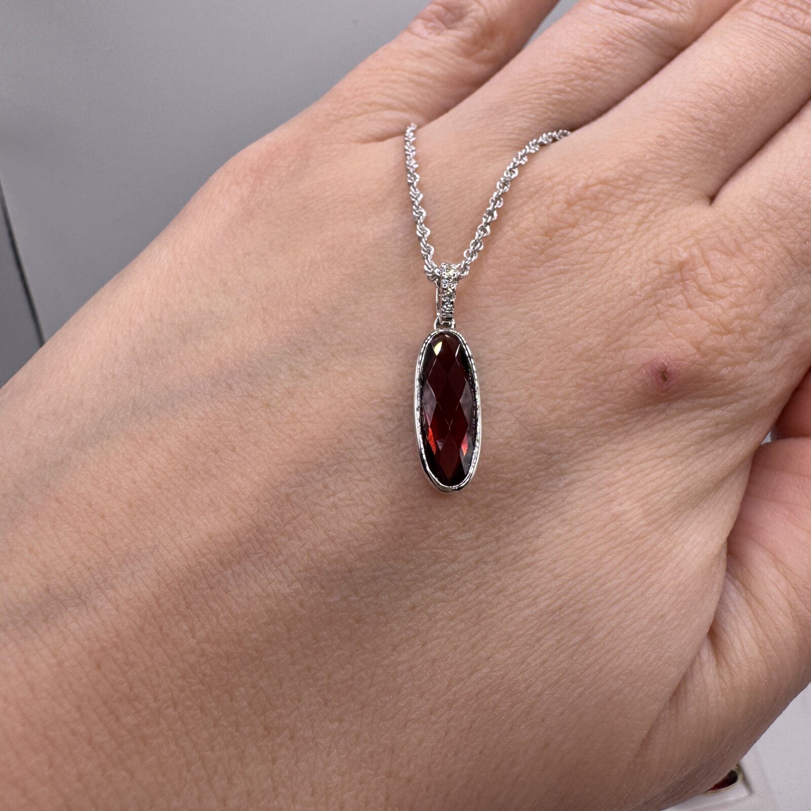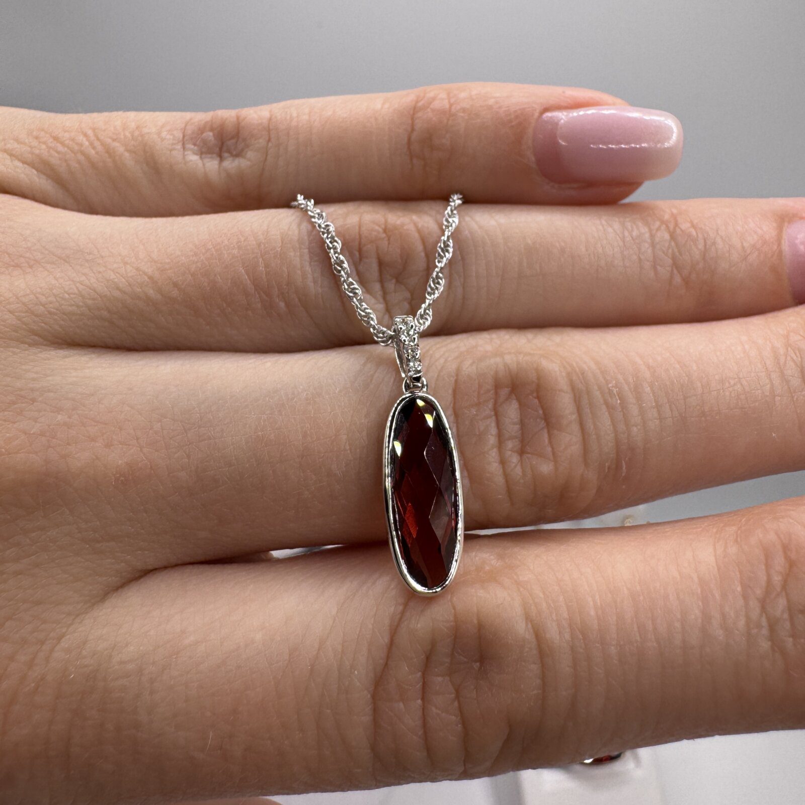This 18″ necklace showcases an elongated garnet accented by sparkling diamonds, set in 14K yellow gold — a refined blend of rich color and timeless brilliance.