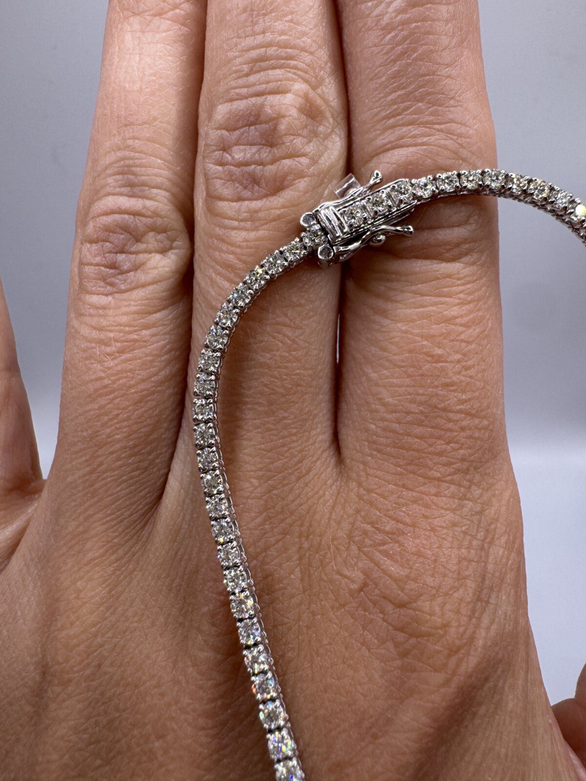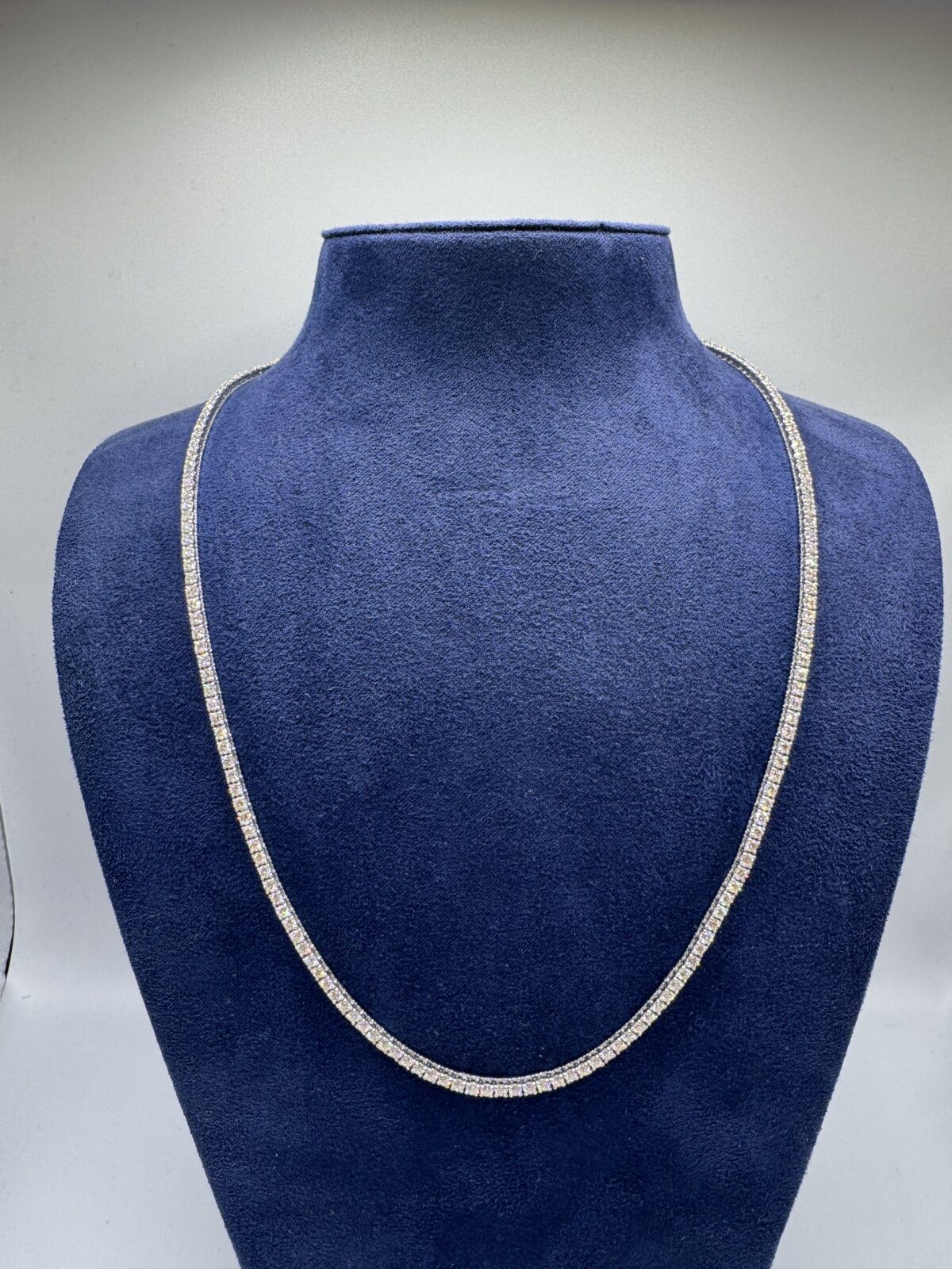 This 5.48 CT diamond tennis necklace in 14K white gold exudes timeless elegance. Measuring 18 inches, it features a continuous row of brilliant diamonds for a classic and luxurious look.