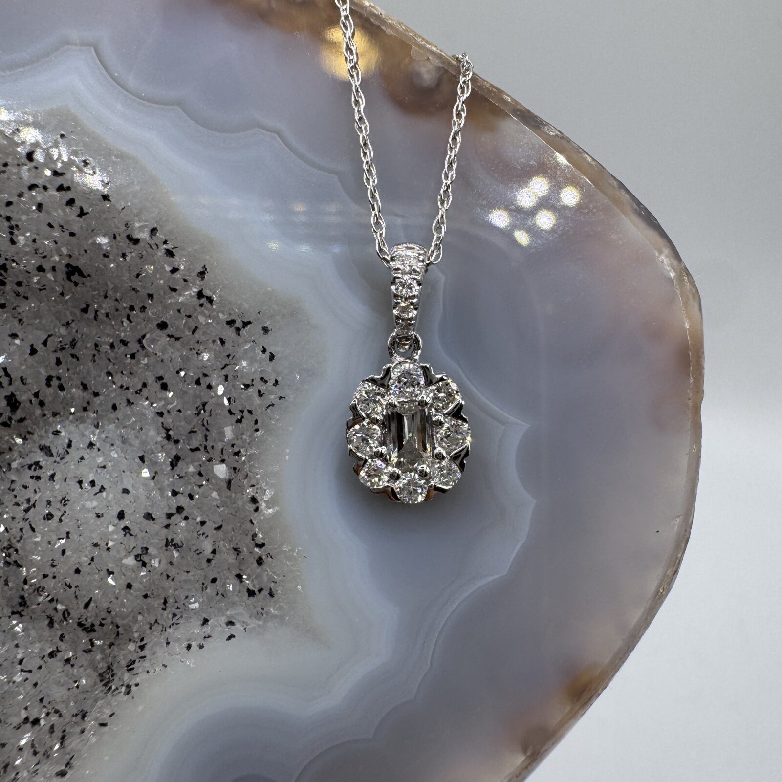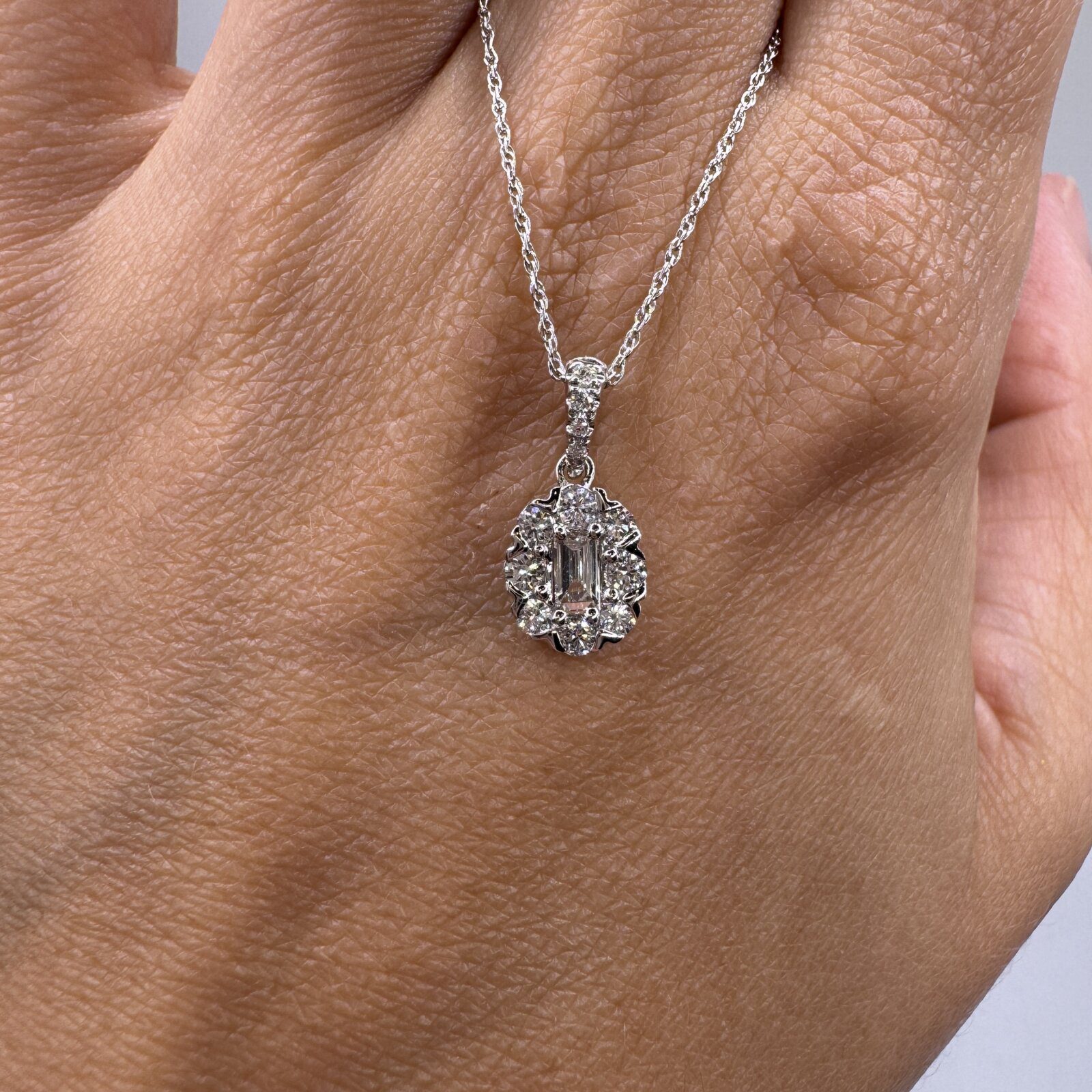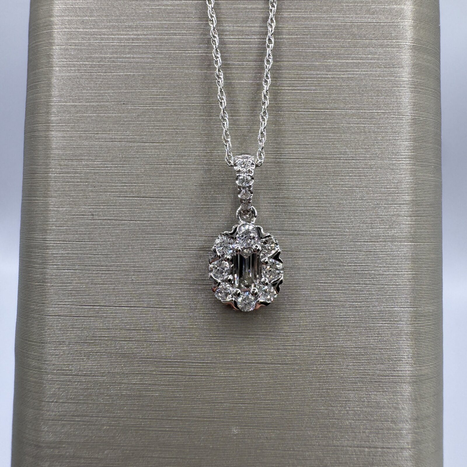 Delicate and graceful, this diamond necklace showcases a floral-inspired silhouette with a captivating emerald-cut diamond at the center. Surrounded by shimmering round brilliant diamonds and set in radiant 18K white gold, it adds timeless elegance to any look.