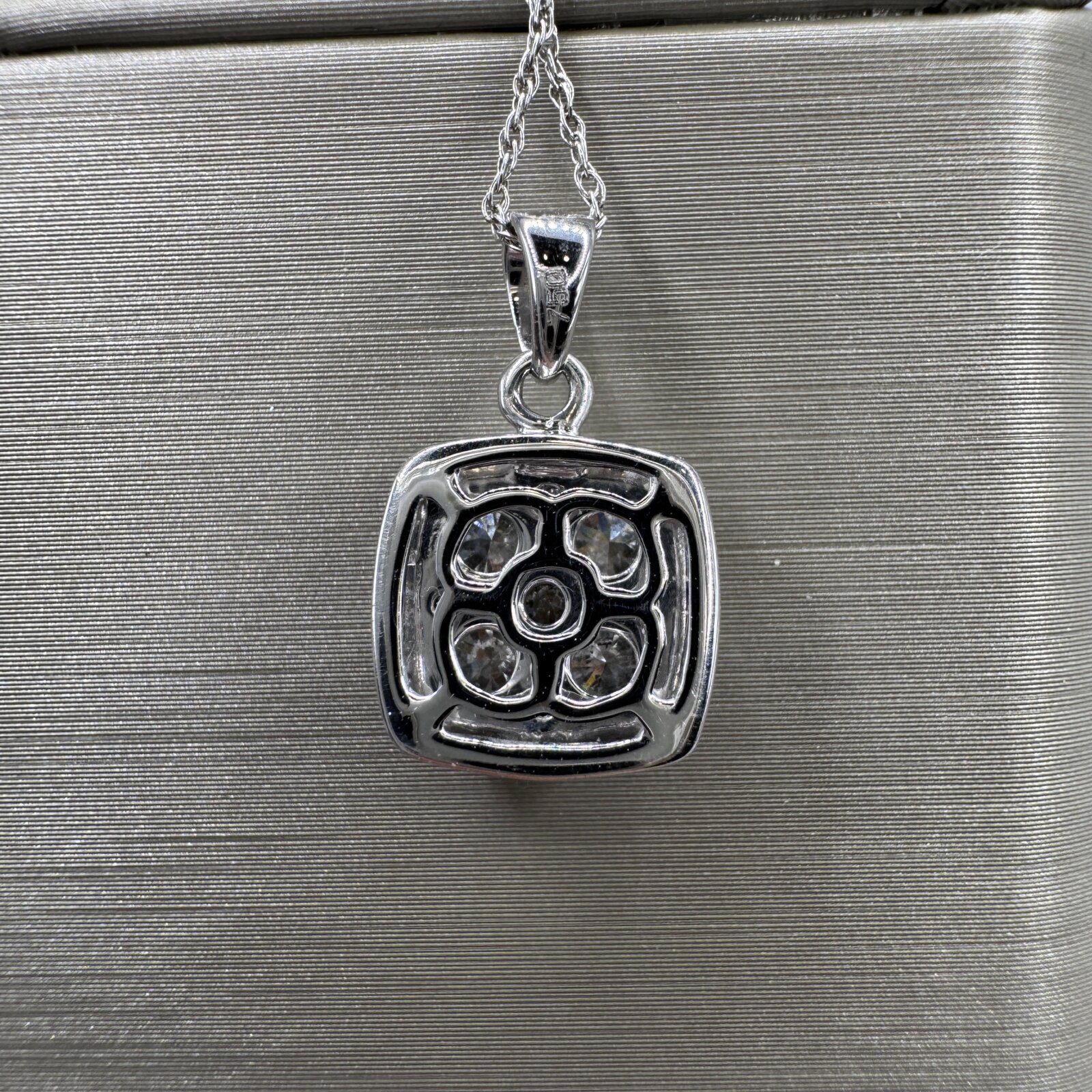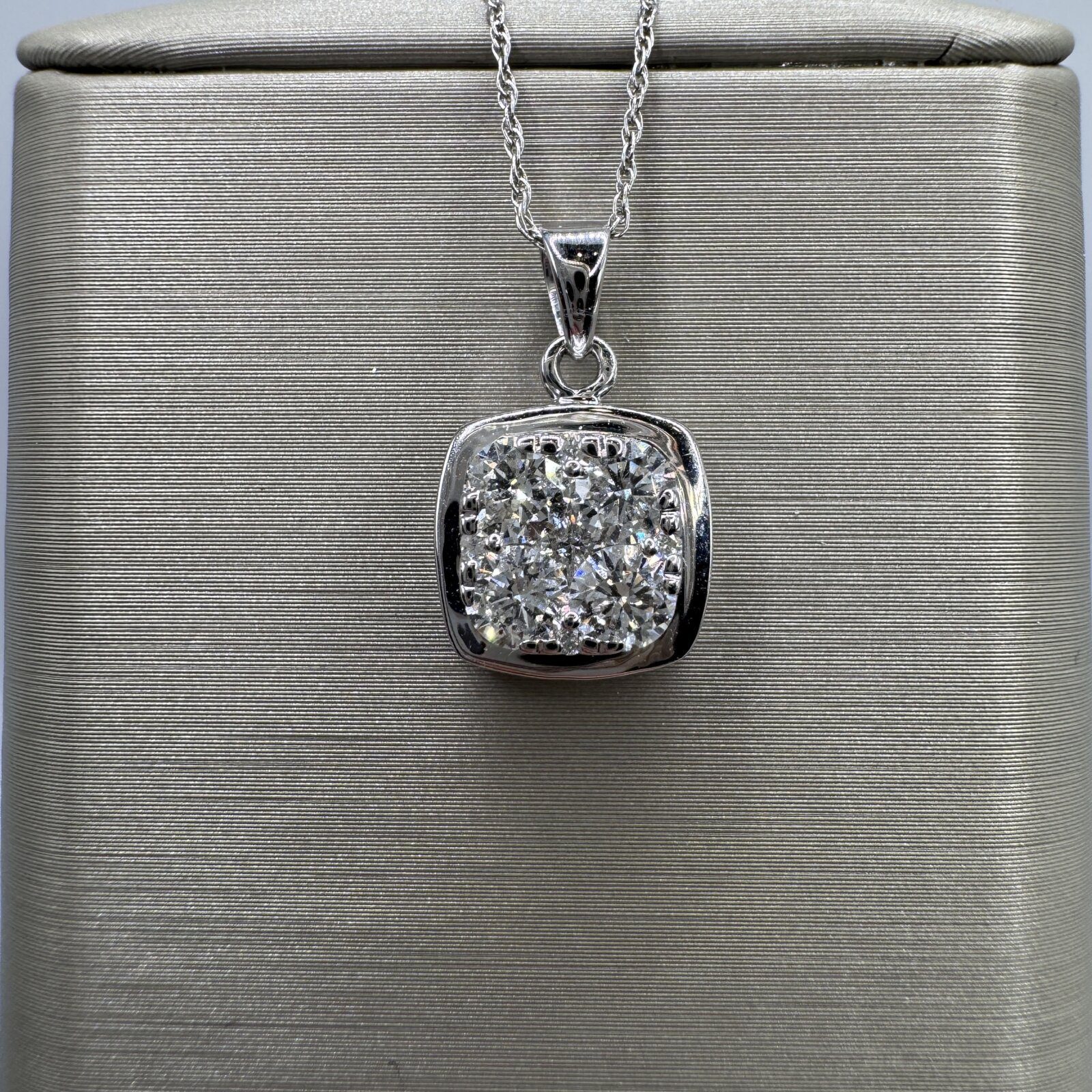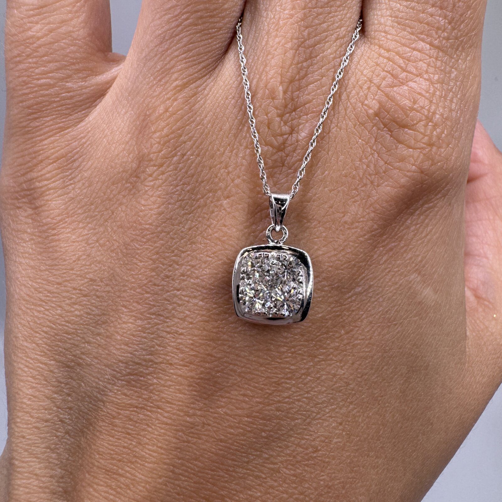 A modern classic — this 18K white gold diamond necklace (3.12g) features a geometric square design set with four brilliant round diamonds totaling 0.75 ct tw. Clean lines and elegant sparkle make it a timeless piece for everyday luxury.