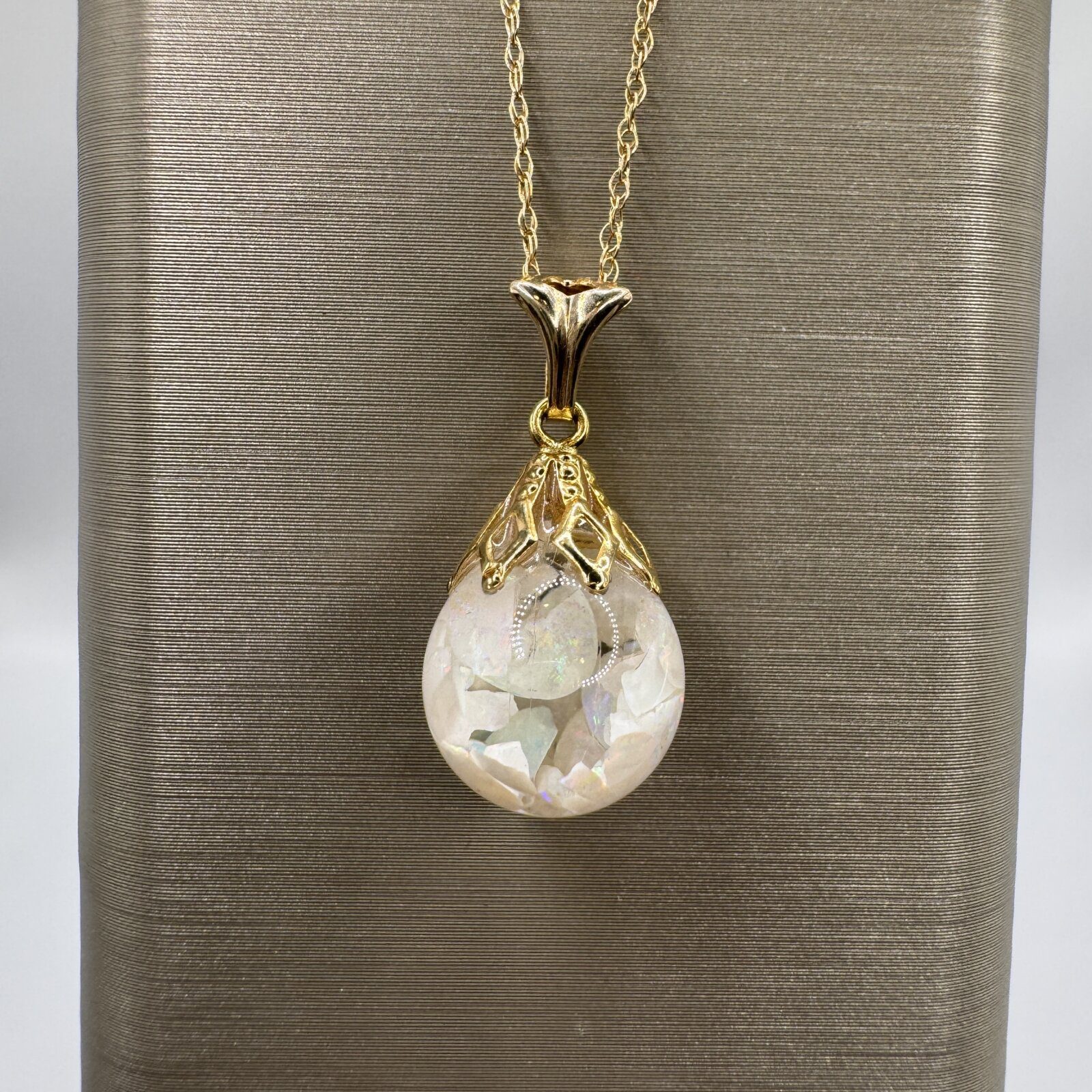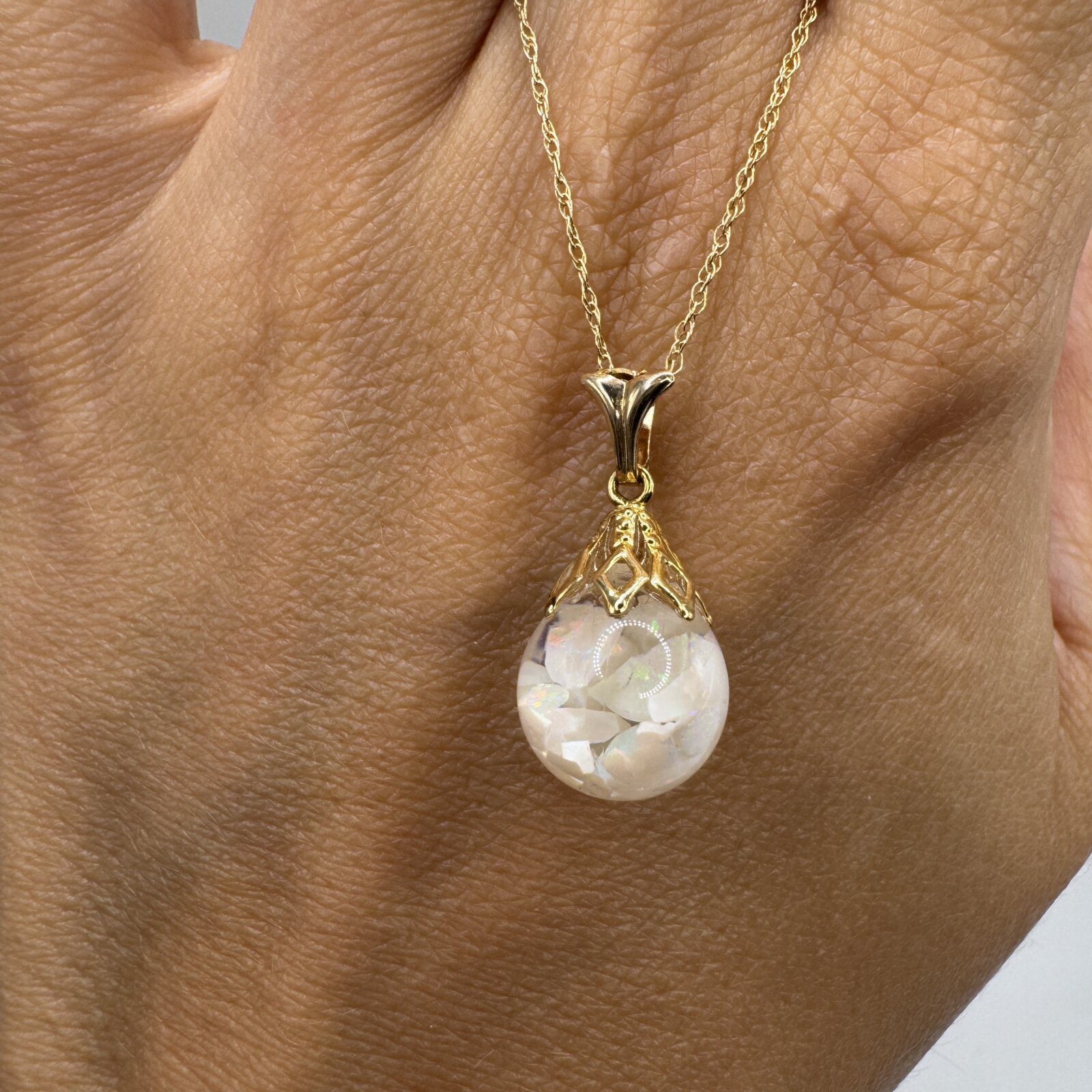 This 14K yellow gold necklace features a 10mm floating opal glass bead on an 18″ chain — a luminous touch of color with minimalist charm.