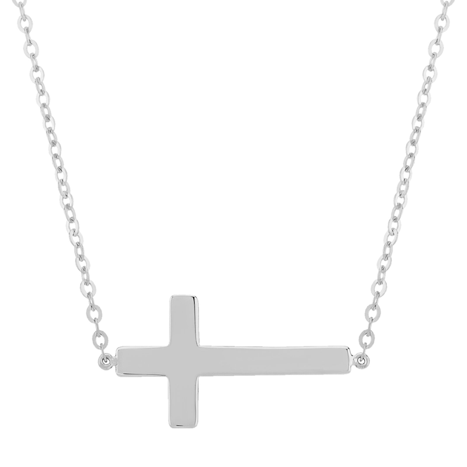 This elegant sideways cross necklace is crafted in sterling silver and offers a modern twist on a classic symbol of faith. The polished cross sits horizontally on an 18-inch chain, secured with a lobster claw clasp for durability and comfort. A timeless design that layers beautifully with other necklaces or stands alone as a statement of simplicity.