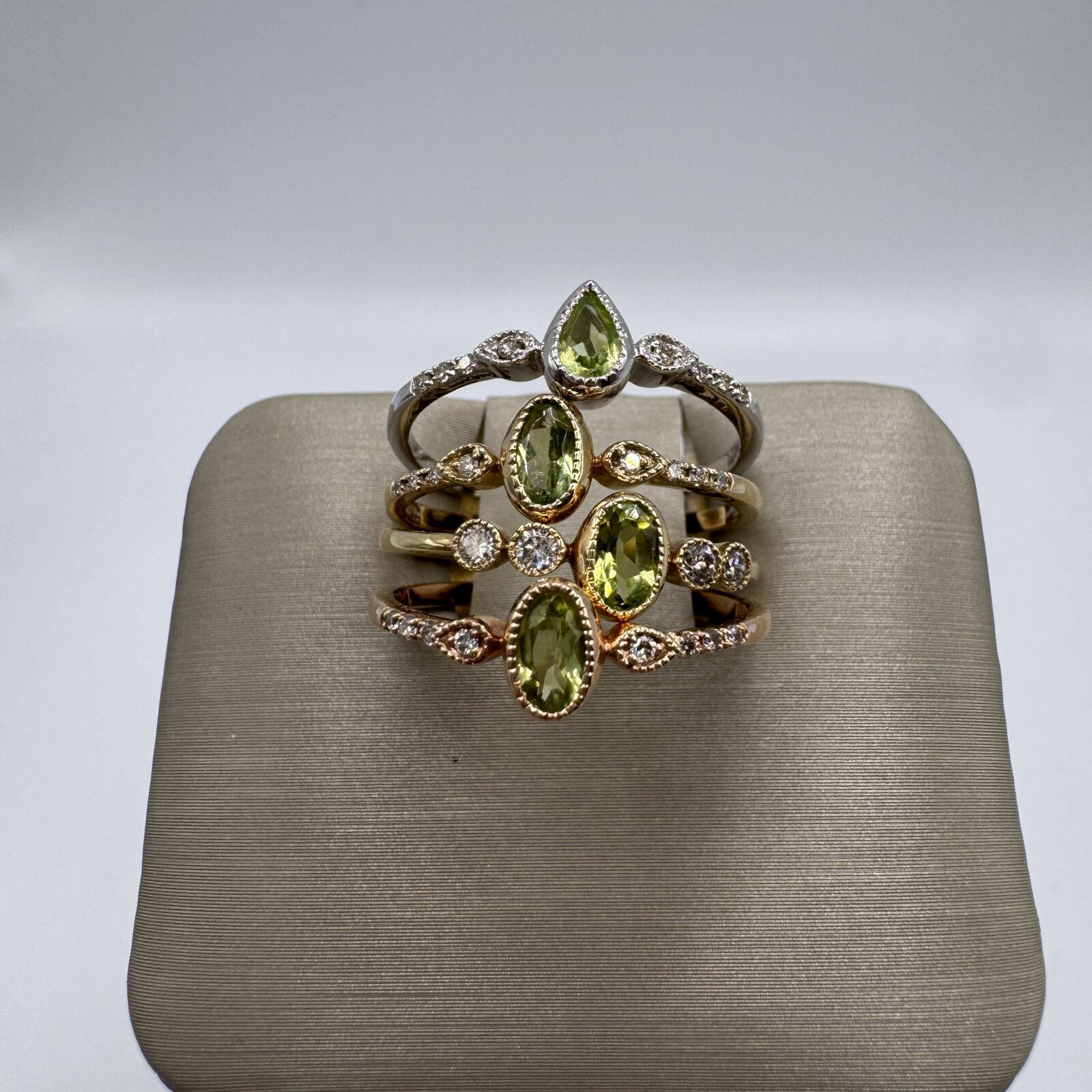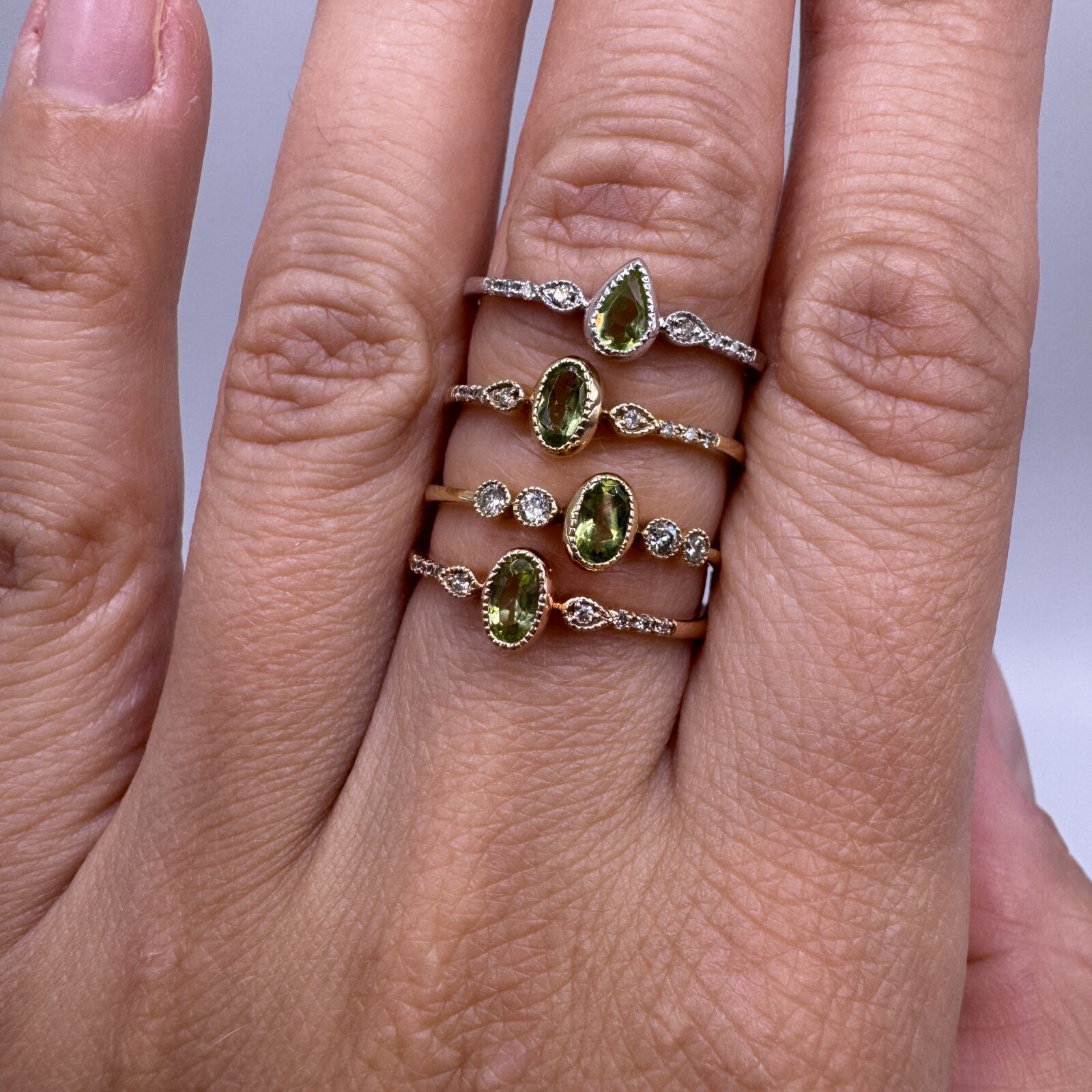 This 14K gold stackable ring features a vibrant peridot and sparkling diamond set in elegant bezels. Designed for versatility, it can be worn alone or stacked with other rings for a personalized look.