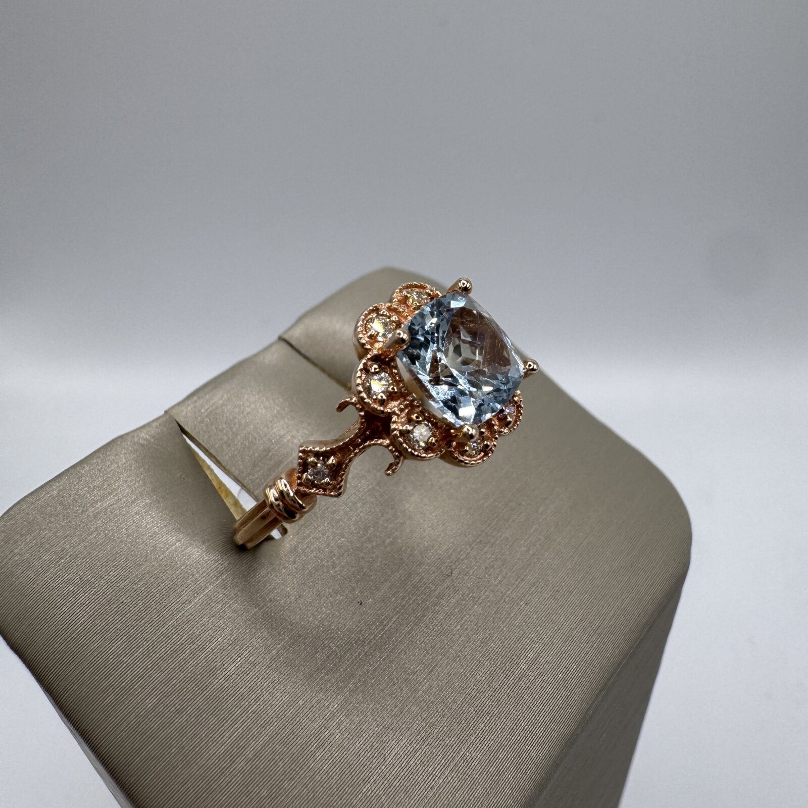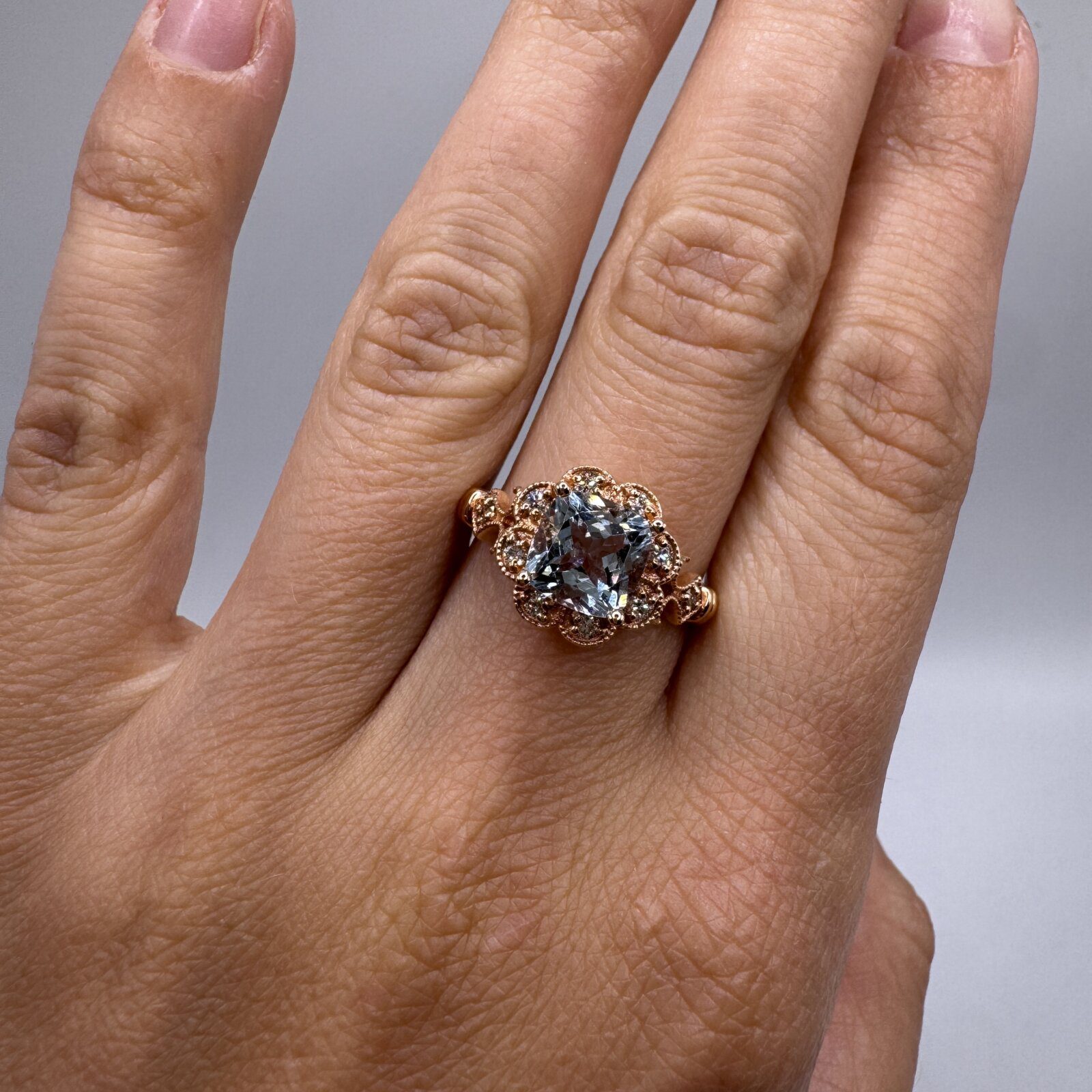 Be the first to review “14K Rose Gold Cushion Cut Aquamarine Halo 1.47ct and Dia 0.20ct Ring 7”