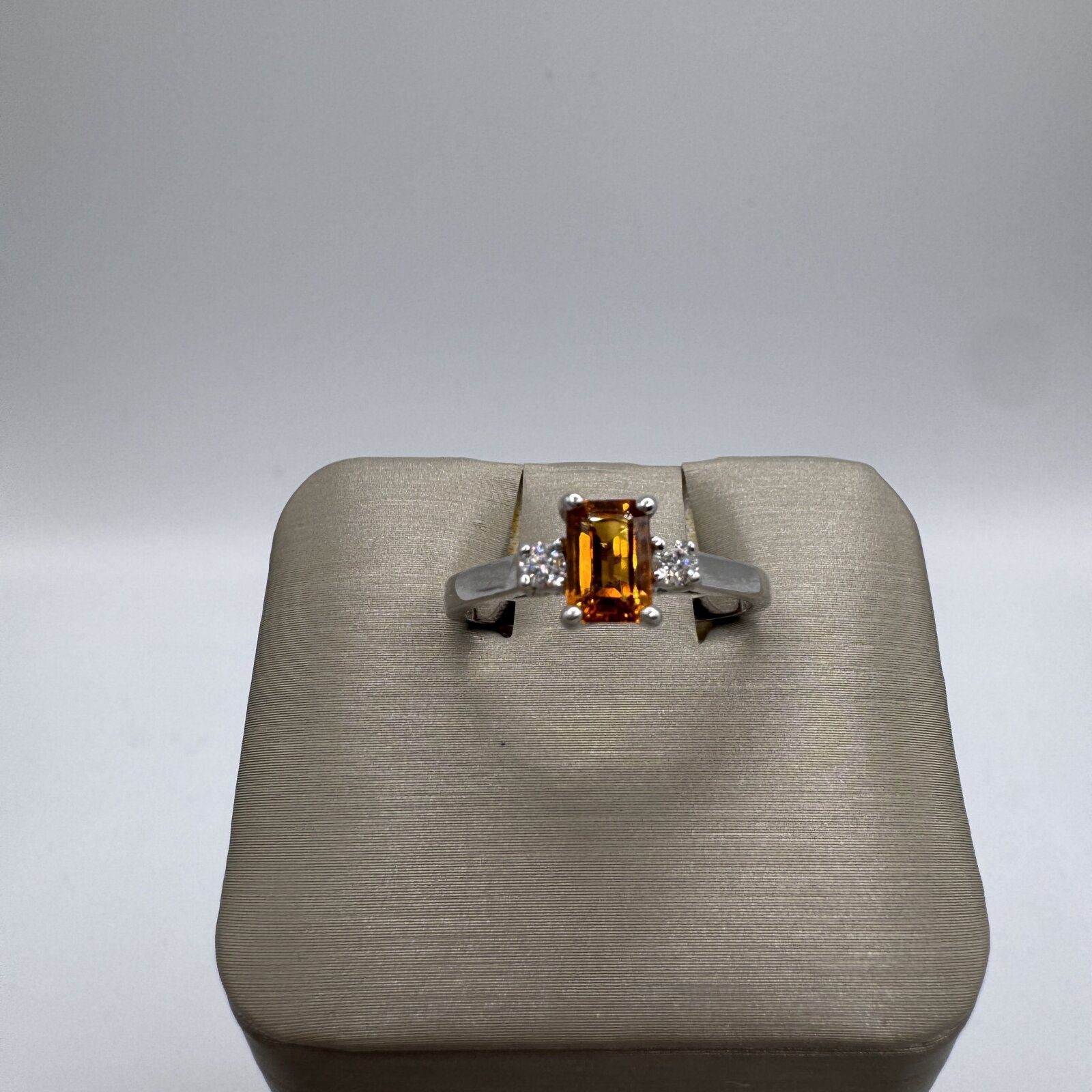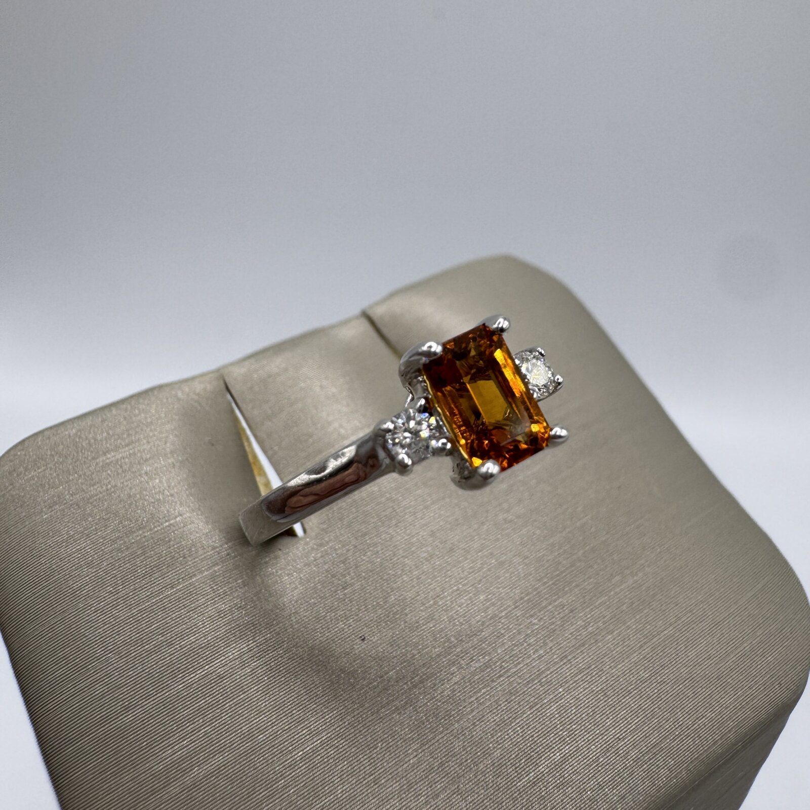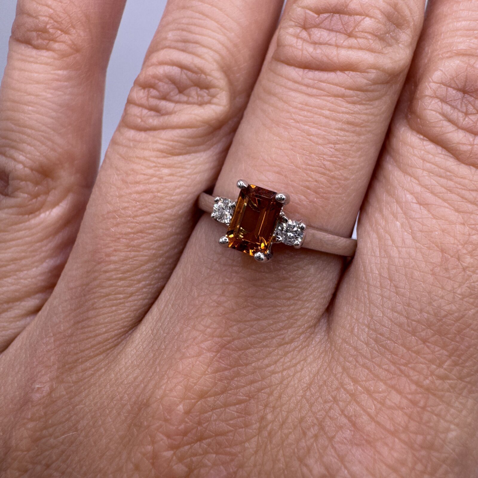 This 14K white gold ring (size 7) features a 0.38 ct emerald-cut citrine accented by 0.10 ct of diamonds — a sleek, radiant piece with timeless golden warmth.