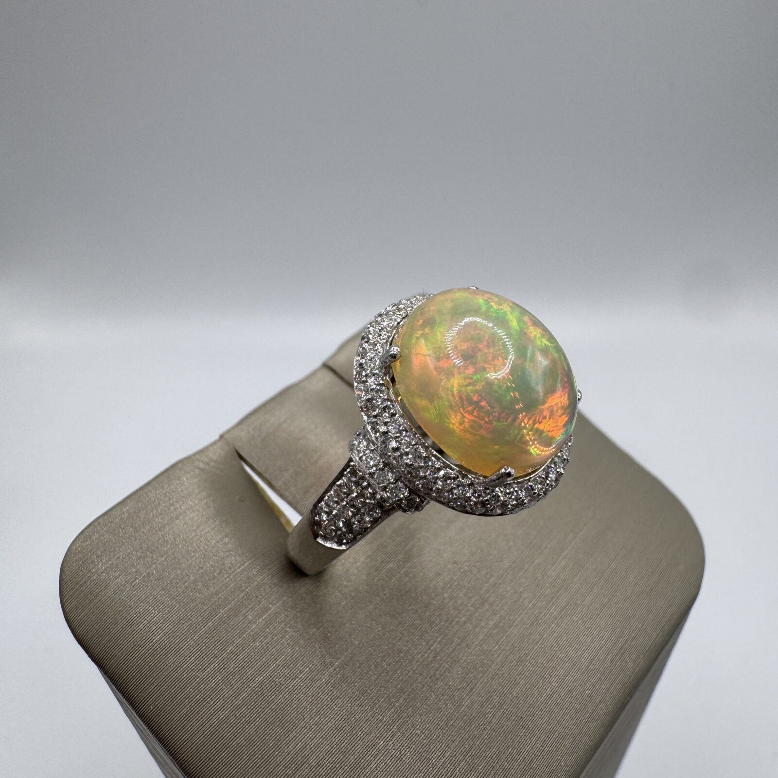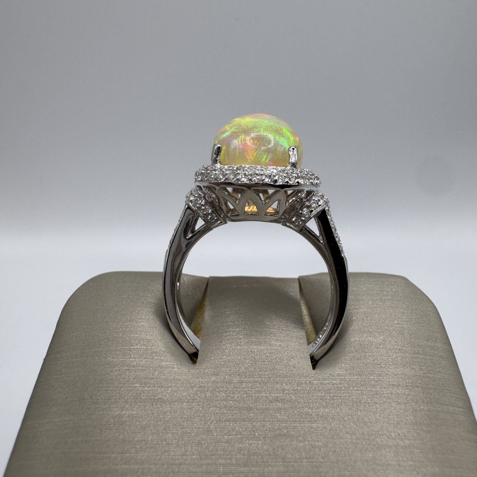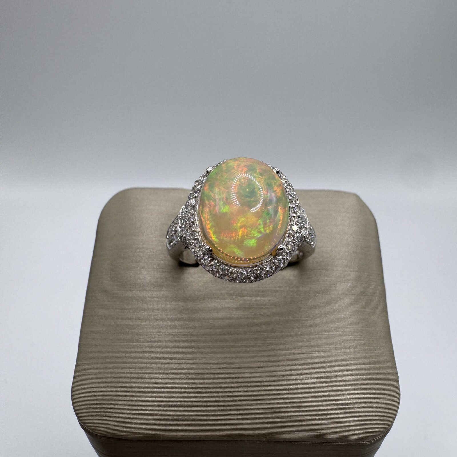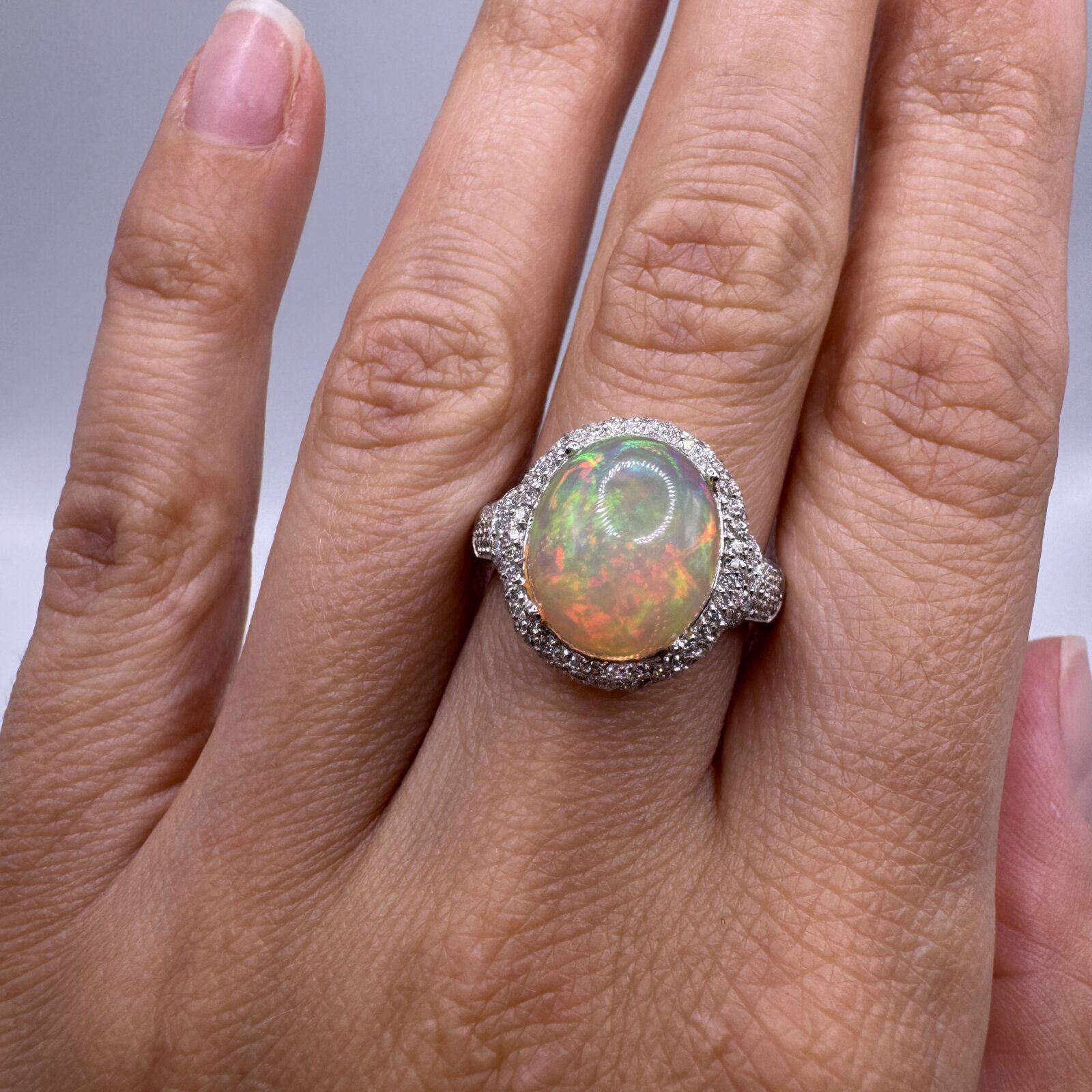 Crafted in 14K white gold, this ring (size 7) showcases a luminous 2.24 ct Ethiopian opal surrounded by 0.56 ct of sparkling diamonds — a captivating blend of color, light, and elegance.