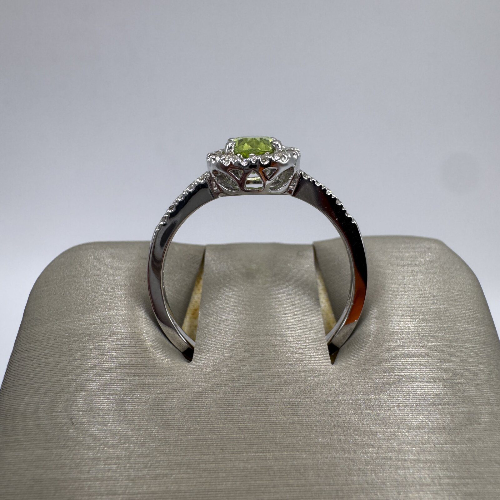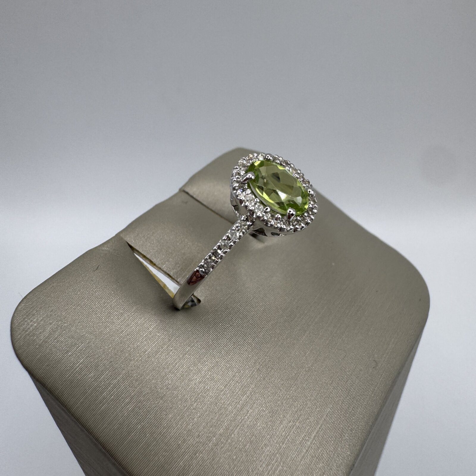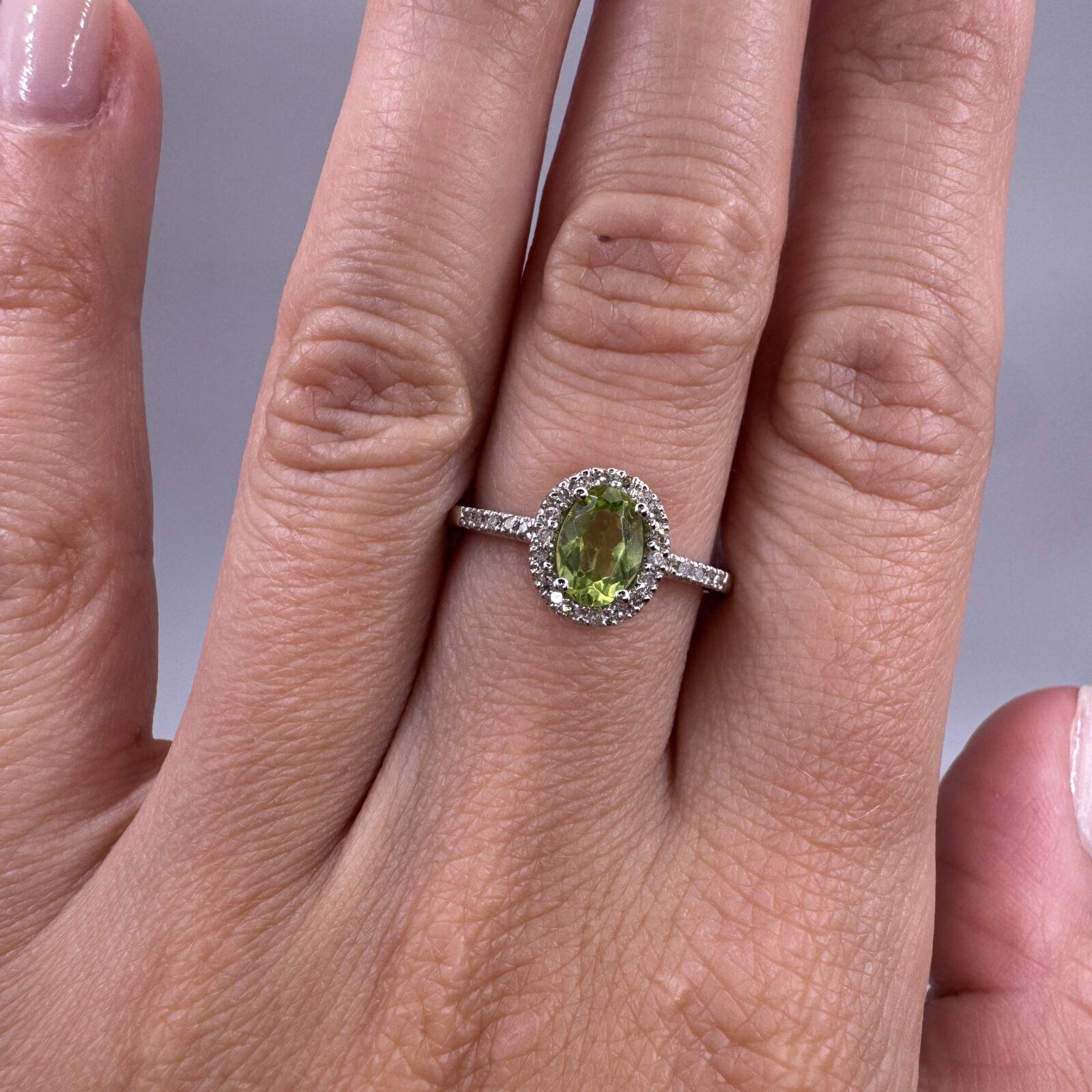 This 14K white gold ring showcases a 0.76 ct oval-cut peridot accented by 0.13 ct of sparkling diamonds — a graceful blend of color and brilliance.
