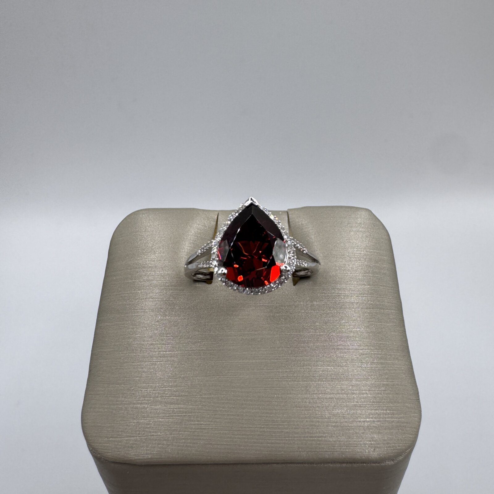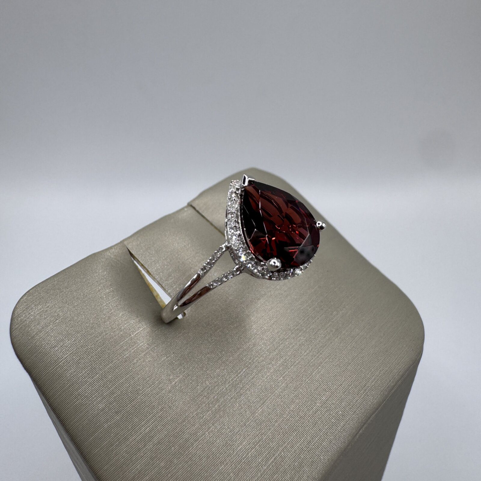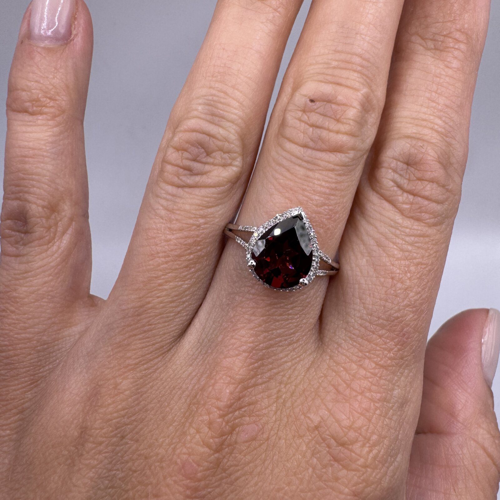 This elegant 14K white gold ring showcases a deep red 2.66-carat pear-cut garnet, exuding rich, dramatic color. The garnet is accented by 0.11 carats of sparkling diamonds in a delicate halo and along the split shank, adding brilliance and refinement. Perfect in size 6.5, this piece blends timeless sophistication with a bold pop of color.