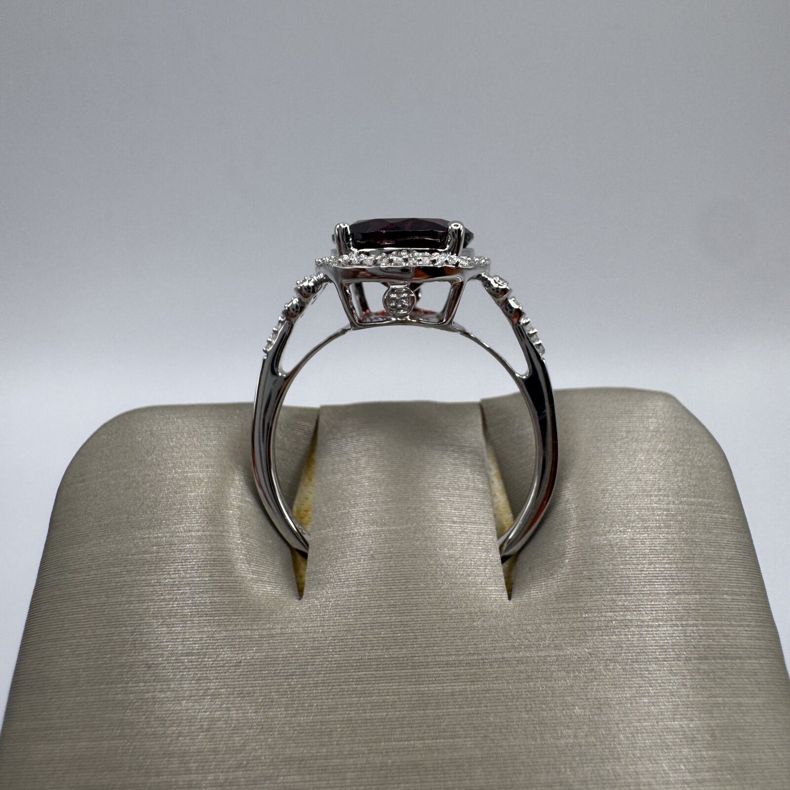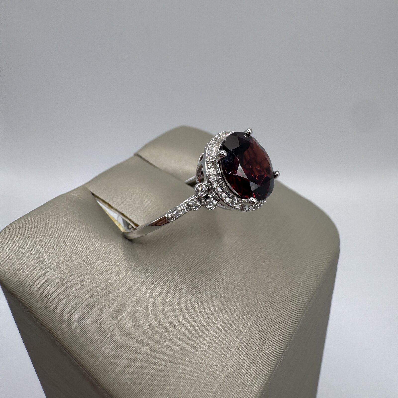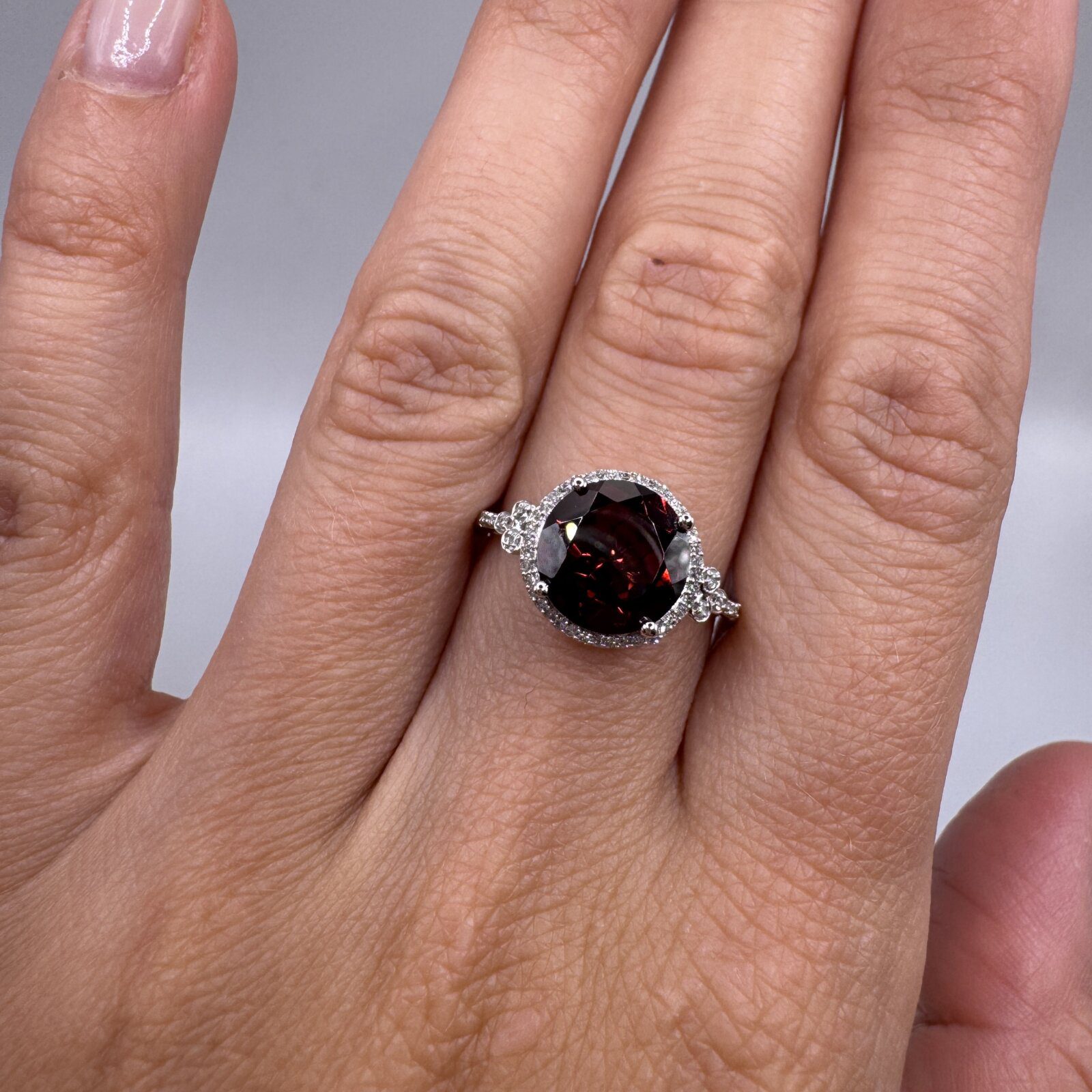 Set in 14K white gold, this ring features a bold 3.07 ct round-cut garnet accented by 0.11 ct of shimmering diamonds — a striking piece of refined elegance.