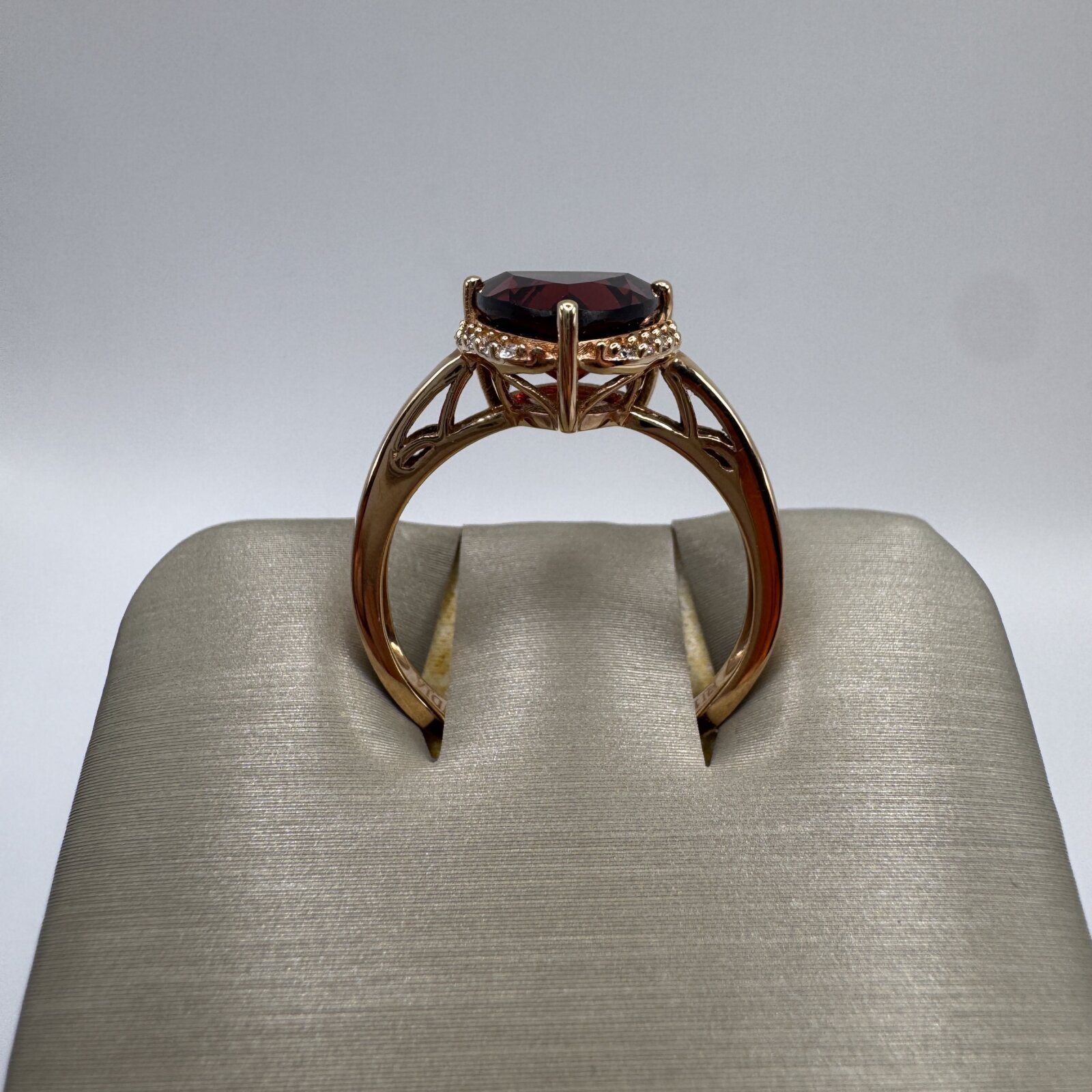 Crafted in 18K rose gold, this ring features a vivid 2.66 ct garnet accented by 0.07 ct of diamonds — a warm, romantic piece with timeless charm.