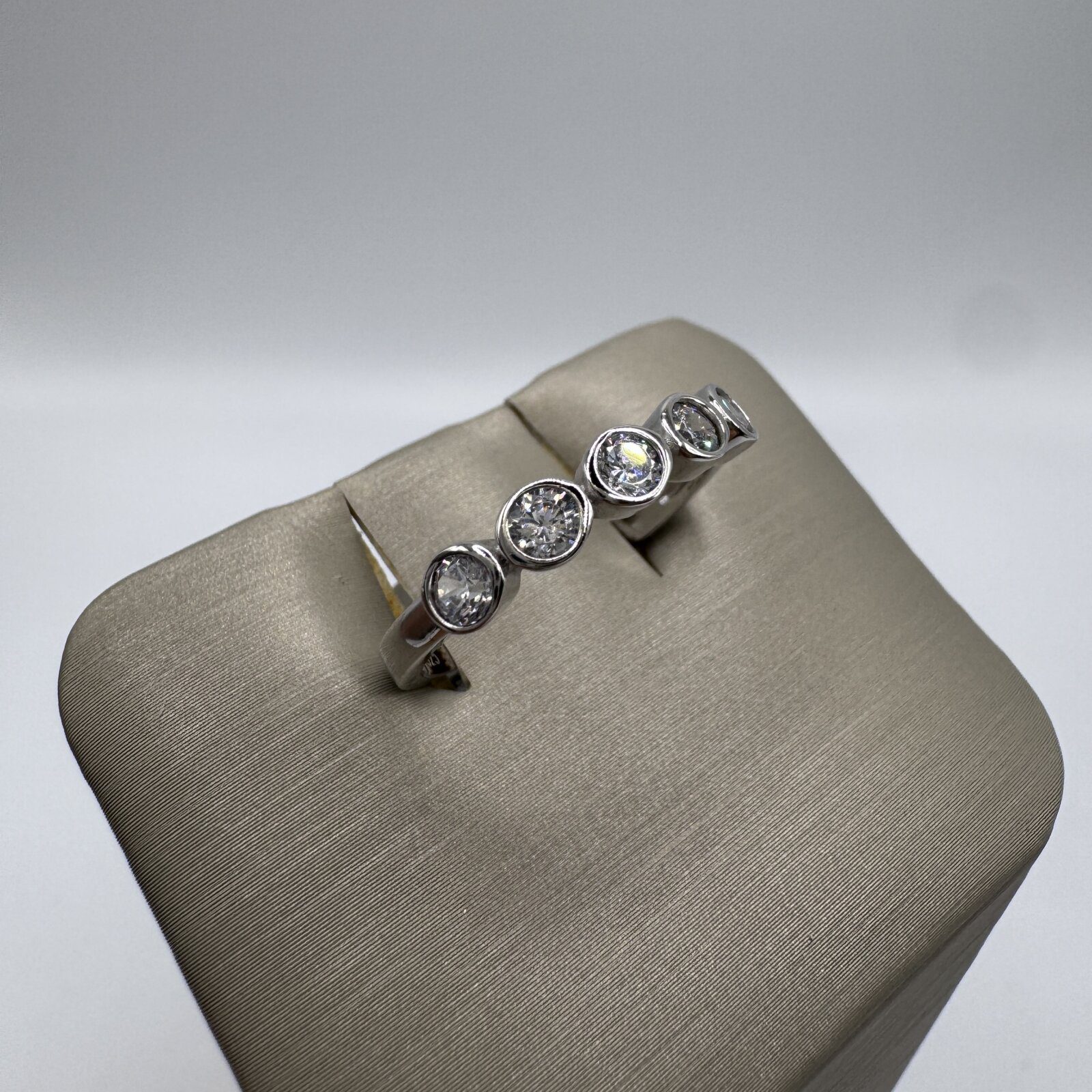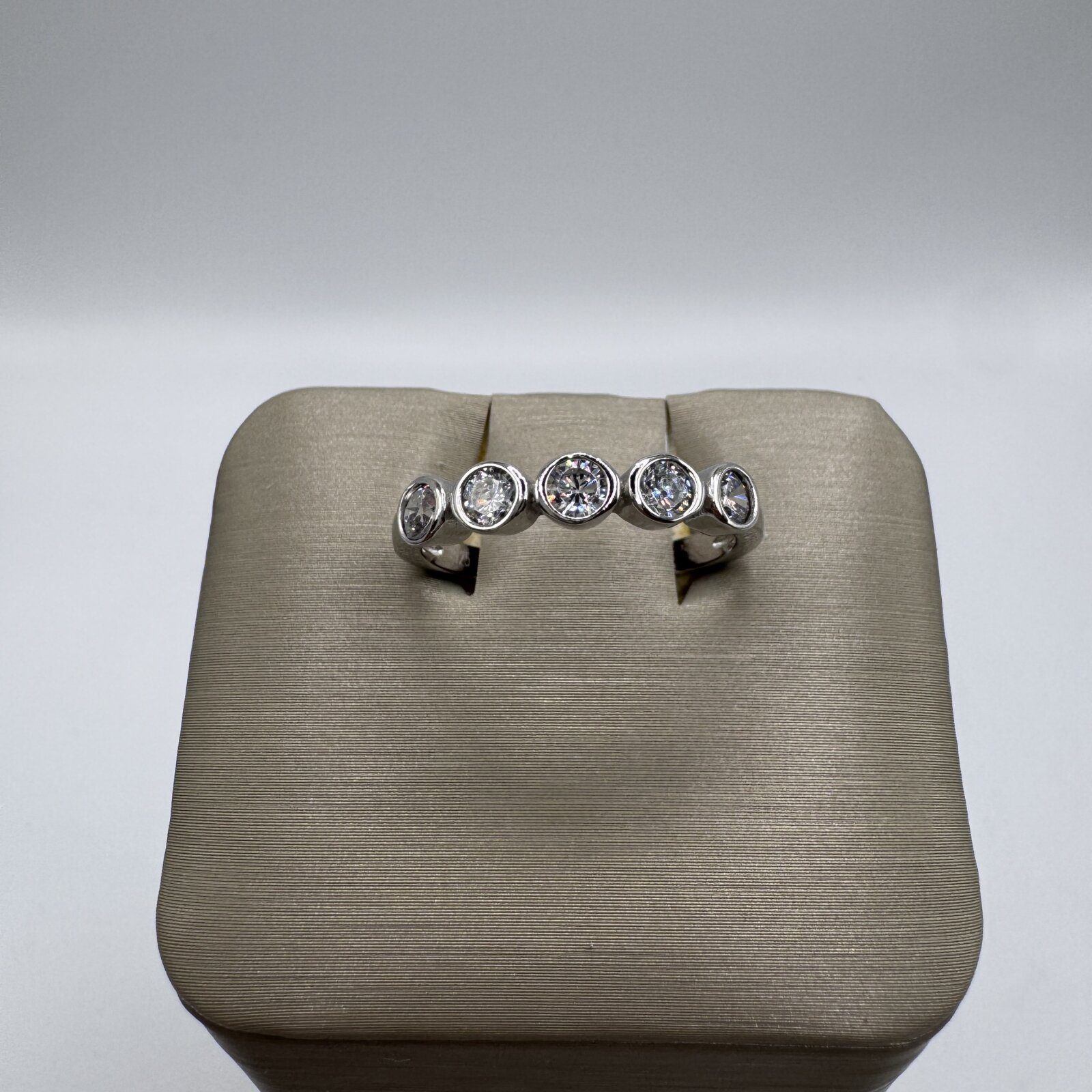 This sleek sterling silver band rhodium plated ring features five round white cubic zirconia stones, each securely set in a modern bezel setting. The symmetrical design creates a continuous line of brilliance, offering both elegance and everyday versatility. Perfect for stacking or wearing solo, this size 7 ring adds a refined sparkle to any look.
