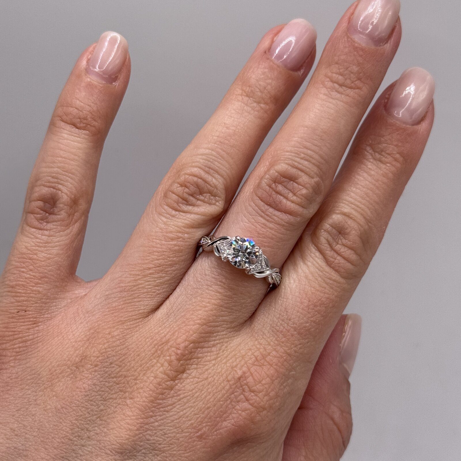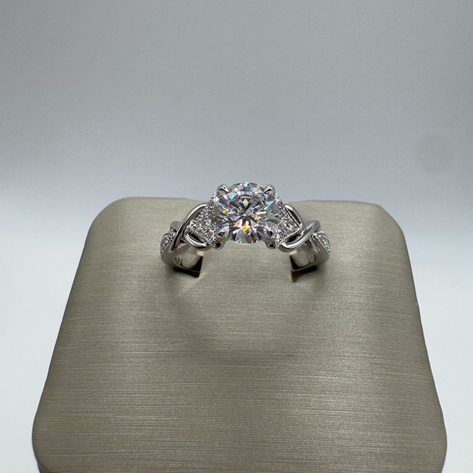 Crafted in 18K gold, this elegant engagement ring accented with sparkling diamonds totaling 0.14 carats and features a 1.0 carat cubic zirconia center stone flanked by two delicate infinity symbols. A meaningful design that celebrates everlasting love with timeless style.
