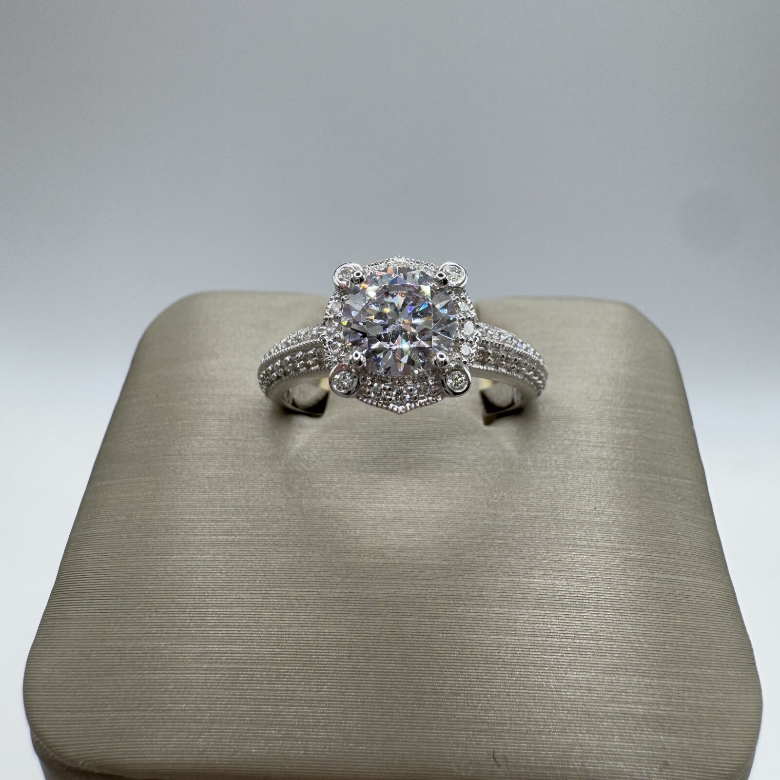 Timeless and radiant, this engagement ring is crafted in 18K white gold and features a brilliant 1.0 carat cubic zirconia center stone, elegantly surrounded by a shimmering diamond halo. Accented with 0.25 carats of sparkling diamonds, this design offers classic beauty with a touch of modern sophistication.