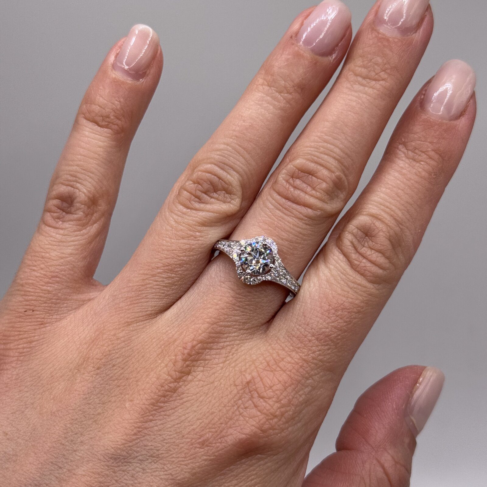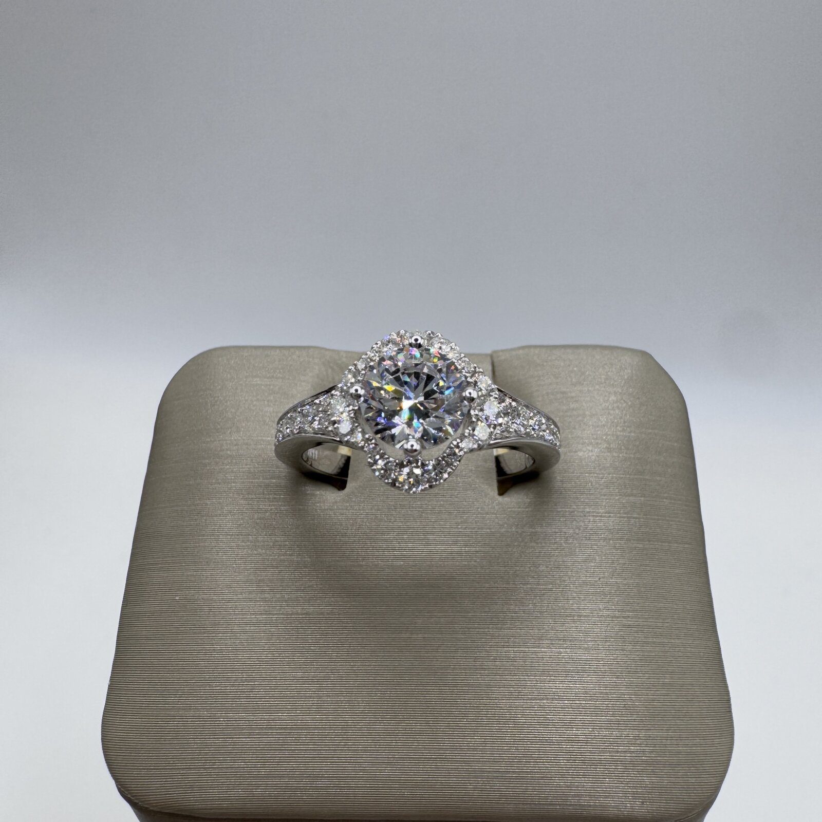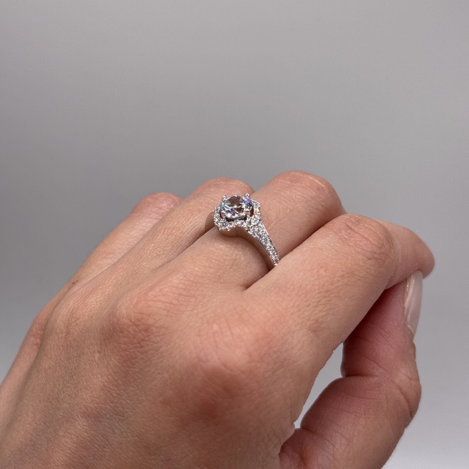 This stunning engagement ring is crafted in 18K white gold and adorned with 0.41 carats of shimmering diamonds along the band. At its heart lies a brilliant 1.0 carat cubic zirconia center stone, offering the look of luxury with timeless elegance.