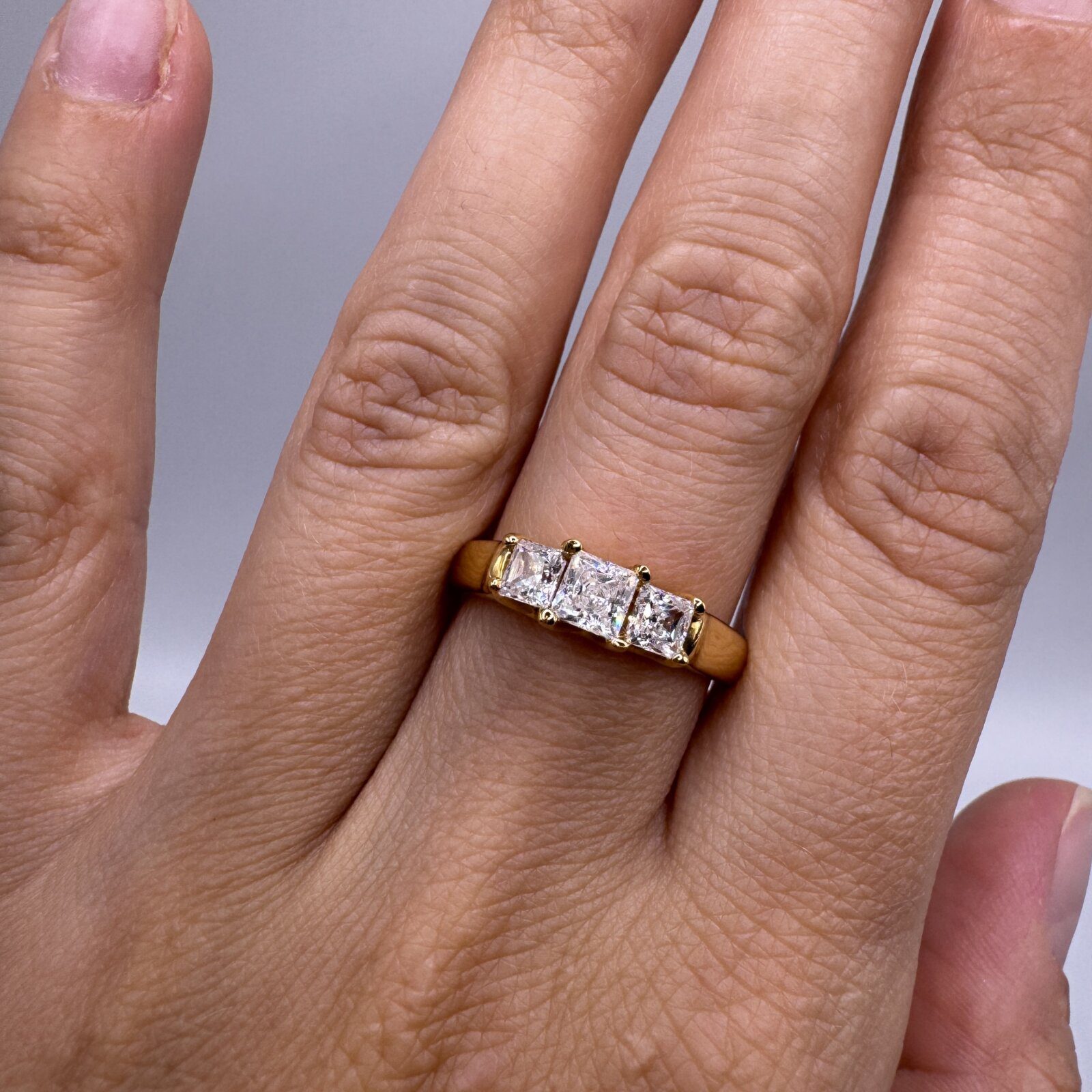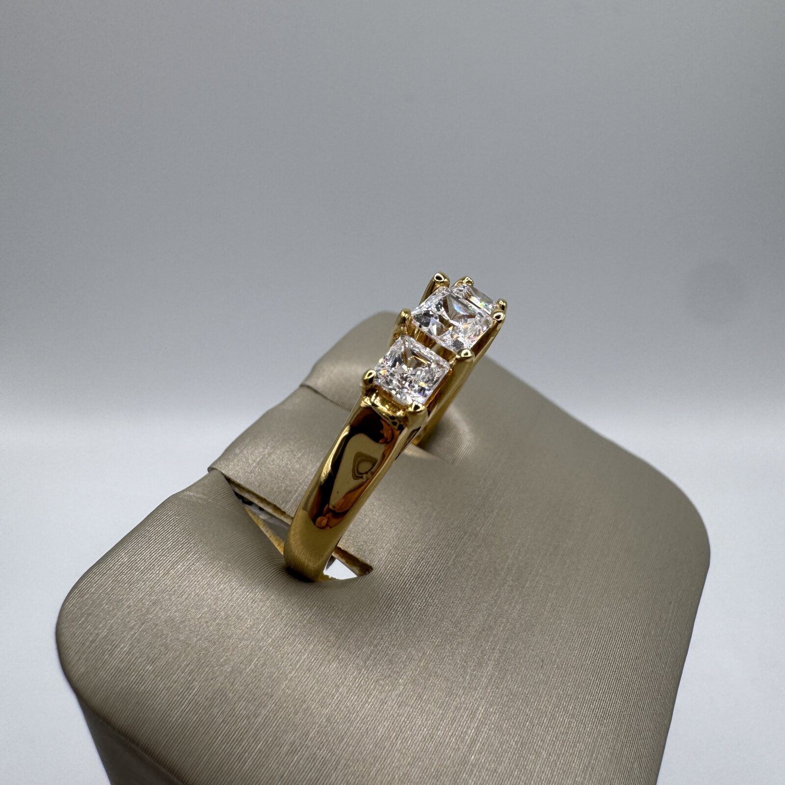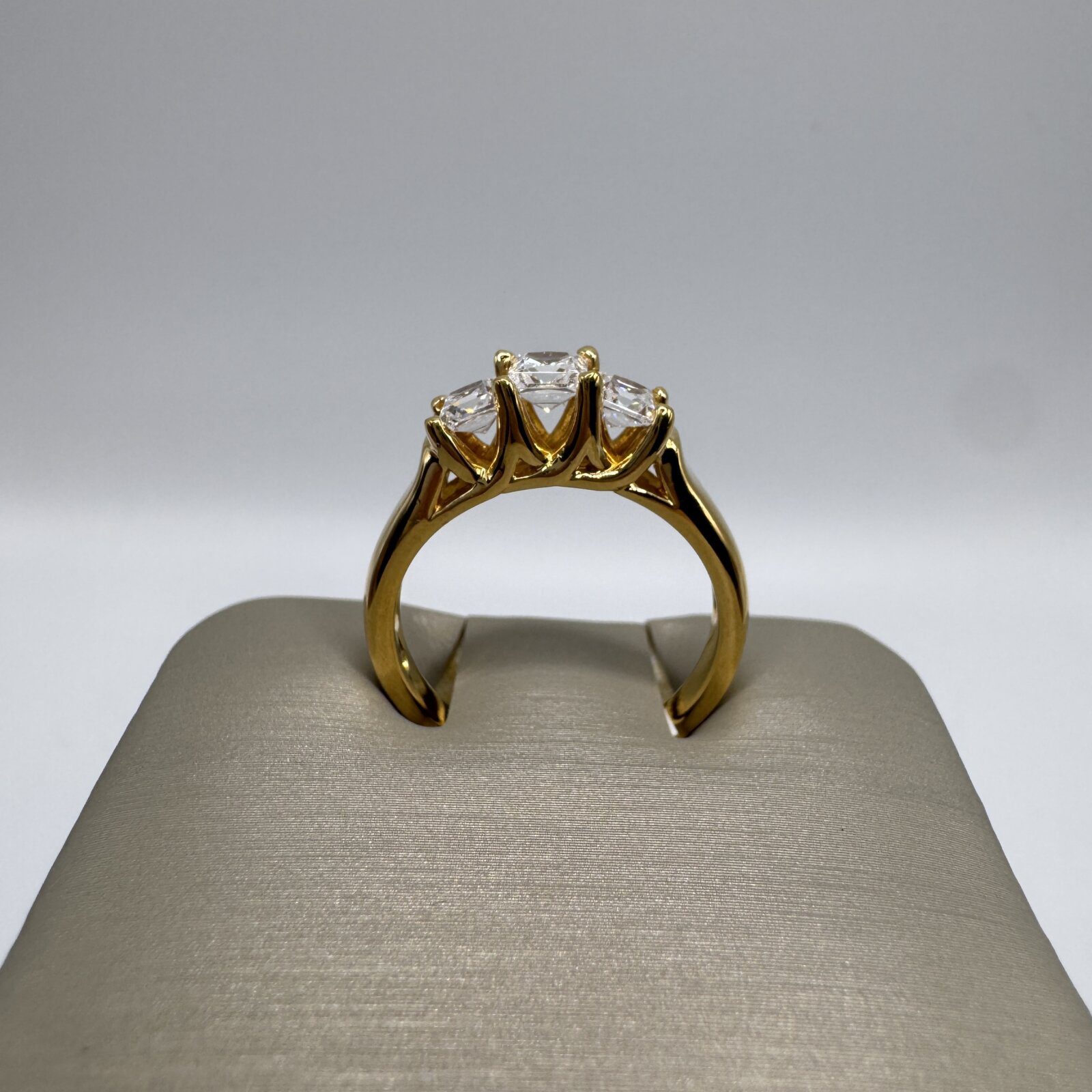 This sterling silver ring, plated in 14K yellow gold, features a classic three-stone design with dazzling princess-cut cubic zirconia. The center stone is slightly larger, flanked by two equally brilliant side stones, all secured in polished prong settings. Perfect in size 7, this timeless piece symbolizes past, present, and future, making it a meaningful and elegant choice for any occasion.