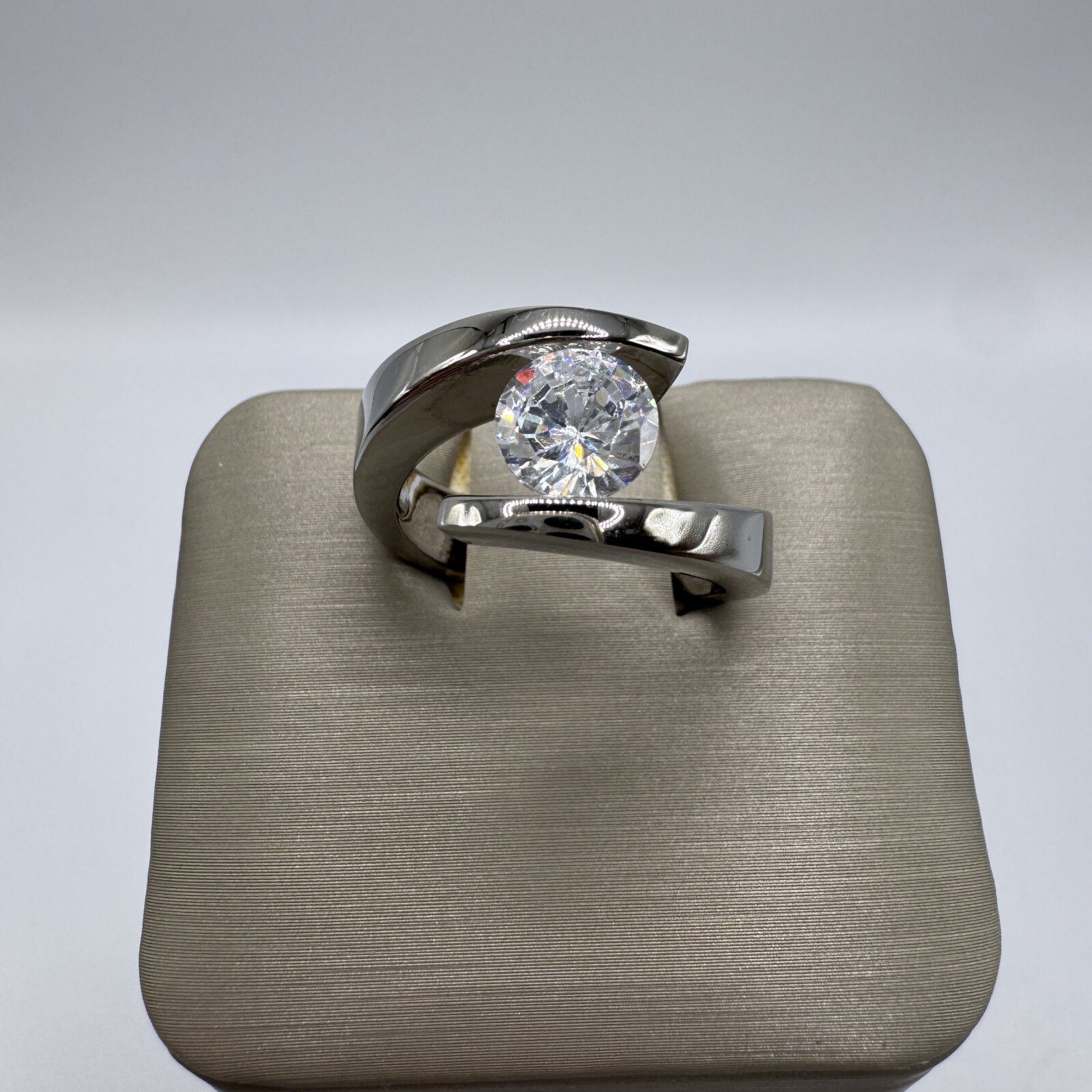 This bold titanium ring showcases a brilliant 2-carat round simulated diamond, set in a sleek modern bypass design. The high-polish finish enhances the contemporary look, while the durable titanium ensures lasting strength and comfort. A striking statement piece, perfect for those who appreciate both style and resilience in their jewelry.