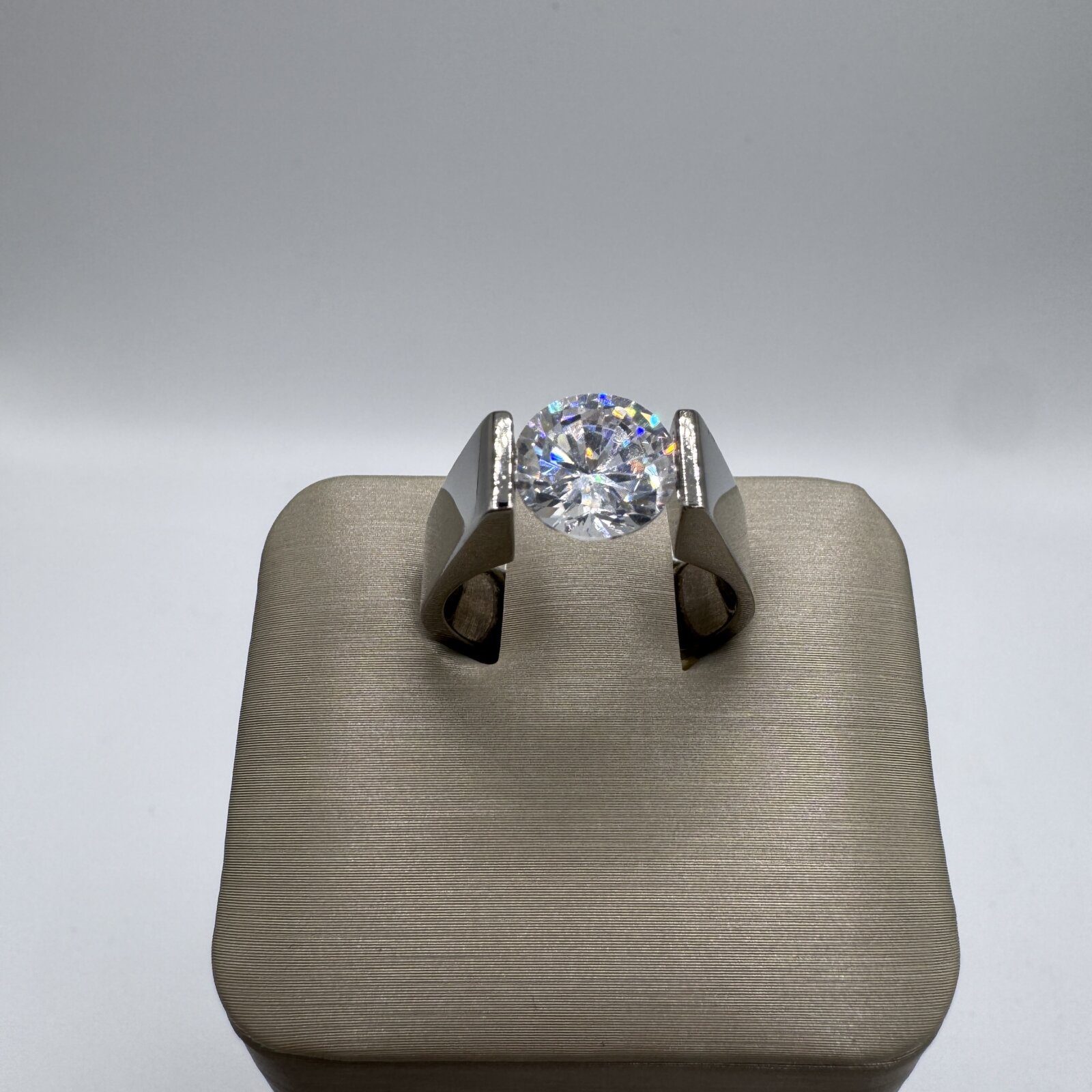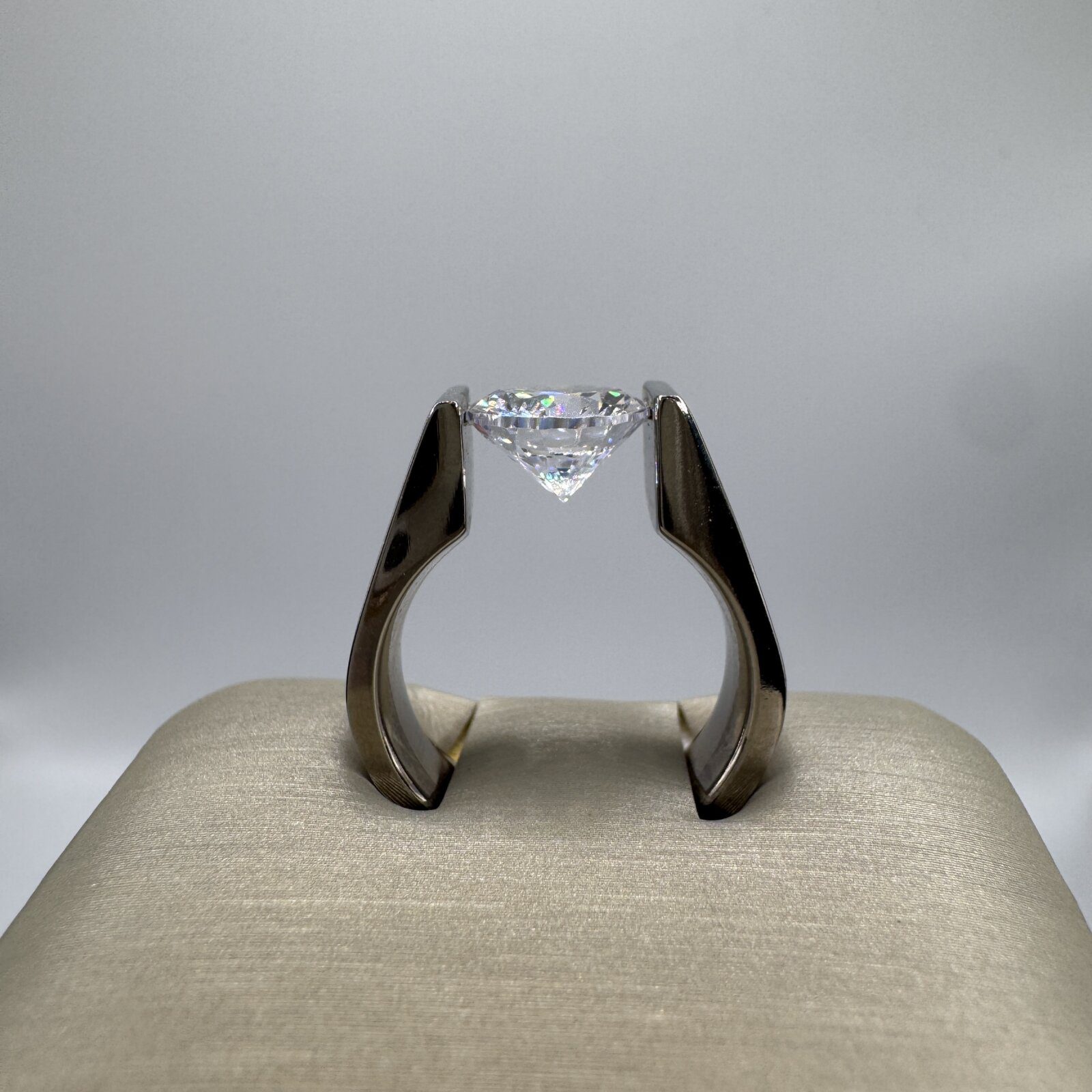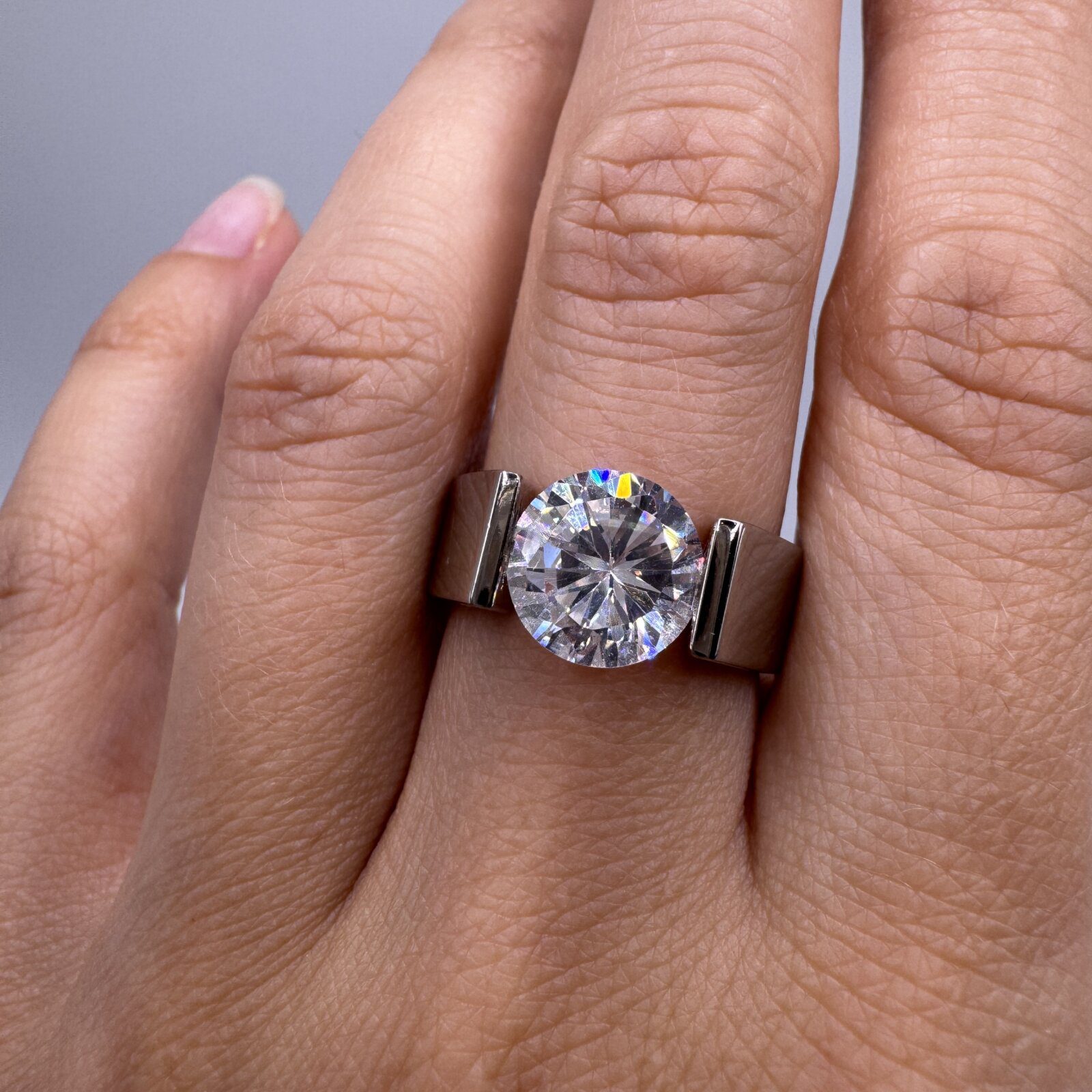 This bold titanium ring features a striking 3-carat round simulated diamond set in a contemporary tension-style design. The sleek, high-polish metal enhances the stone’s brilliance while providing exceptional durability and comfort. Perfect in size 6, this modern solitaire is an eye-catching statement piece that blends strength with sophisticated style.