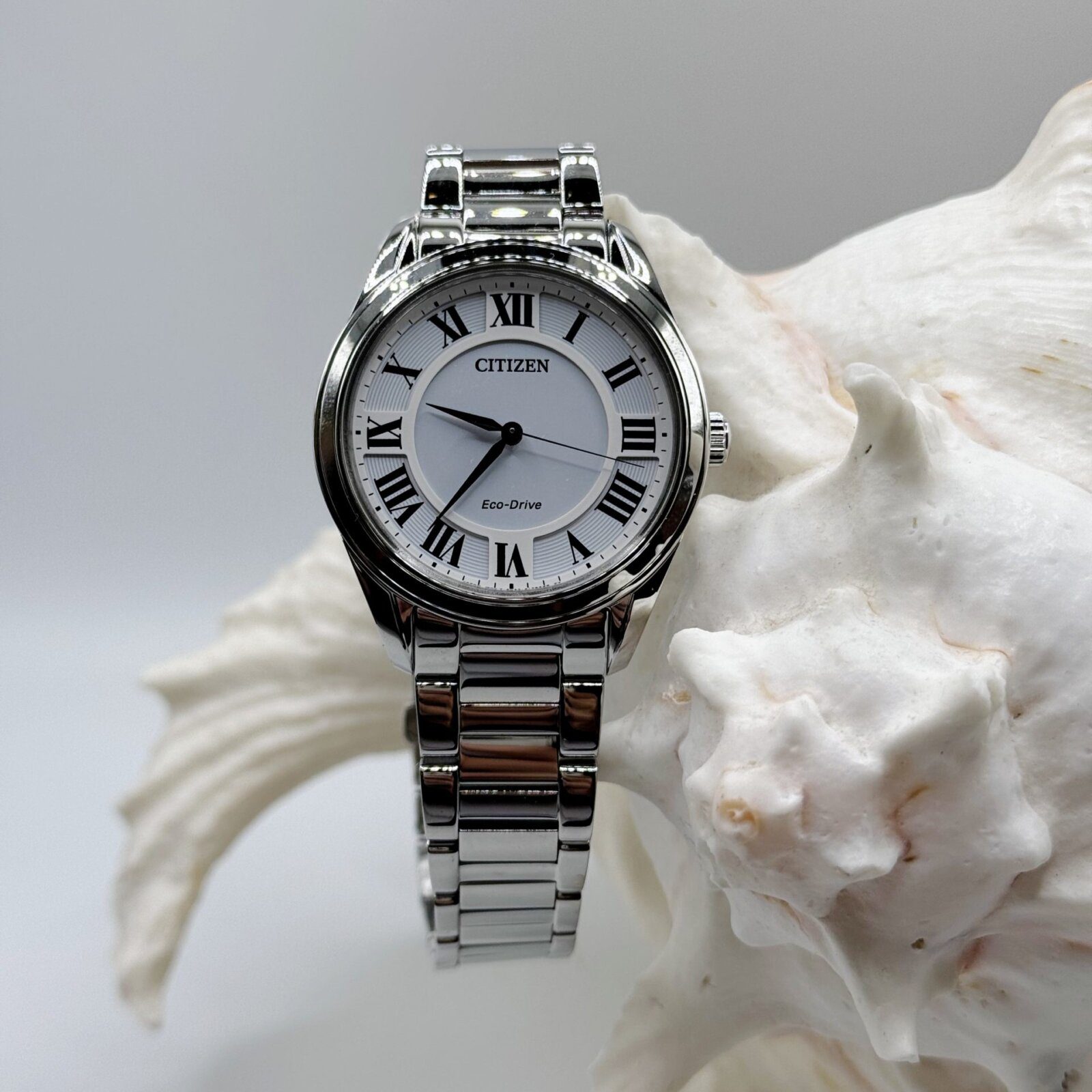 Make a statement wearing this sophisticated, classically styled Arezzo ladies’ watch by Citizen. This sleek watch with its white dial, silver stainless steel bracelet band with deployment clasp and bold Roman numeral markers stands out from the crowd while remaining understated. This is a modern twist on a classic design, featuring a genuine Sapphire crystal and Citizen’s Eco-Drive technology that sustainably powers itself by light. This women’s classic dress watch in stainless steel features three hands and a minimalist face, giving you a refined look and upscale feel. Never compromise with the bold and elegant line of Arezzo watches by Citizen.